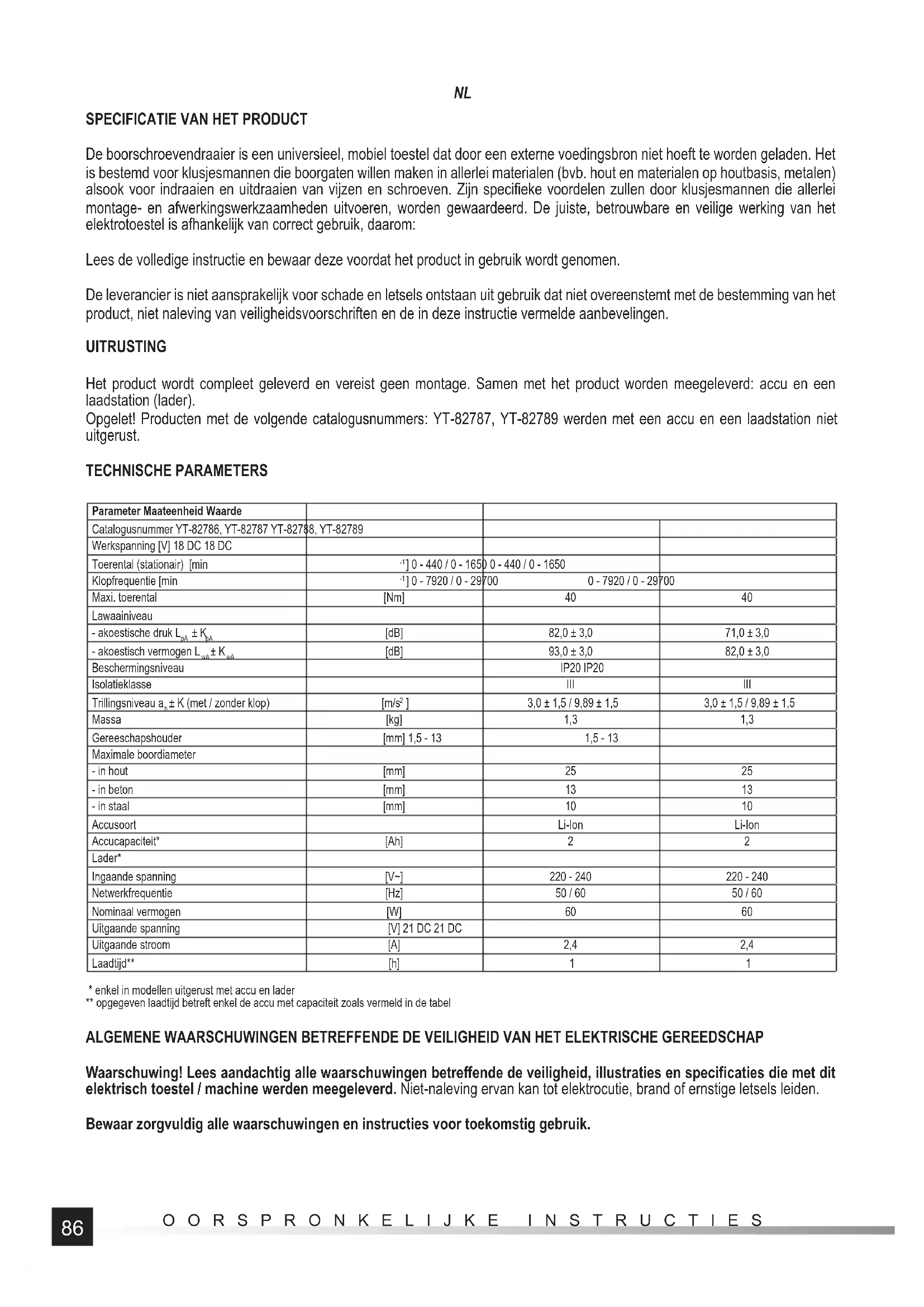 De boorschroevendraaier is een universieel, mobiel toestel dat door een externe voedingsbron niet hoeft te worden geladen. Het is bestemd voor klusjesmannen die boorgaten willen maken in allerlei materialen (bvb. hout en materialen op houtbasis, metalen) alsook voor indraaien en uitdraaien van vijzen en schroeven. Zijn specifi eke voordelen zullen door klusjesmannen die allerlei montage- en afwerkingswerkzaamheden uitvoeren, worden gewaardeerd. De juiste, betrouwbare en veilige werking van het elektrotoestel is afhankelijk van correct gebruik, daarom: Lees de volledige instructie en bewaar deze voordat het product in gebruik wordt genomen. De leverancier is niet aansprakelijk voor schade en letsels ontstaan uit gebruik dat niet overeenstemt met de bestemming van het product, niet naleving van veiligheidsvoorschriften en de in deze instructie vermelde aanbevelingen. UITRUSTING Het product wordt compleet geleverd en vereist geen montage. Samen met het product worden meegeleverd: accu en een laadstation (lader). Opgelet! Producten met de volgende catalogusnummers: YT-82787, YT-82789 werden met een accu en een laadstation niet uitgerust. TECHNISCHE PARAMETERS Parameter Maateenheid Waarde Catalogusnummer YT-82786, YT-82787 YT-82788, YT-82789 Werkspanning [V] 18 DC 18 DC Toerental (stationair) [min
