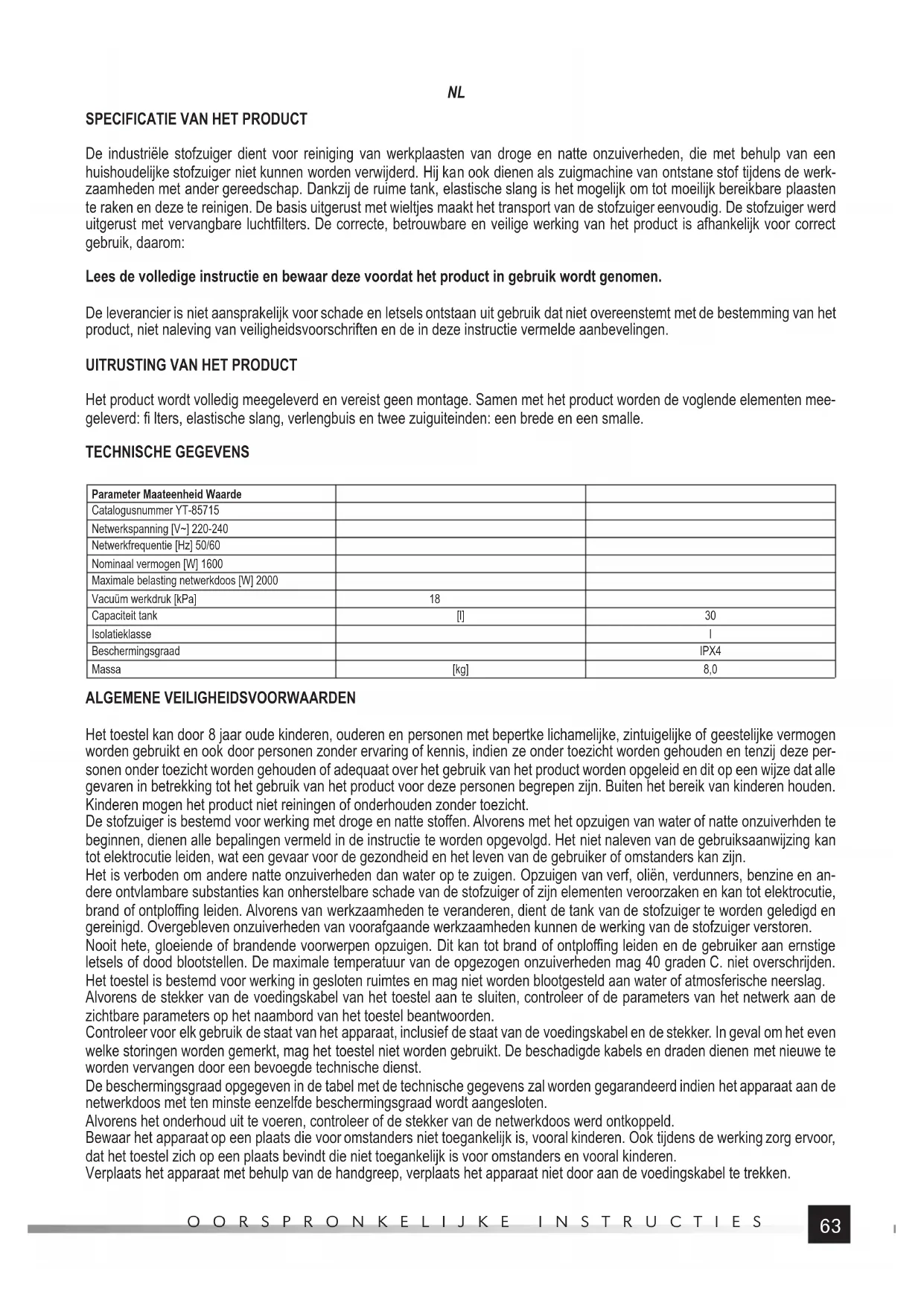 Het product wordt volledig meegeleverd en vereist geen montage. Samen met het product worden de voglende elementen mee- geleverd: fi lters, elastische slang, verlengbuis en twee zuiguiteinden: een brede en een smalle. TECHNISCHE GEGEVENS Parameter Maateenheid Waarde Catalogusnummer YT-85715 Netwerkspanning [V~] 220-240 Netwerkfrequentie [Hz] 50/60 Nominaal vermogen [W] 1600 Maximale belasting netwerkdoos [W] 2000 Vacuüm werkdruk [kPa] 18 Capaciteit tank [l] 30 Isolatieklasse I Beschermingsgraad IPX4 Massa [kg] 8,0 ALGEMENE VEILIGHEIDSVOORWAARDEN Het toestel kan door 8 jaar oude kinderen, ouderen en personen met bepertke lichamelijke, zintuigelijke of geestelijke vermogen worden gebruikt en ook door personen zonder ervaring of kennis, indien ze onder toezicht worden gehouden en tenzij deze per- sonen onder toezicht worden gehouden of adequaat over het gebruik van het product worden opgeleid en dit op een wijze dat alle gevaren in betrekking tot het gebruik van het product voor deze personen begrepen zijn. Buiten het bereik van kinderen houden. Kinderen mogen het product niet reiningen of onderhouden zonder toezicht. De stofzuiger is bestemd voor werking met droge en natte stoff en. Alvorens met het opzuigen van water of natte onzuiverhden te beginnen, dienen alle bepalingen vermeld in de instructie te worden opgevolgd. Het niet naleven van de gebruiksaanwijzing kan tot elektrocutie leiden, wat een gevaar voor de gezondheid en het leven van de gebruiker of omstanders kan zijn. Het is verboden om andere natte onzuiverheden dan water op te zuigen. Opzuigen van verf, oliën, verdunners, benzine en an- dere ontvlambare substanties kan onherstelbare schade van de stofzuiger of zijn elementen veroorzaken en kan tot elektrocutie, brand of ontploffi ng leiden. Alvorens van werkzaamheden te veranderen, dient de tank van de stofzuiger te worden geledigd en gereinigd. Overgebleven onzuiverheden van voorafgaande werkzaamheden kunnen de werking van de stofzuiger verstoren. Nooit hete, gloeiende of brandende voorwerpen opzuigen. Dit kan tot brand of ontploffi ng leiden en de gebruiker aan ernstige letsels of dood blootstellen. De maximale temperatuur van de opgezogen onzuiverheden mag 40 graden C. niet overschrijden. Het toestel is bestemd voor werking in gesloten ruimtes en mag niet worden blootgesteld aan water of atmosferische neerslag. Alvorens de stekker van de voedingskabel van het toestel aan te sluiten, controleer of de parameters van het netwerk aan de zichtbare parameters op het naambord van het toestel beantwoorden. Controleer voor elk gebruik de staat van het apparaat, inclusief de staat van de voedingskabel en de stekker. In geval om het even welke storingen worden gemerkt, mag het toestel niet worden gebruikt. De beschadigde kabels en draden dienen met nieuwe te worden vervangen door een bevoegde technische dienst. De beschermingsgraad opgegeven in de tabel met de technische gegevens zal worden gegarandeerd indien het apparaat aan de netwerkdoos met ten minste eenzelfde beschermingsgraad wordt aangesloten. Alvorens het onderhoud uit te voeren, controleer of de stekker van de netwerkdoos werd ontkoppeld. Bewaar het apparaat op een plaats die voor omstanders niet toegankelijk is, vooral kinderen. Ook tijdens de werking zorg ervoor, dat het toestel zich op een plaats bevindt die niet toegankelijk is voor omstanders en vooral kinderen. Verplaats het apparaat met behulp van de handgreep, verplaats het apparaat niet door aan de voedingskabel te trekken.64 OORSPRONKELIJKE INSTRUCTIES