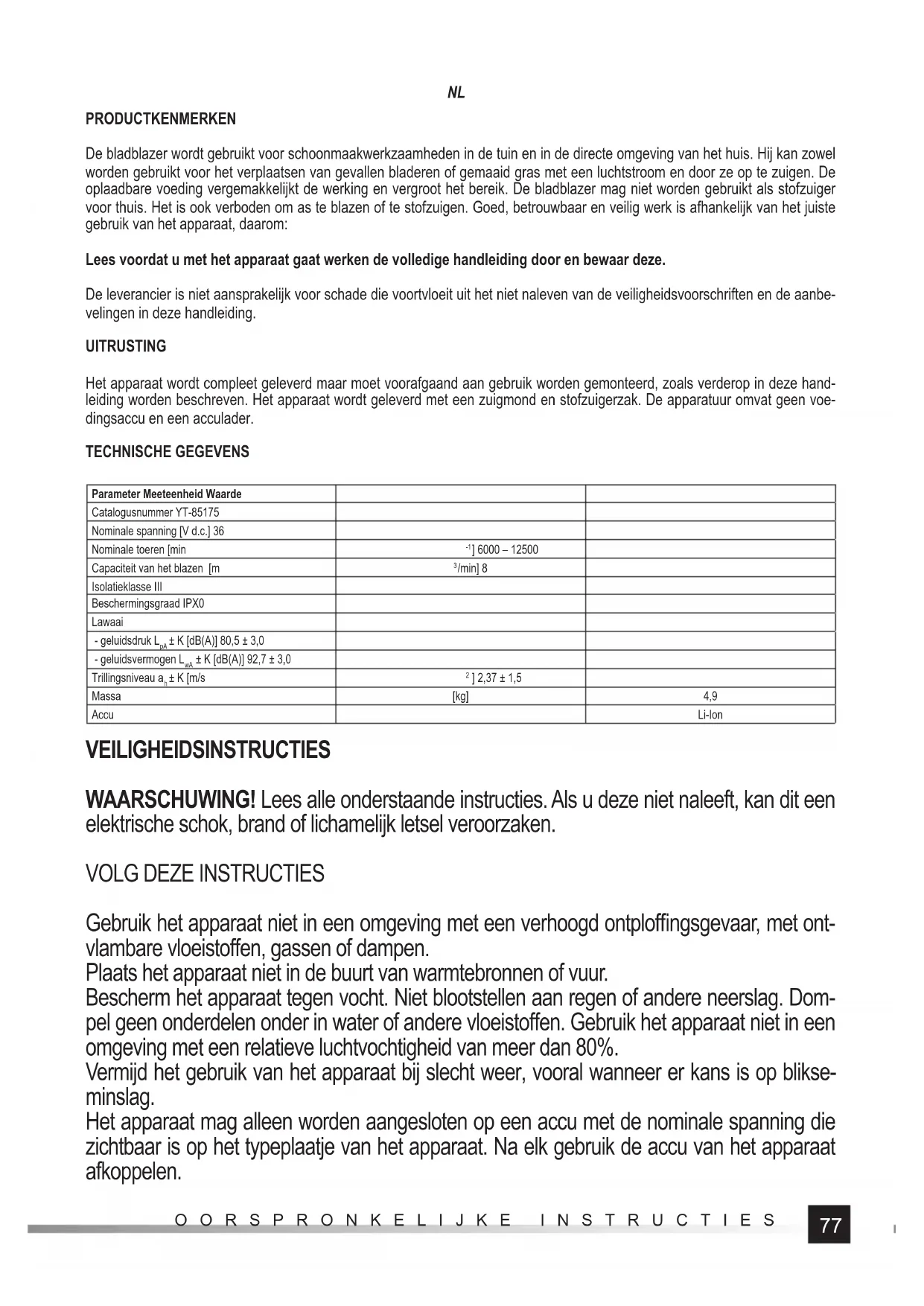 Waarschuwing! Start het apparaat nooit als er zich personen, met name kinderen, of dieren in de directe omgeving bevinden. Gebruik het apparaat alleen als blazer of als tuinstofzuiger. Elk ander gebruik is verboden. Gebruik de bladblazer niet voor het verpompen van bijv. matrassen, barbecues of vreugde- vuren. Blaas geen hete as, hitte of vuur. Verbrandingswarmte kan brand en ernstige brand- wonden veroorzaken. Bij gebruik als stofzuiger is het verboden om nat of heet vuil, b.v. hete as, aan te zuigen. Gebruik het apparaat niet voor het stralen of stofzuigen van sneeuw of water. Richt de luchtuitlaat niet op andere personen of dieren. Controleer vóór het blazen het werkgebied en verwijder voorwerpen die gevaar kunnen op- leveren. Let op: uitgeworpen deeltjes kunnen zich tegen obstakels stoten en de bediener raken. Gebruik bij het werken met het apparaat persoonlijke beschermingsmiddelen. Werkkleding met lange pijpen en mouwen, beschermende handschoenen. Draag oog- en gezichtsbe- scherming. Gebruik tevens gehoorbescherming. Draag robuust schoeisel met antislipzool dat de enkel volledig omsluit. Blokkeer de ventilatieopeningen niet en zorg ervoor dat ze vrij zijn. Bedekte en of verstop- te ventilatieopeningen kunnen leiden tot oververhitting van het apparaat. Dit kan leiden tot schade aan het apparaat of brand of elektrische schokken veroorzaken. Als u schade aan een deel van het apparaat opmerkt, is het verdere gebruik ervan verboden. In dit geval moet het apparaat naar een erkend service center worden gebracht of moet men dit deel zelfstandig vervangen, voor zover de handleiding dergelijke herstellingen door de gebruiker toelaat. Voordat u stappen onderneemt in verband met het vervangen van onderdelen, het reinigen of de afstelling, koppelt u de accu los van het apparaat. Vóór het vervangen van onderdelen, moet het apparaat worden uitgeschakeld en de accu uit het apparaat getrokken. Het apparaat mag niet worden gebruikt door kinderen of personen met beperkte fysieke, sensorische of mentale vaardigheden, zonder ervaring en kennis, of die niet bekend zijn met deze instructies. Lokale voorschriften kunnen de leeftijd van de bediener beperken. Kinde- ren mogen niet met het apparaat spelen. Kinderen zonder toezicht mogen het apparaat niet schoonmaken en onderhouden. Het apparaat is ontworpen om met één hand te worden bediend. Houd het apparaat aan de handgreep vast. De hendel moet altijd naar boven gericht zijn. Zorg ervoor dat de manier waarop men het apparaat vasthoudt, de luchtinlaat en -uitlaat niet verstoort. De luchtinlaat mag niet te dicht bij de grond zijn om te voorkomen dat vuil in het apparaat wordt gezogen. Neem tijdens het werk een zekere lichaamshouding aan, zodat u altijd in balans kunt blijven. Beweeg bij het werken op een helling moet men zich dwars over de helling voortbewegen. Nooit rennen tijdens het werken, altijd lopen. Gebruik het apparaat altijd als het volledig gemonteerd is. Gebruik het apparaat nooit zonder het aangesloten mondstuk. Gebruik altijd een zak wanneer u het apparaat als stofzuiger gebruikt. Raak geen gevaarlijke bewegende delen aan voordat het apparaat is losgekoppeld van het79 OORSPRONKELIJKE INSTRUCTIES