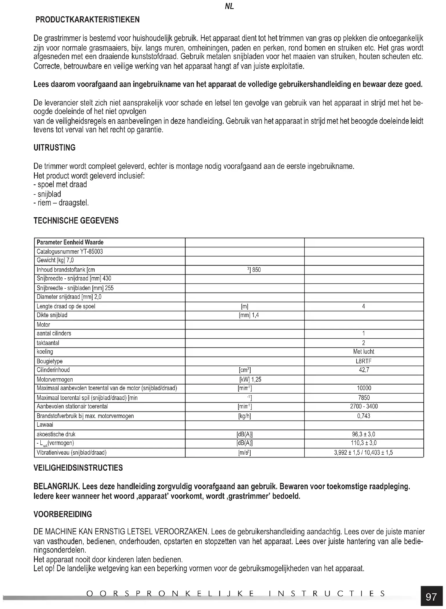 OORSPRONKELIJKE INSTRUCTIES PRODUCTKARAKTERISTIEKEN De grastrimmer is bestemd voor huishoudelijk gebruik. Het apparaat dient tot het trimmen van gras op plekken die ontoegankelijk zijn voor normale grasmaaiers, bijv. langs muren, omheiningen, paden en perken, rond bomen en struiken etc. Het gras wordt afgesneden met een draaiende kunststofdraad. Gebruik metalen snijbladen voor het maaien van struiken, houten scheuten etc. Correcte, betrouwbare en veilige werking van het apparaat hangt af van juiste exploitatie. Lees daarom voorafgaand aan ingebruikname van het apparaat de volledige gebruikershandleiding en bewaar deze goed. De leverancier stelt zich niet aansprakelijk voor schade en letsel ten gevolge van gebruik van het apparaat in strijd met het be- oogde doeleinde of het niet opvolgen van de veiligheidsregels en aanbevelingen in deze handleiding. Gebruik van het apparaat in strijd met het beoogde doeleinde leidt tevens tot verval van het recht op garantie. UITRUSTING De trimmer wordt compleet geleverd, echter is montage nodig voorafgaand aan de eerste ingebruikname. Het product wordt geleverd inclusief: - spoel met draad - snijblad - riem – draagstel. TECHNISCHE GEGEVENS Parameter Eenheid Waarde Catalogusnummer YT-85003 Gewicht [kg] 7,0 Inhoud brandstoftank [cm