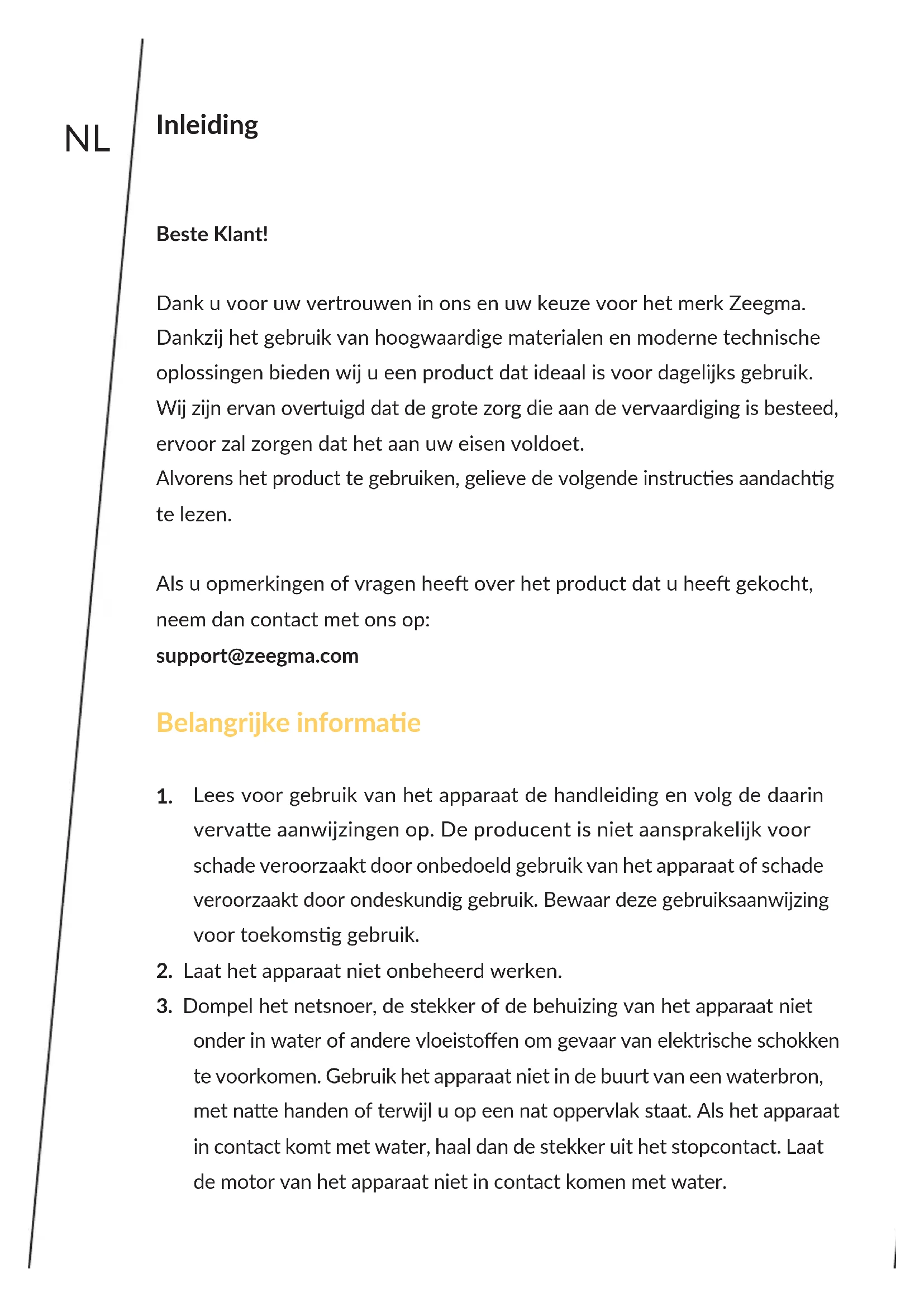 Las fotos solo enen carácter ilustravo, el aspecto real de los productos puede diferir de los presentados en las fotos.NL Inleiding Beste Klant! Dank u voor uw vertrouwen in ons en uw keuze voor het merk Zeegma. Dankzij het gebruik van hoogwaardige materialen en moderne technische oplossingen bieden wij u een product dat ideaal is voor dagelijks gebruik. Wij zijn ervan overtuigd dat de grote zorg die aan de vervaardiging is besteed, ervoor zal zorgen dat het aan uw eisen voldoet. Alvorens het product te gebruiken, gelieve de volgende instruces aandachg te lezen. Als u opmerkingen of vragen hee over het product dat u hee gekocht, neem dan contact met ons op: support@zeegma.com Belangrijke informae
