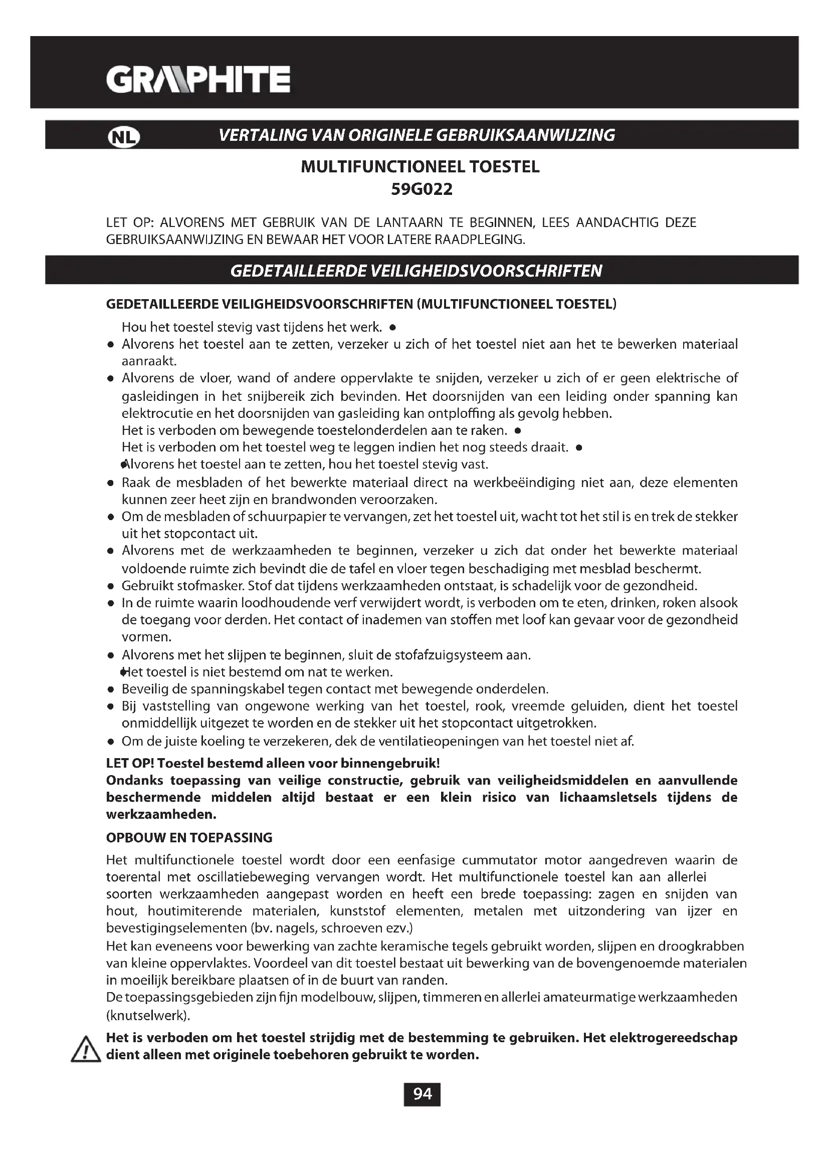 Het multifunctionele toestel wordt door een eenfasige cummutator motor aangedreven waarin de toerental met oscillatiebeweging vervangen wordt. Het multifunctionele toestel kan aan allerlei soorten werkzaamheden aangepast worden en heeft een brede toepassing: zagen en snijden van hout, houtimiterende materialen, kunststof elementen, metalen met uitzondering van ijzer en bevestigingselementen (bv. nagels, schroeven ezv.) Het kan eveneens voor bewerking van zachte keramische tegels gebruikt worden, slijpen en droogkrabben van kleine oppervlaktes. Voordeel van dit toestel bestaat uit bewerking van de bovengenoemde materialen in moeilijk bereikbare plaatsen of in de buurt van randen. De toepassingsgebieden zijn jn modelbouw, slijpen, timmeren en allerlei amateurmatige werkzaamheden (knutselwerk). Het is verboden om het toestel strijdig met de bestemming te gebruiken. Het elektrogereedschap dient alleen met originele toebehoren gebruikt te worden. NL95