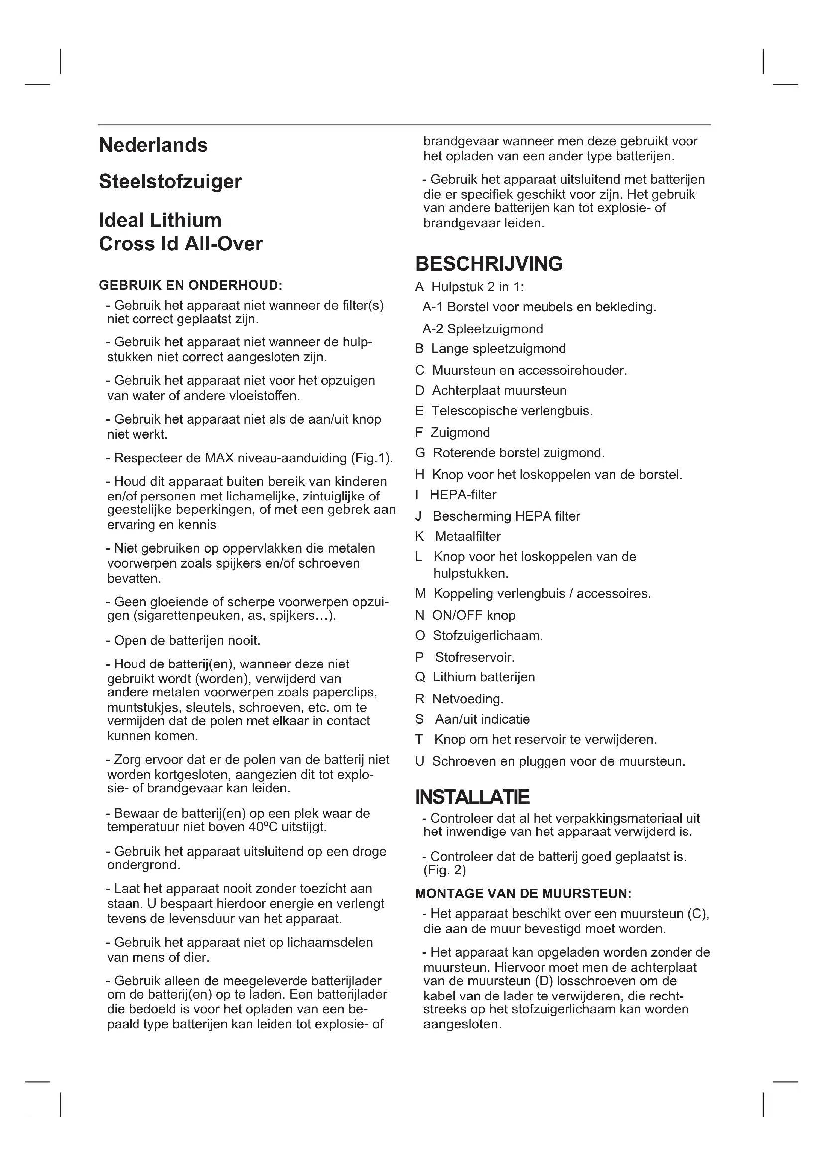L’INTERIOR DE L’APARELL: - Advertiment: És important que les bateries es trobin completament descarregades abans de procedir a la seva retirada de l’aparell. - Advertiment: l’aparell ha d’estar desconnectat de l’alimentació quan es retirin les bateries PER A RETIRAR LES BATERIES, UNA VEGA- DA FINALITZADA LA VIDA DE L’APARELL, PROCEDIR COM SEGUEIX: - Tirar de la bateria feia a dalt per a extreure-la del seu allotjament. (Fig. 11).Nederlands Steelstofzuiger Ideal Lithium Cross Id All-Over GEBRUIK EN ONDERHOUD: - Gebruik het apparaat niet wanneer de lter(s) niet correct geplaatst zijn. - Gebruik het apparaat niet wanneer de hulp- stukken niet correct aangesloten zijn. - Gebruik het apparaat niet voor het opzuigen van water of andere vloeistoffen. - Gebruik het apparaat niet als de aan/uit knop niet werkt. - Respecteer de MAX niveau-aanduiding (Fig.1). - Houd dit apparaat buiten bereik van kinderen en/of personen met lichamelijke, zintuiglijke of geestelijke beperkingen, of met een gebrek aan ervaring en kennis - Niet gebruiken op oppervlakken die metalen voorwerpen zoals spijkers en/of schroeven bevatten. - Geen gloeiende of scherpe voorwerpen opzui- gen (sigarettenpeuken, as, spijkers…). - Open de batterijen nooit. - Houd de batterij(en), wanneer deze niet gebruikt wordt (worden), verwijderd van andere metalen voorwerpen zoals paperclips, muntstukjes, sleutels, schroeven, etc. om te vermijden dat de polen met elkaar in contact kunnen komen. - Zorg ervoor dat er de polen van de batterij niet worden kortgesloten, aangezien dit tot explo- sie- of brandgevaar kan leiden. - Bewaar de batterij(en) op een plek waar de temperatuur niet boven 40ºC uitstijgt. - Gebruik het apparaat uitsluitend op een droge ondergrond. - Laat het apparaat nooit zonder toezicht aan staan. U bespaart hierdoor energie en verlengt tevens de levensduur van het apparaat. - Gebruik het apparaat niet op lichaamsdelen van mens of dier. - Gebruik alleen de meegeleverde batterijlader om de batterij(en) op te laden. Een batterijlader die bedoeld is voor het opladen van een be- paald type batterijen kan leiden tot explosie- of brandgevaar wanneer men deze gebruikt voor het opladen van een ander type batterijen. - Gebruik het apparaat uitsluitend met batterijen die er speciek geschikt voor zijn. Het gebruik van andere batterijen kan tot explosie- of brandgevaar leiden. BESCHRIJVING A Hulpstuk 2 in 1: A-1 Borstel voor meubels en bekleding. A-2 Spleetzuigmond B Lange spleetzuigmond C Muursteun en accessoirehouder. D Achterplaat muursteun E Telescopische verlengbuis. F Zuigmond G Roterende borstel zuigmond. H Knop voor het loskoppelen van de borstel. I HEPA-lter J Bescherming HEPA lter K Metaallter L Knop voor het loskoppelen van de hulpstukken. M Koppeling verlengbuis / accessoires. N ON/OFF knop O Stofzuigerlichaam. P Stofreservoir. Q Lithium batterijen R Netvoeding. S Aan/uit indicatie T Knop om het reservoir te verwijderen. U Schroeven en pluggen voor de muursteun. INSTALLATIE - Controleer dat al het verpakkingsmateriaal uit het inwendige van het apparaat verwijderd is. - Controleer dat de batterij goed geplaatst is. (Fig. 2) MONTAGE VAN DE MUURSTEUN: - Het apparaat beschikt over een muursteun (C), die aan de muur bevestigd moet worden. - Het apparaat kan opgeladen worden zonder de muursteun. Hiervoor moet men de achterplaat van de muursteun (D) losschroeven om de kabel van de lader te verwijderen, die recht- streeks op het stofzuigerlichaam kan worden aangesloten.- Bevestig de muursteun naar eigen inzicht met behulp van pluggen, schroeven, lijm, enz. - Controleer dat de steun stevig vastzit en ten- minste tweemaal het gewicht van het apparaat kan dragen. - Plaats het apparaat in de muursteun.