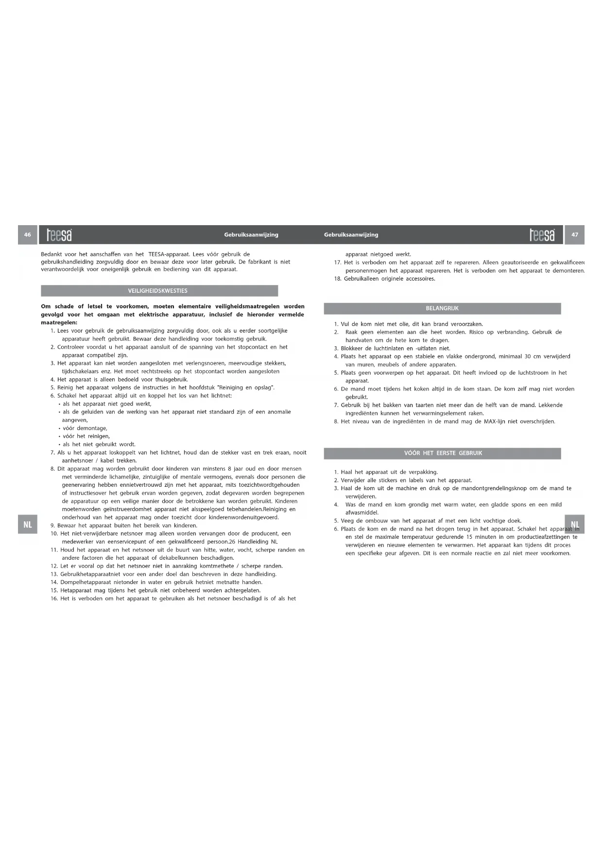 Bedankt voor het aanschaen van het TEESA-apparaat. Lees vóór gebruik de gebruikshandleiding zorgvuldig door en bewaar deze voor later gebruik. De fabrikant is niet verantwoordelijk voor oneigenlijk gebruik en bediening van dit apparaat. BELANGRIJK