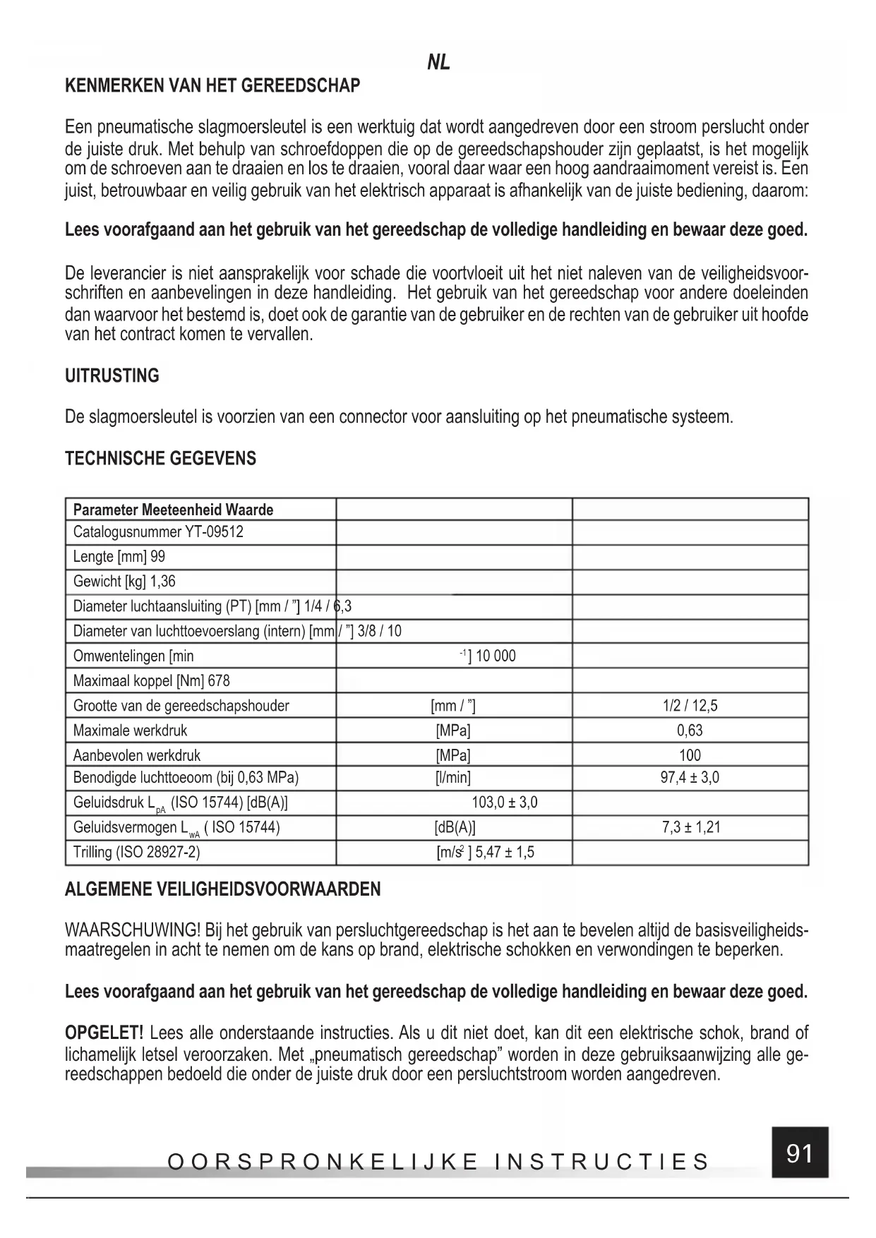Een pneumatische slagmoersleutel is een werktuig dat wordt aangedreven door een stroom perslucht onder de juiste druk. Met behulp van schroefdoppen die op de gereedschapshouder zijn geplaatst, is het mogelijk om de schroeven aan te draaien en los te draaien, vooral daar waar een hoog aandraaimoment vereist is. Een juist, betrouwbaar en veilig gebruik van het elektrisch apparaat is afhankelijk van de juiste bediening, daarom: Lees voorafgaand aan het gebruik van het gereedschap de volledige handleiding en bewaar deze goed. De leverancier is niet aansprakelijk voor schade die voortvloeit uit het niet naleven van de veiligheidsvoor- schriften en aanbevelingen in deze handleiding. Het gebruik van het gereedschap voor andere doeleinden dan waarvoor het bestemd is, doet ook de garantie van de gebruiker en de rechten van de gebruiker uit hoofde van het contract komen te vervallen. UITRUSTING De slagmoersleutel is voorzien van een connector voor aansluiting op het pneumatische systeem. TECHNISCHE GEGEVENS Parameter Meeteenheid Waarde Catalogusnummer YT-09512 Lengte [mm] 99 Gewicht [kg] 1,36 Diameter luchtaansluiting (PT) [mm / ”] 1/4 / 6,3 Diameter van luchttoevoerslang (intern) [mm / ”] 3/8 / 10 Omwentelingen [min