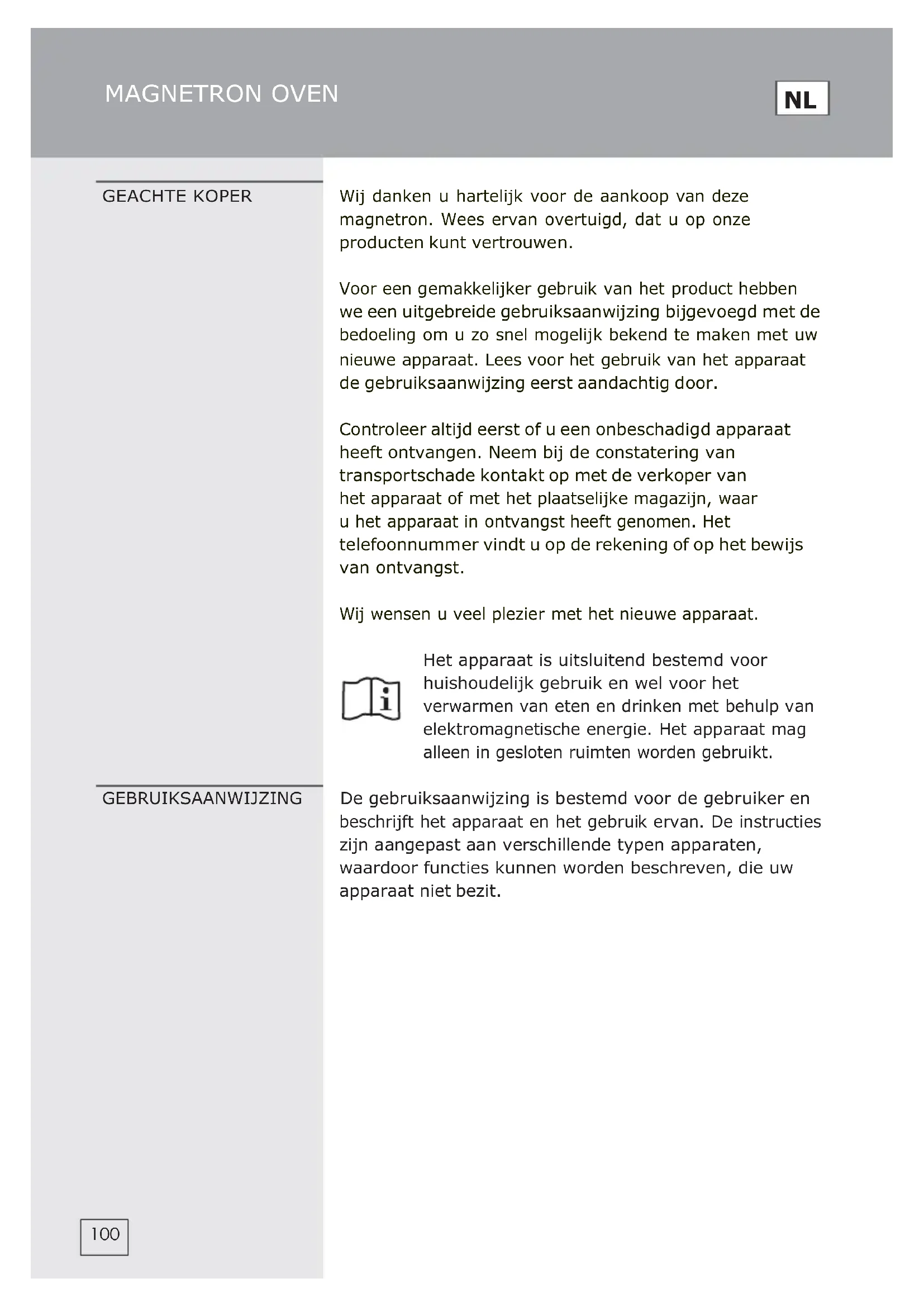 GEACHTE KOPER Wij danken u hartelijk voor de aankoop van deze magnetron. Wees ervan overtuigd, dat u op onze producten kunt vertrouwen. Voor een gemakkelijker gebruik van het product hebben we een uitgebreide gebruiksaanwijzing bijgevoegd met de bedoeling om u zo snel mogelijk bekend te maken met uw nieuwe apparaat. Lees voor het gebruik van het apparaat de gebruiksaanwijzing eerst aandachtig door. Controleer altijd eerst of u een onbeschadigd apparaat heeft ontvangen. Neem bij de constatering van transportschade kontakt op met de verkoper van het apparaat of met het plaatselijke magazijn, waar u het apparaat in ontvangst heeft genomen. Het