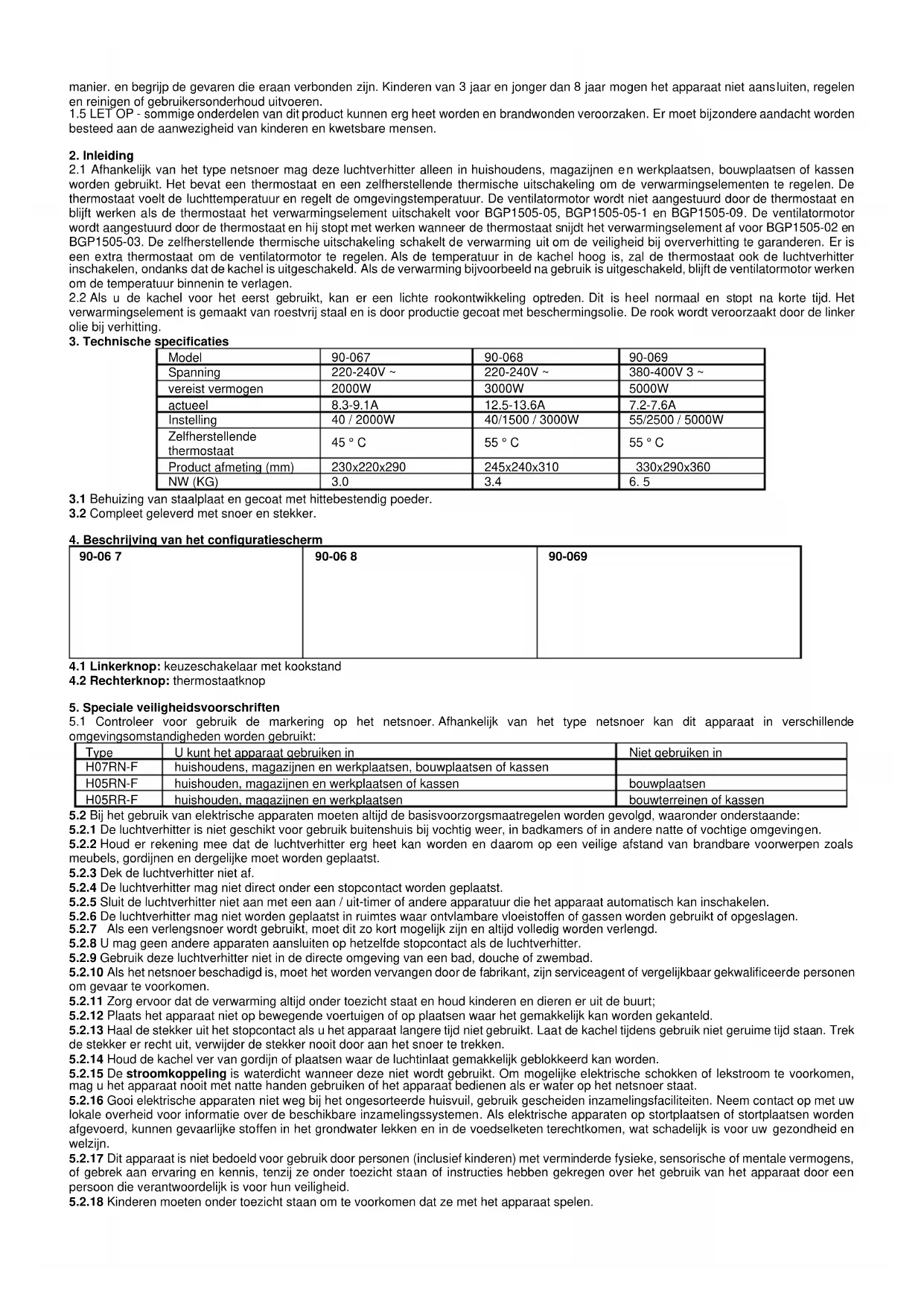 H05RN-F huishouden, magazijnen en werkplaatsen of kassen bouwplaatsen H05RR-F huishouden, magazijnen en werkplaatsen bouwterreinen of kassen 5.2 Bij het gebruik van elektrische apparaten moeten altijd de basisvoorzorgsmaatregelen worden gevolgd, waaronder onderstaande: 5.2.1 De luchtverhitter is niet geschikt voor gebruik buitenshuis bij vochtig weer, in badkamers of in andere natte of vochtige omgevingen. 5.2.2 Houd er rekening mee dat de luchtverhitter erg heet kan worden en daarom op een veilige afstand van brandbare voorwerpen zoals meubels, gordijnen en dergelijke moet worden geplaatst.