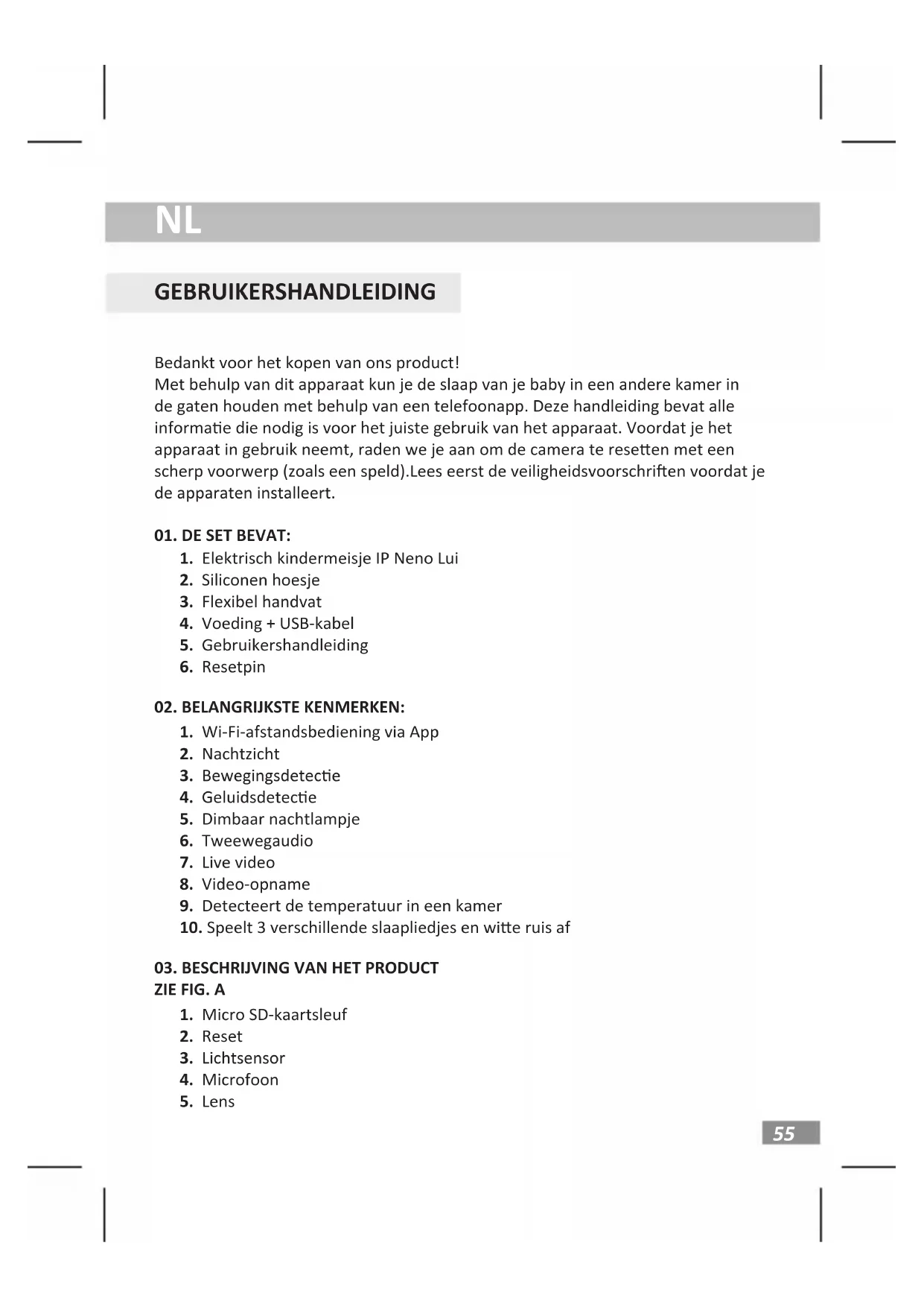 GEBRUIKERSHANDLEIDING Bedankt voor het kopen van ons product! Met behulp van dit apparaat kun je de slaap van je baby in een andere kamer in de gaten houden met behulp van een telefoonapp. Deze handleiding bevat alle informae die nodig is voor het juiste gebruik van het apparaat. Voordat je het apparaat in gebruik neemt, raden we je aan om de camera te reseen met een scherp voorwerp (zoals een speld).Lees eerst de veiligheidsvoorschrien voordat je de apparaten installeert.