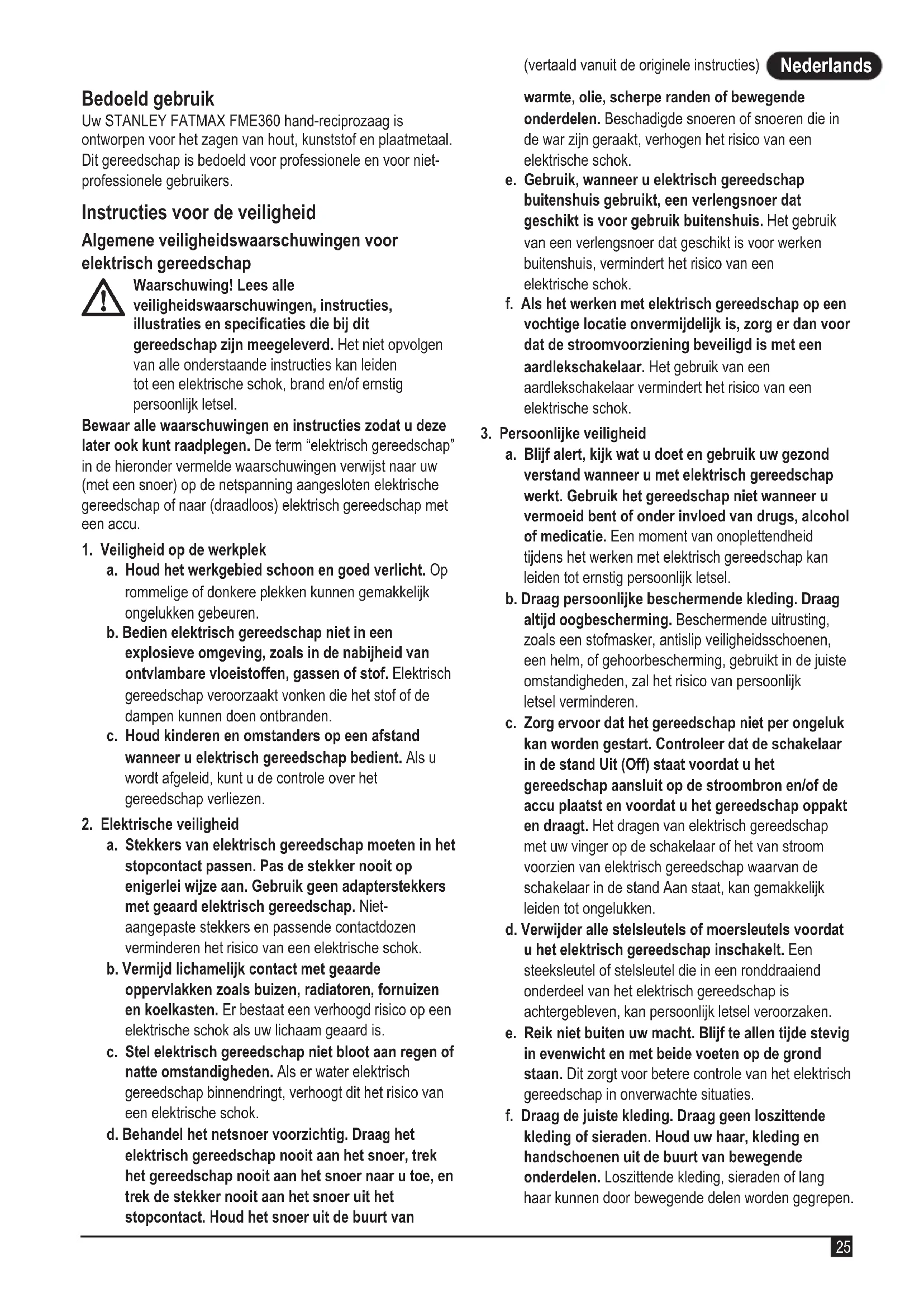 (vertaald vanuit de originele instructies) Nederlands (vertaald vanuit de originele instructies) Bedoeld gebruik Uw STANLEY FATMAX FME360 hand-reciprozaag is ontworpen voor het zagen van hout, kunststof en plaatmetaal. Dit gereedschap is bedoeld voor professionele en voor niet- professionele gebruikers. Instructies voor de veiligheid Algemene veiligheidswaarschuwingen voor elektrisch gereedschap