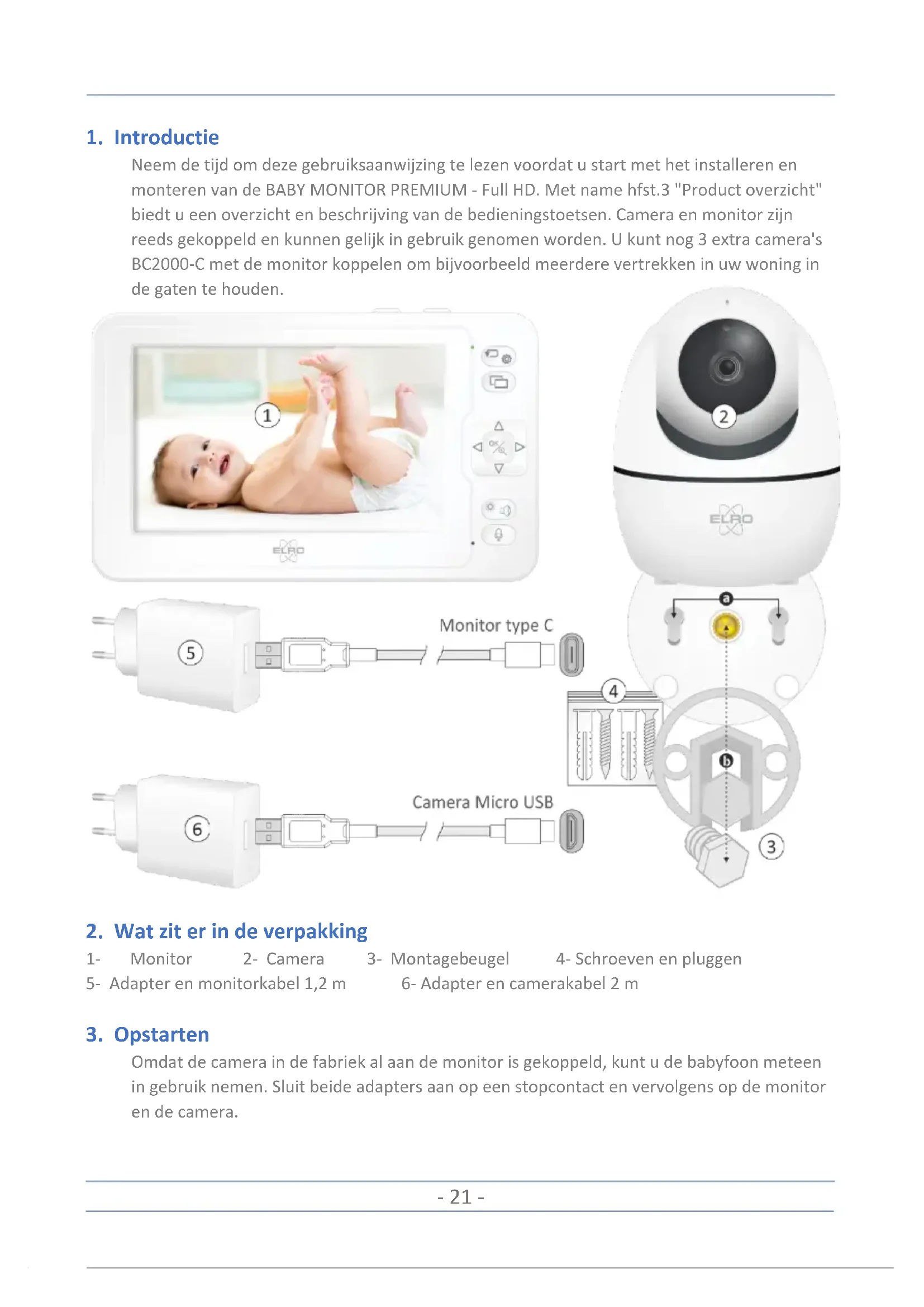 Neem de tijd om deze gebruiksaanwijzing te lezen voordat u start met het installeren en monteren van de BABY MONITOR PREMIUM - Full HD. Met name hfst.3 "Product overzicht" biedt u een overzicht en beschrijving van de bedieningstoetsen. Camera en monitor zijn reeds gekoppeld en kunnen gelijk in gebruik genomen worden. U kunt nog 3 extra camera's BC2000-C met de monitor koppelen om bijvoorbeeld meerdere vertrekken in uw woning in de gaten te houden.