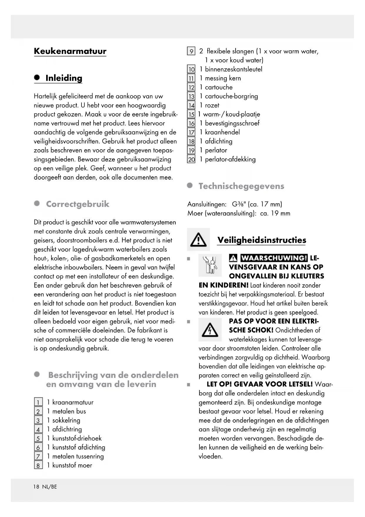 SCHE SCHOK! Ondichtheden of water lekkages kunnen tot levensge- vaar door stroomstoten leiden. Controleer alle ver bindingen zorgvuldig op dichtheid. Waarborg bovendien dat alle leidingen van elektrische ap- paraten correct en veilig geïnstalleerd zijn. LET OP! GEVAAR VOOR LETSEL! Waar- borg dat alle onderdelen intact en deskundig gemonteerd zijn. Bij ondeskundige montage bestaat gevaar voor letsel. Houd er rekening mee dat de onderlegringen en de afdichtingen aan slijtage onderhevig zijn en regelmatig moeten worden vervangen. Beschadigde de- len kunnen de veiligheid en de werking beïn- vloeden.19 NL/BE