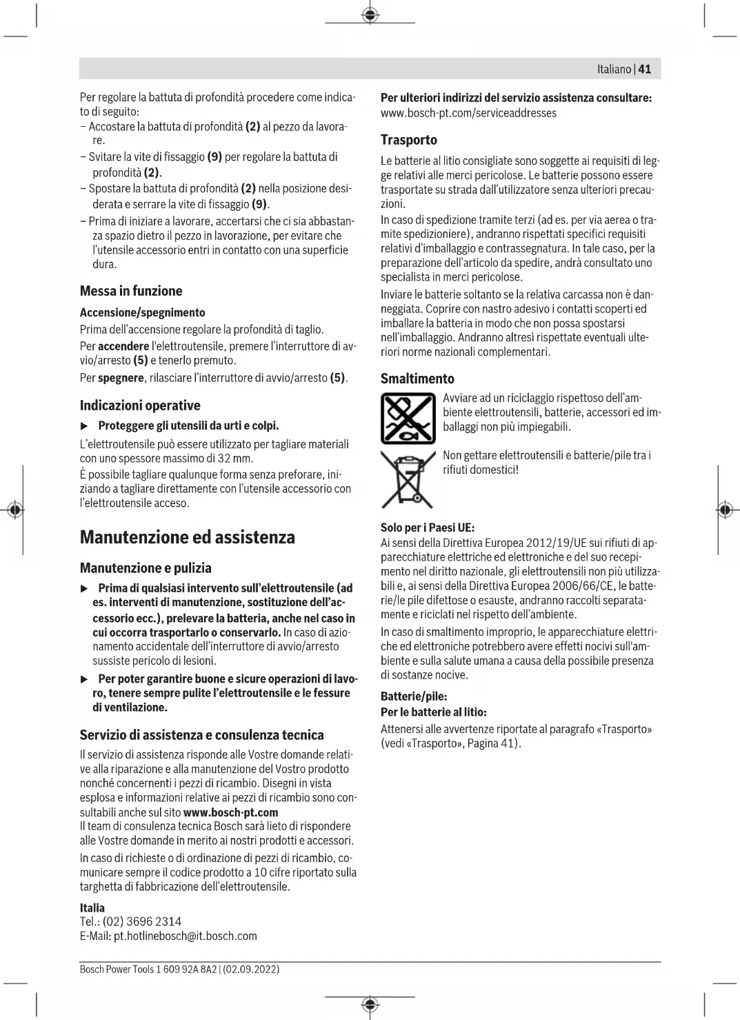 Il livello di vibrazione ed il valore di emissione acustica indi- cati nelle presenti istruzioni sono stati rilevati conformemen- te ad una procedura di misurazione unificata e sono utilizza- bili per confrontare gli elettroutensili. Le stesse procedure sono idonee anche per una valutazione temporanea del livel- lo di vibrazione e dell’emissione acustica. Il livello di vibrazione ed il valore di emissione acustica sono riferiti agli impieghi principali dell’elettroutensile; qualora, tuttavia, l’elettroutensile venisse utilizzato per altre applica- 1 609 92A 8A2 | (02.09.2022) Bosch Power ToolsItaliano | 39 zioni, oppure con accessori differenti o in caso di insufficien- te manutenzione, il livello di vibrazione ed il valore di emis- sione acustica potrebbero variare. Ciò potrebbe aumentare sensibilmente l’emissione di vibrazioni e l’emissione acustica sull’intero periodo di funzionamento. Per valutare con precisione i valori di vibrazione e di emissio- ne acustica, andranno considerati anche i periodi nei quali l’utensile sia spento, oppure acceso, ma non utilizzato. Ciò potrebbe ridurre sensibilmente l’emissione di vibrazioni e l’emissione acustica sull’intero periodo di funzionamento. Adottare misure di sicurezza supplementari per proteggere l’operatore dall’effetto delle vibrazioni: ad esempio, sottopo- nendo a manutenzione l’elettroutensile e gli utensili accesso- ri, mantenendo calde le mani e organizzando i vari processi di lavoro. Batteria Bosch vende elettroutensili a batteria anche senza batteria. Per sapere se nella dotazione dell’elettroutensile è compresa una batteria, leggere quanto riportato sulla confezione. Ricarica della batteria u Utilizzare esclusivamente i caricabatterie indicati nei dati tecnici. Soltanto questi caricabatterie sono adatti al- le batterie al litio utilizzate nell’elettroutensile. Avvertenza: a causa delle norme internazionali per il tra- sporto, le batterie al litio vengono fornite parzialmente cari- che. Per assicurare la piena potenza della batteria, ricaricar- la completamente prima dell’impiego iniziale. Introduzione della batteria Spingere la batteria carica nell’apposito alloggiamento, sino a farlo scattare udibilmente in posizione. Rimozione della batteria Per rimuovere la batteria, premere il tasto di sbloccaggio ed estrarla. Durante tale operazione, non esercitare forza. La batteria è dotata di 2livelli di bloccaggio, preposti ad im- pedire che la batteria stessa cada all’esterno, qualora il tasto di sbloccaggio batteria venga premuto inavvertitamente. Si- no a quando la batteria è inserita nell’elettroutensile, essa viene mantenuta in posizione da un’apposita molla. Indicatore del livello di carica della batteria I LED verdi dell’apposito indicatore indicano il livello di cari- ca della batteria. Per ragioni di sicurezza, il livello di carica si può verificare esclusivamente ad elettroutensile fermo. Per visualizzare il livello di carica, premere il tasto dell’indi- catore livello di carica della batteria o . Ciò sarà possibi- le anche a batteria rimossa. Se premuto il tasto dell’indicatore livello di carica della batte- ria non si illumina alcun LED, ciò significa che la batteria è di- fettosa e che deve essere sostituita. Tipo di batteria GBA 18V... LED Capacità Luce fissa, 3 LED verdi 60–100% Luce fissa, 2 LED verdi 30–60% Luce fissa, 1 LED verde 5–30% Luce lampeggiante, 1 LED verde 0–5% Tipo di batteria ProCORE18V... LED Capacità Luce fissa, 5 LED verdi 80–100% Luce fissa, 4 LED verdi 60–80% Luce fissa, 3 LED verdi 40–60% Luce fissa, 2 LED verdi 20–40% Luce fissa, 1 LED verde 5–20% Luce lampeggiante, 1 LED verde 0–5% Avvertenze per l’impiego ottimale della batteria Proteggere la batteria ricaricabile da umidità ed acqua. Conservare la batteria esclusivamente nel campo di tempe- ratura fra −20 °C e 50°C. Non lasciare la batteria all’interno dell’auto, ad es. nel periodo estivo. Pulire di tanto in tanto le fessure di ventilazione della batte- ria ricaricabile con un pennello morbido, pulito ed asciutto. Una sensibile riduzione della durata del funzionamento dopo l’operazione di ricarica sta ad indicare che la batteria ricari- cabile dovrà essere sostituita. Attenersi alle indicazioni relative allo smaltimento. Montaggio u Prima di qualsiasi intervento sull’elettroutensile (ad es. interventi di manutenzione, sostituzione dell’ac- cessorio ecc.), prelevare la batteria, anche nel caso in cui occorra trasportarlo o conservarlo. In caso di azio- namento accidentale dell’interruttore di avvio/arresto sussiste pericolo di lesioni. Cambio degli utensili u Per l’inserimento e la sostituzione degli utensili acces- sori si raccomanda di indossare guanti di protezione. Potete trovare gli utensili accessori originali del completo programma di accessori Bosch presso il vostro rivenditore specializzato. Sostituzione della pinza di serraggio (vedere fig.A) Estrarre la vite di fissaggio (9) e rimuovere la battuta di pro- fondità (2) insieme all’adattatore per l’aspirazione della pol- vere (3). Bosch Power Tools 1 609 92A 8A2 | (02.09.2022)40 | Italiano In base alle dimensioni dell’utensile accessorio, prima dell’in- serimento è necessario sostituire il dado (12) con la pinza di serraggio(11). Se è già montata la pinza di serraggio corretta per l’applica- zione, seguire i passaggi indicati nella sezione seguente. La pinza di serraggio(11) dev’essere montata sul dado a ri- svolto con un leggero gioco. Il dado a risvolto(12) dev’esse- re semplice da montare. Qualora il dado a risvolto o la pinza di serraggio dovessero essere danneggiati, sostituirli imme- diatamente. Premere il pulsante di bloccaggio dell’alberino(8) e tenerlo premuto. All’occorrenza, ruotare manualmente l’alberino del motore fino al suo bloccaggio. Svitare il dado(12) con la chiave fissa(13) ruotandolo nel senso di rotazione ➊. Rilasciare il pulsante di bloccaggio del