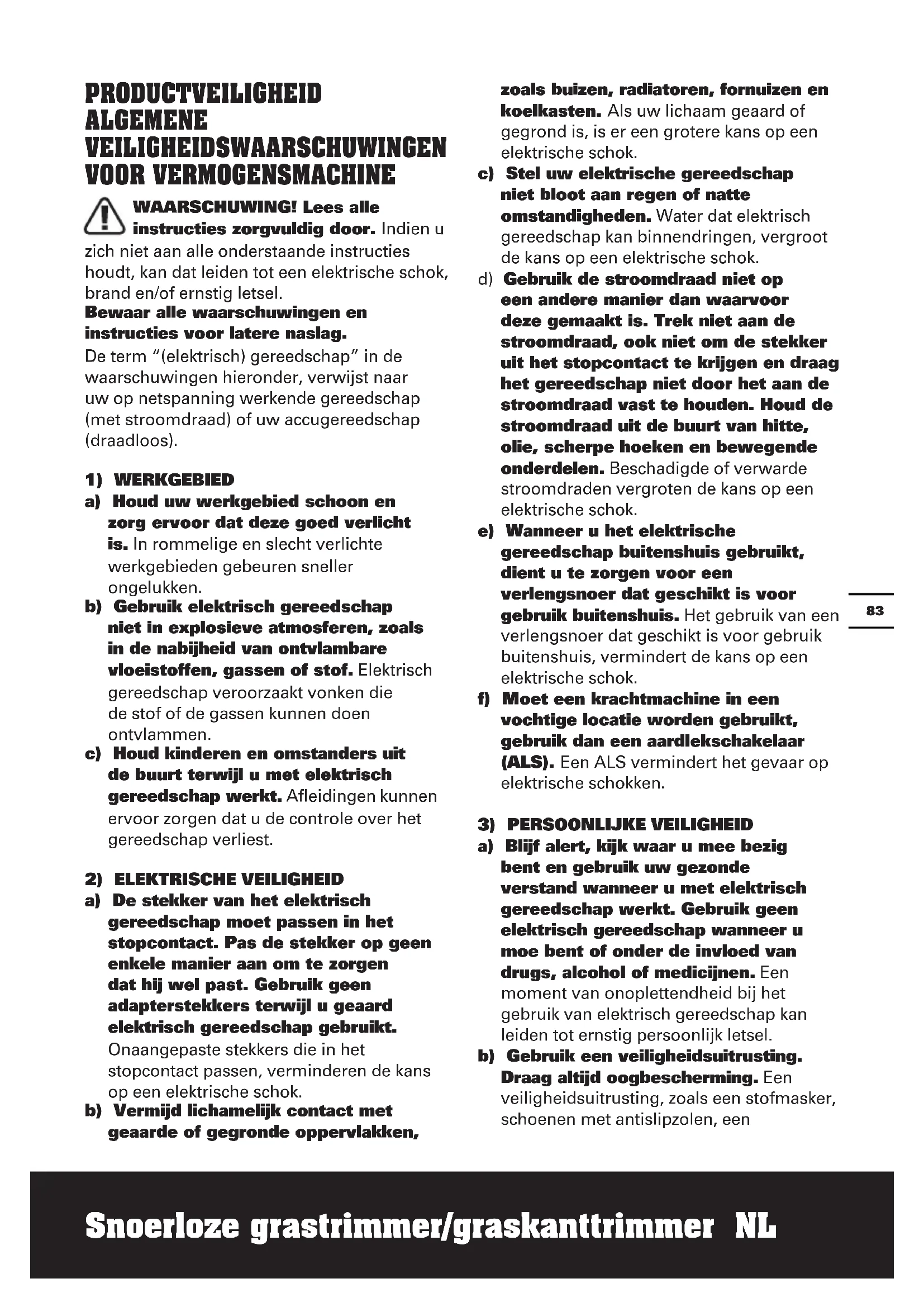 ACCUGEREEDSCHAP85 Snoerloze grastrimmer/graskanttrimmer NL a) Laad het accupack alleen op met de door de fabrikant aangegeven oplader. Een oplader die geschikt is voor het ene type accupack, kan brand veroorzaken wanneer die gebruikt wordt voor een ander type accupack. b) Gebruik het gereedschap uitsluitend met het aangegeven accupack. Door het gebruik van andere accupacks ontstaat de kans op letsel of brand. c) Wanneer het accupack niet gebruikt wordt, dient u het uit de buurt te houden van metalen voorwerpen, zoals paperclips, munten, sleutels, spijkers, schroeven of andere kleine metalen voorwerpen die een verbinding kunnen maken tussen de contactpunten van de terminal. Het kortsluiten van de accuterminals kan zorgen voor brandwonden of brand. d) Onder extreme omstandigheden kan er vloeistof uit de accu lopen; raak deze vloeistof niet aan. Wanneer u toch onverhoopt met de vloeistof in aanraking komt, dient u dit onmiddellijk af te spoelen met water. Wanneer de vloeistof in de ogen komt, dient u zo snel mogelijk een arts te raadplegen. Vloeistof die afkomstig is uit de accu kan irritatie of brandwonden veroorzaken.