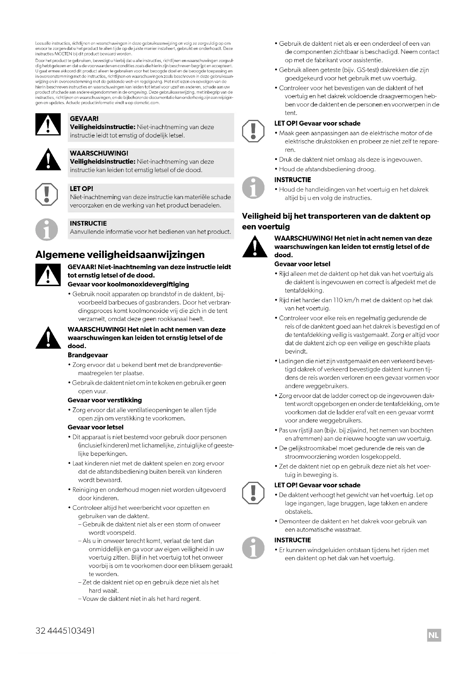 - Er kunnen windgeluiden ontstaan tijdens het rijden met een daktent op het dak van het voertuig. GEVAAR! Veiligheidsinstructie: Niet-inachtneming van deze instructie leidt tot ernstig of dodelijk letsel. WAARSCHUWING! Veiligheidsinstructie: Niet-inachtneming van deze instructie kan leiden tot ernstig letsel of de dood. LET OP! Niet-inachtneming van deze instructie kan materiële schade veroorzaken en de werking van het product benadelen. INSTRUCTIE Aanvullende informatie voor het bedienen van het product.NL
