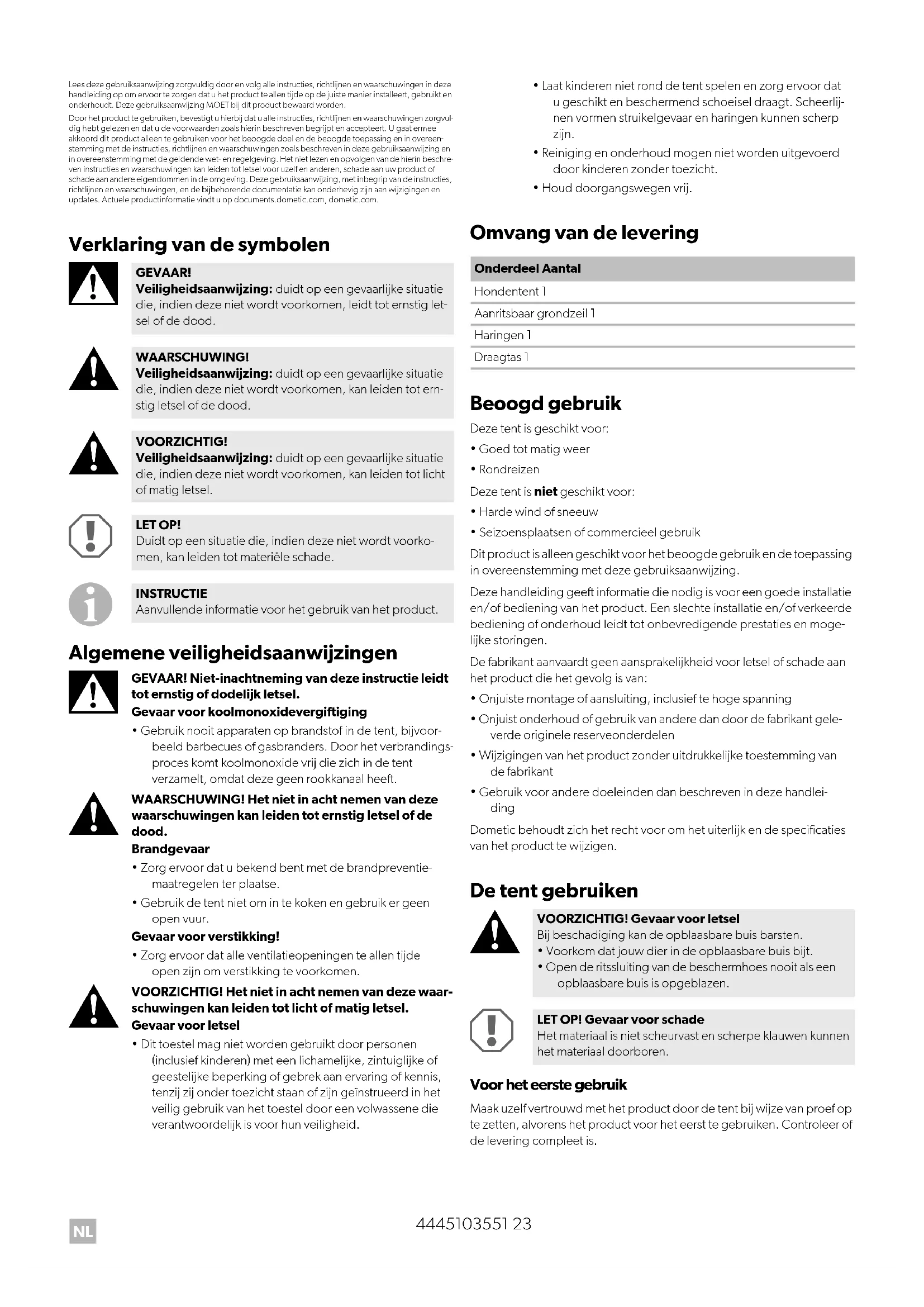 - Gebruik voor andere doeleinden dan beschreven in deze handlei- ding Dometic behoudt zich het recht voor om het uiterlijk en de specificaties van het product te wijzigen. De tent gebruiken