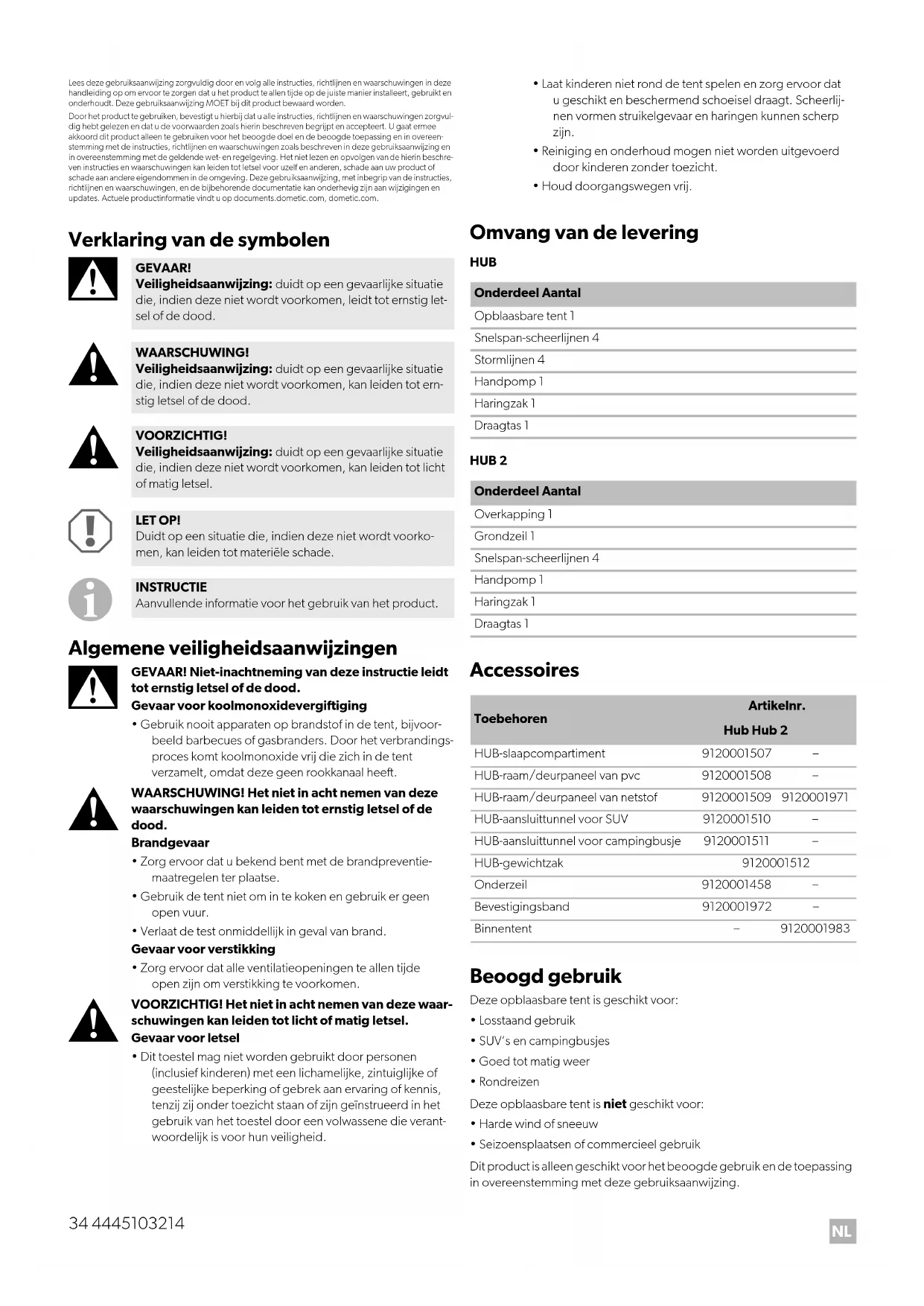 - Seizoensplaatsen of commercieel gebruik Dit product is alleen geschikt voor het beoogde gebruik en de toepassing in overeenstemming met deze gebruiksaanwijzing. GEVAAR! Veiligheidsaanwijzing: duidt op een gevaarlijke situatie die, indien deze niet wordt voorkomen, leidt tot ernstig let- sel of de dood. WAARSCHUWING! Veiligheidsaanwijzing: duidt op een gevaarlijke situatie die, indien deze niet wordt voorkomen, kan leiden tot ern- stig letsel of de dood. VOORZICHTIG! Veiligheidsaanwijzing: duidt op een gevaarlijke situatie die, indien deze niet wordt voorkomen, kan leiden tot licht of matig letsel. LET OP! Duidt op een situatie die, indien deze niet wordt voorko- men, kan leiden tot materiële schade. INSTRUCTIE Aanvullende informatie voor het gebruik van het product. Onderdeel Aantal Opblaasbare tent 1 Snelspan-scheerlijnen 4 Stormlijnen 4 Handpomp 1 Haringzak 1 Draagtas 1 Onderdeel Aantal Overkapping 1 Grondzeil 1 Snelspan-scheerlijnen 4 Handpomp 1 Haringzak 1 Draagtas 1 Toebehoren Artikelnr. Hub Hub 2 HUB-slaapcompartiment 9120001507 – HUB-raam/deurpaneel van pvc 9120001508 – HUB-raam/deurpaneel van netstof 9120001509 9120001971 HUB-aansluittunnel voor SUV 9120001510 – HUB-aansluittunnel voor campingbusje 9120001511 – HUB-gewichtzak 9120001512 Onderzeil 9120001458 – Bevestigingsband 9120001972 – Binnentent – 9120001983NL