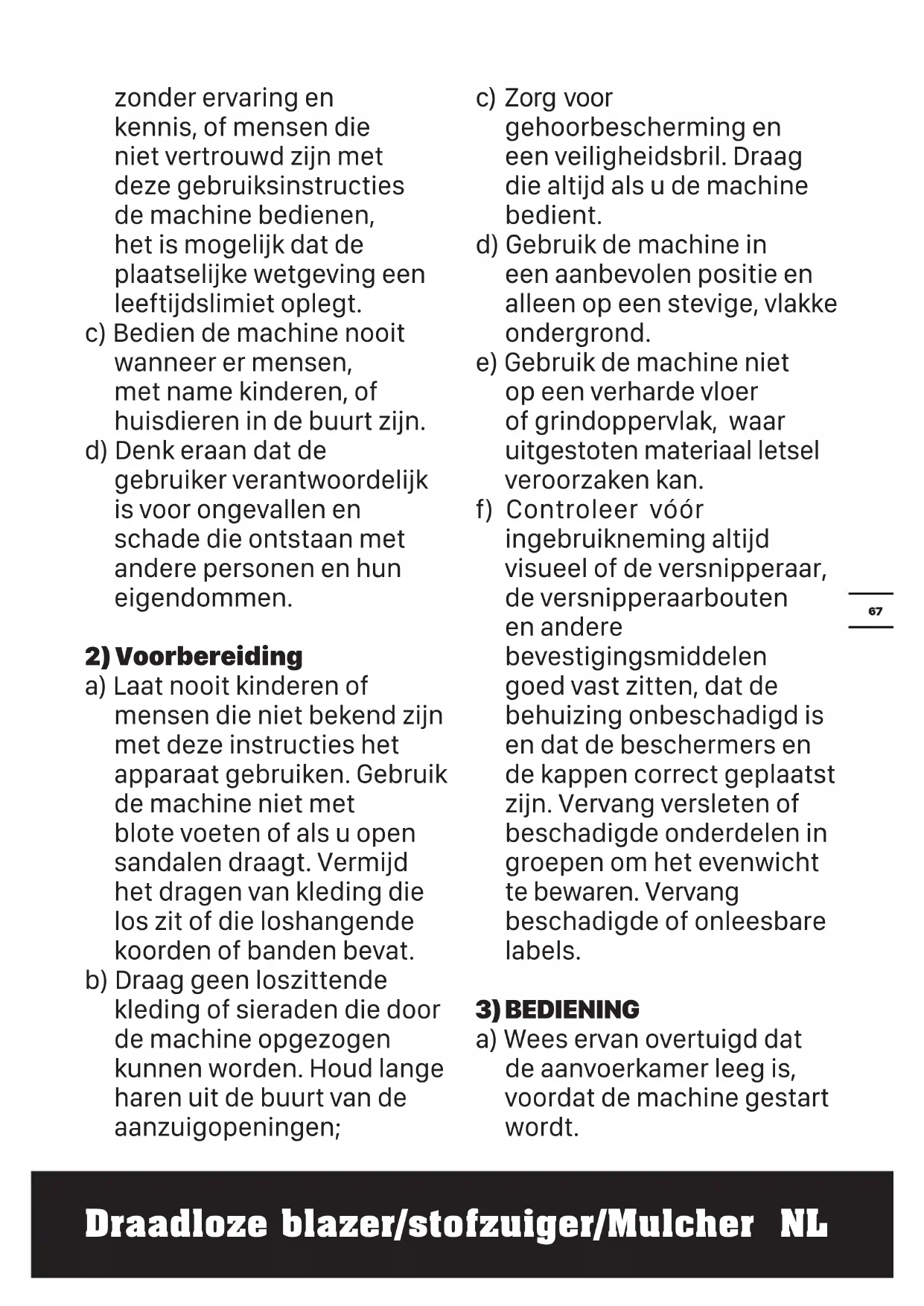 a) Lees de instructies zorgvuldig door. Maak uzelf bekend met de bediening en het juiste gebruik van het apparaat. b) Laat nooit kinderen, personen met verminderde fysieke, sensorische of mentale vaardigheden, of67 Draadloze blazer/stofzuiger/Mulcher NL zonder ervaring en kennis, of mensen die niet vertrouwd zijn met deze gebruiksinstructies de machine bedienen, het is mogelijk dat de plaatselijke wetgeving een leeftijdslimiet oplegt. c) Bedien de machine nooit wanneer er mensen, met name kinderen, of huisdieren in de buurt zijn. d) Denk eraan dat de gebruiker verantwoordelijk is voor ongevallen en schade die ontstaan met andere personen en hun eigendommen.
