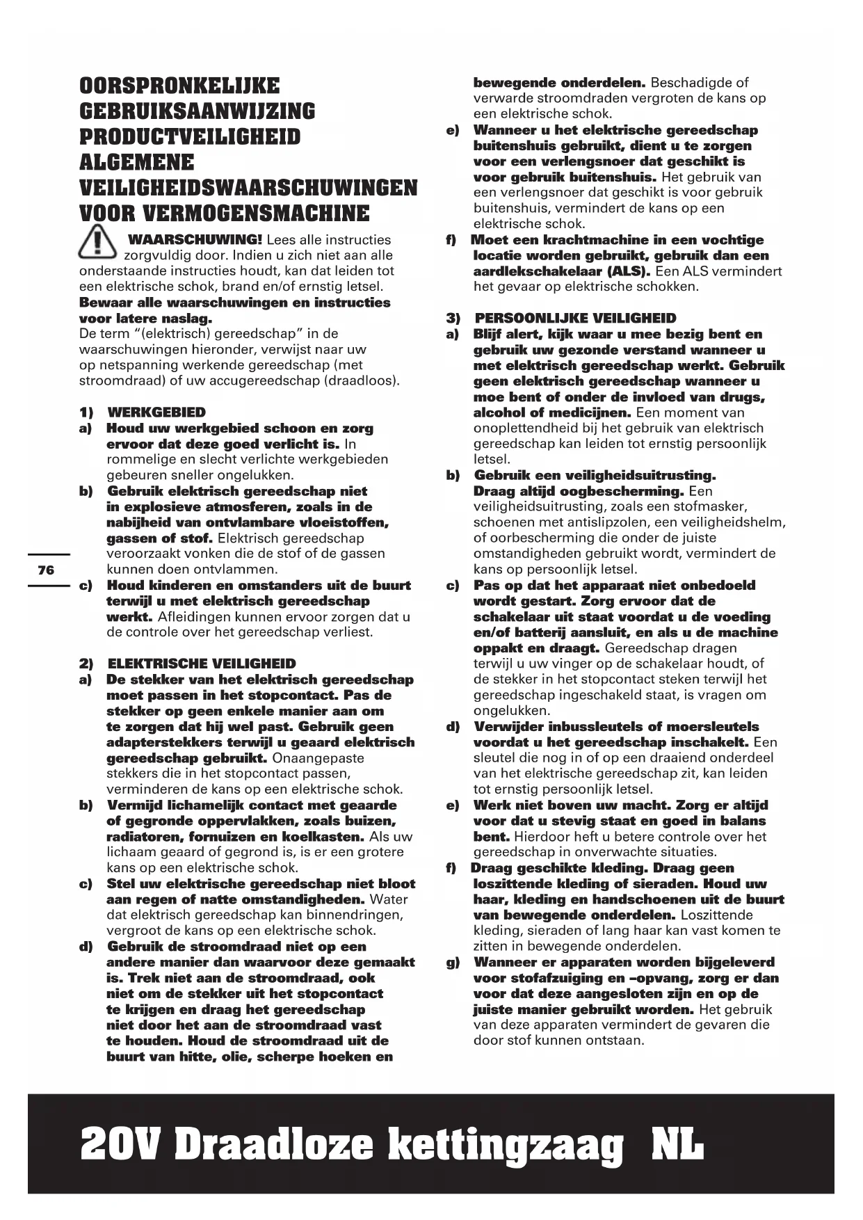 20V Draadloze kettingzaag NL OORSPRONKELIJKE GEBRUIKSAANWIJZING PRODUCTVEILIGHEID ALGEMENE VEILIGHEIDSWAARSCHUWINGEN VOOR VERMOGENSMACHINE WAARSCHUWING! Lees alle instructies zorgvuldig door. Indien u zich niet aan alle onderstaande instructies houdt, kan dat leiden tot een elektrische schok, brand en/of ernstig letsel. Bewaar alle waarschuwingen en instructies voor latere naslag. De term “(elektrisch) gereedschap” in de waarschuwingen hieronder, verwijst naar uw op netspanning werkende gereedschap (met stroomdraad) of uw accugereedschap (draadloos).