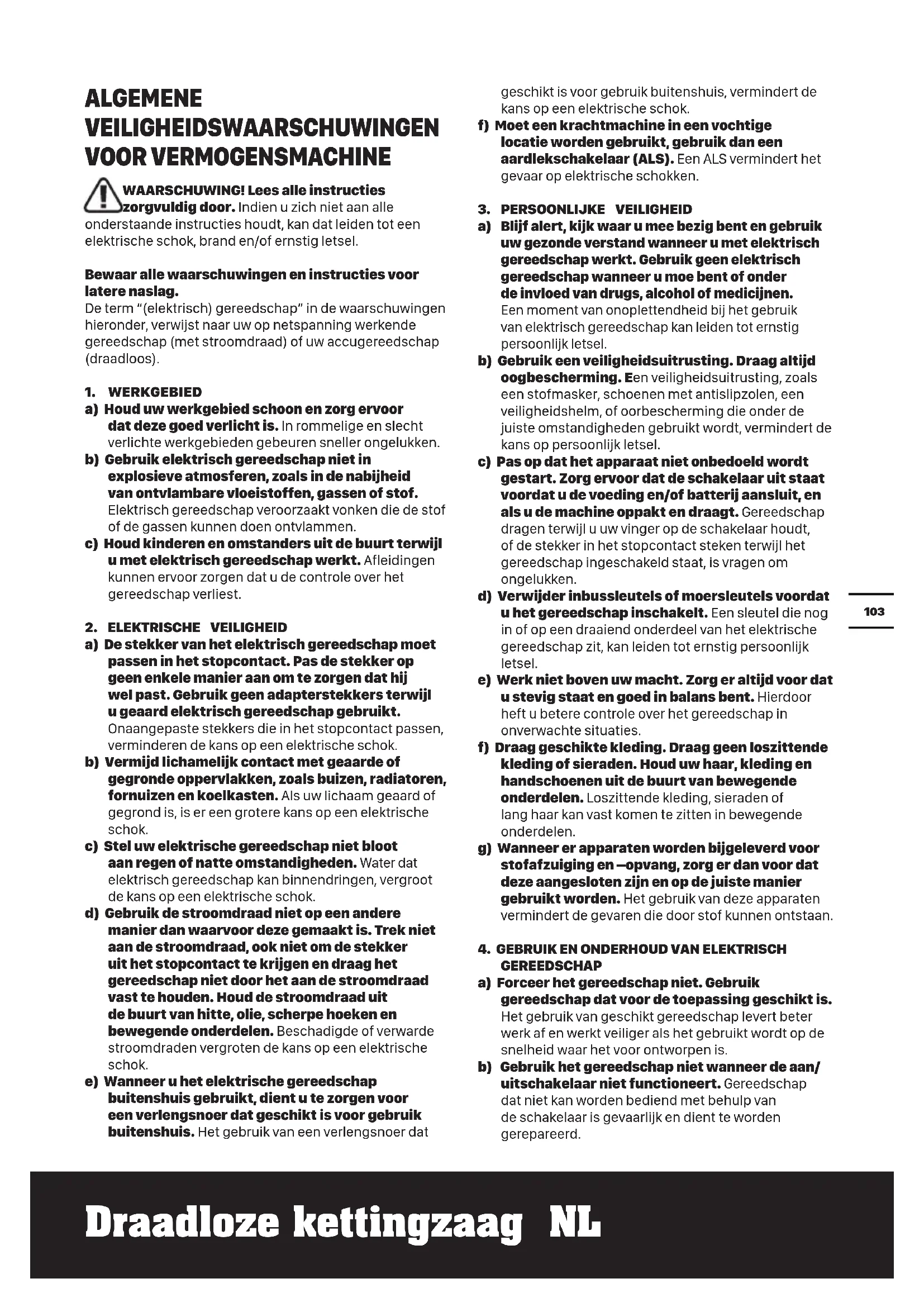 - Nível de Volume de Som Medido 95.2 dB(A) - Nível de Volume de Som Garantido 96 dB(A) Normas em conformidade com: EN 60745-1 EN 60745-2-13 EN ISO 3744 EN 55014-1 EN 55014-2 Peças de EN ISO11680-1 Pessoa autorizada a compilar o ficheiro técnico, Nome: Marcel Filz Endereço: Positec Germany GmbH Grüner Weg 10, 50825 Cologne, Germany 2020/04/22 Allen Ding Engenheiro-chefe adjunto, Teste e Certificação Positec Technology (China) Co., Ltd. 18, Dongwang Road, Suzhou Industrial Park, Jiangsu 215123, P. R. China103 Draadloze kettingzaag NL ALGEMENE VEILIGHEIDSWAARSCHUWINGEN VOOR VERMOGENSMACHINE WAARSCHUWING! Lees alle instructies zorgvuldig door. Indien u zich niet aan alle onderstaande instructies houdt, kan dat leiden tot een elektrische schok, brand en/of ernstig letsel. Bewaar alle waarschuwingen en instructies voor latere naslag. De term “(elektrisch) gereedschap” in de waarschuwingen hieronder, verwijst naar uw op netspanning werkende gereedschap (met stroomdraad) of uw accugereedschap (draadloos).