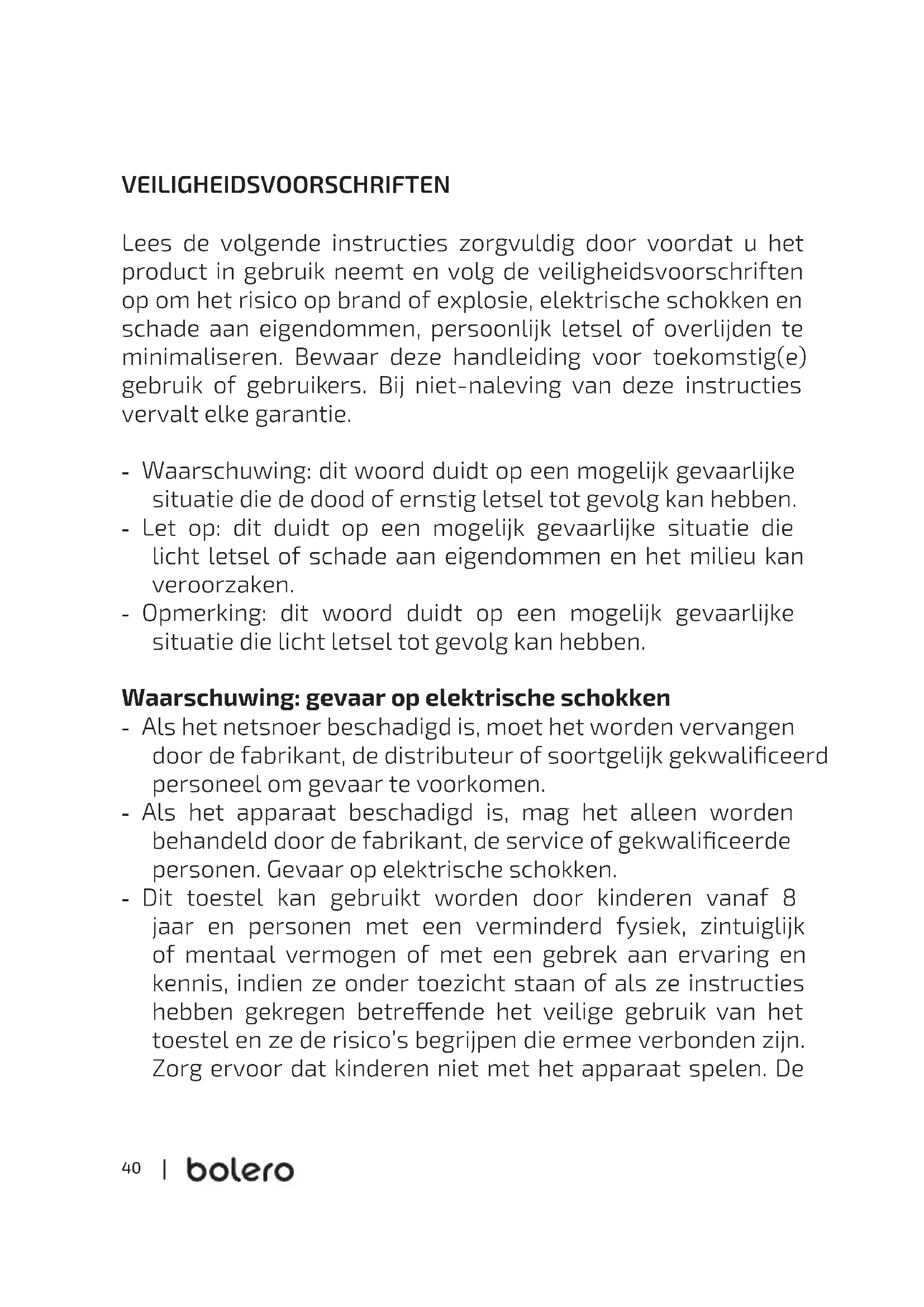 não será responsável por danos causados por pessoas não autorizadas. Transporte - Antes de transportar o produto, é necessário colocar os parafusos de volta na máquina e escorrer a água acumulada para fora da máquina. - O dispositivo é muito pesado. Transporte-o com cuidado. Não segurar o aparelho pelas partes salientes para o levantar. Não utilizar a porta da máquina como maçaneta. Utilização recomendada - O produto é apenas para uso doméstico e cargas moderadas, e foi concebido apenas para lavar roupa lavável na máquina. Instalar a máquina dentro de casa, numa sala bem ventilada. Este produto não foi concebido para ser instalado como um aparelho incorporado. - Não instalar a máquina de lavar em áreas húmidas. - Qualquer outra utilização será considerada uma utilização indevida. A Cecotec não será responsável por quaisquer danos ou lesões daí resultantes. 02380_Bolero DressCode Top 80 Inverter_Manual_YV_01220209.indd 3902380_Bolero DressCode Top 80 Inverter_Manual_YV_01220209.indd 39 10/2/22 9:4310/2/22 9:4340 VEILIGHEIDSVOORSCHRIFTEN Lees de volgende instructies zorgvuldig door voordat u het product in gebruik neemt en volg de veiligheidsvoorschriften op om het risico op brand of explosie, elektrische schokken en schade aan eigendommen, persoonlijk letsel of overlijden te minimaliseren. Bewaar deze handleiding voor toekomstig(e) gebruik of gebruikers. Bij niet-naleving van deze instructies vervalt elke garantie. - Waarschuwing: dit woord duidt op een mogelijk gevaarlijke situatie die de dood of ernstig letsel tot gevolg kan hebben. - Let op: dit duidt op een mogelijk gevaarlijke situatie die licht letsel of schade aan eigendommen en het milieu kan veroorzaken. - Opmerking: dit woord duidt op een mogelijk gevaarlijke situatie die licht letsel tot gevolg kan hebben. Waarschuwing: gevaar op elektrische schokken - Als het netsnoer beschadigd is, moet het worden vervangen door de fabrikant, de distributeur of soortgelijk gekwaliceerd personeel om gevaar te voorkomen. - Als het apparaat beschadigd is, mag het alleen worden behandeld door de fabrikant, de service of gekwaliceerde personen. Gevaar op elektrische schokken. - Dit toestel kan gebruikt worden door kinderen vanaf 8 jaar en personen met een verminderd fysiek, zintuiglijk of mentaal vermogen of met een gebrek aan ervaring en kennis, indien ze onder toezicht staan of als ze instructies hebben gekregen betreende het veilige gebruik van het toestel en ze de risico’s begrijpen die ermee verbonden zijn. Zorg ervoor dat kinderen niet met het apparaat spelen. De 02380_Bolero DressCode Top 80 Inverter_Manual_YV_01220209.indd 4002380_Bolero DressCode Top 80 Inverter_Manual_YV_01220209.indd 40 10/2/22 9:4310/2/22 9:4341
