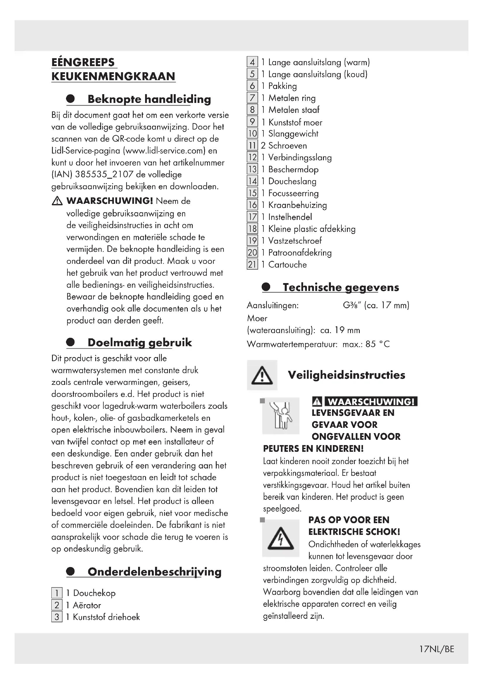 met de hand vast. Plaats de instelhendel [] terug op de kraanbehuizing []. Draai de vastzetschroef [] met de klok mee vast met behulp van de inbussleutel. Druk de kleine plastic afdekking [] in de opening. Draai de hoofdwaterkraan open en controleer de temperatuurbegrenzing. Bediening Ingebruikname Tip: Als de uitrusting gedurende een lange periode niet werd gebruikt, spoel de leidingen grondig om stagnatie en ophoping van resten in de drinkwatervoorziening te vermijden. Open de watervoorziening. Til de instelhendel [] op en draai deze naar rechts of links om de snelheid of temperatuur van de waterstroom te regelen. Controleer de werking van de menger. Zet om dit te doen de instelhendel [] in alle mogelijke standen. Controleer regelmatig van alle verbindingen of ze stevig vast zitten. Waterbesparingsfunctie De cartouche [] van deze armatuur beschikt over een waterbesparingsfunctie. Deze functie beperkt de hoeveelheid water die door de kraan stroomt. Dit betekent dat u tot 50% water besparen kunt (zie afb.K). Trek de instelhendel [] naar boven totdat u enige weerstand voelt. Deze weerstand leidt bij een gedeeltelijke openstaan tot een stop en beperkt zodoende de hoeveelheid water die uit de kraan komt. Wilt u dat er meer water uit de kraan komt, oefen dan een lichte druk uit op de instelhendel [] tot de weerstand verdwenen is. Energiespaarfunctie De cartouche [] van deze armatuur beschikt over een energiebesparingsfunctie. Als de instelhendel [] in de middelste stand wordt gezet, komt er alleen koud water uit de kraan. Het energieverbruik wordt zodoende verminderd (zie afb.L). Onderhoud en reiniging Armatuur onderhouden en reinigen Houd er a.u.b. rekening mee dat sanitaire armaturen speciaal onderhoud vergen. Neem daarom de volgende instructies in acht: Gebruik geen bijtende of alcoholhoudende middelen voor de reiniging, omdat deze het product kunnen beschadigen. Reinig uw armaturen alleen met schoon water, een mild reinigingsmiddel en een zachte doek c.q. zeemleer. Schroef de aërator [2] regelmatig los en verwijder kalkhoudende resten of vreemde objecten. Bij het niet in acht nemen van de onderhoudsinstructies dient u rekening te houden met beschadigingen aan het oppervlak. In dit geval komen de garantieclaims te vervallen.20 NL/BE Afvoer De verpakking bestaat uit milieuvriendelijke grondstoffen die u via de plaatselijke recyclingcontainers kunt afvoeren. Informatie over de mogelijkheden om het uitgediende product na gebruik te verwijderen, verstrekt uw gemeentelijke overheid. Informatie Drinkbaarheid van leidingwater Informeer bij uw gemeente over de drinkbaarheid van het water in uw stad / gemeente. Principieel gelden de volgende adviezen voor de drinkbaarheid: Laat water uit leidingen even lopen als het langer dan vier uur in de leidingen heeft gestaan. Gebruik geen stagnatiewater voor het bereiden van voeding en drank, vooral niet bij het voeden van zuigelingen. Anders kan gevaar voor de gezondheid ontstaan. Vers water kunt u daaraan herkennen dat het duidelijk kouder uit de leiding komt dan stagnatiewater. Gebruik geen stagnatiewater uit verchroomde leidingen voor de voeding en / of lichamelijke verzorging wanneer u allergisch op nikkel reageert. Dergelijk water kan sterk nikkelhoudend zijn en een allergische reactie veroorzaken. Gebruik geen drinkwater uit loden leidingen voor de bereiding van voeding voor zuigelingen en / of voor de bereiding van levensmiddelen tijdens de zwangerschap. Lood wordt aan het drinkwater afgegeven en is vooral voor zuigelingen en kleine kinderen uiterst schadelijk voor de gezondheid.21PL JEDNOUCHWYTOWA BATERIA KUCHENNA Krótka instrukcja Niniejszy dokument jest skróconą, wydrukowaną wersją kompletnej instrukcji obsługi. Zeskanowanie kodu QR przeniesie Cię bezpośrednio na stronę serwisu Lidl (www.lidl-service.com) i po wpisaniu numeru artykułu (IAN) 385535_2107 będziesz mógł/a obejrzeć i pobrać pełną instrukcję obsługi.