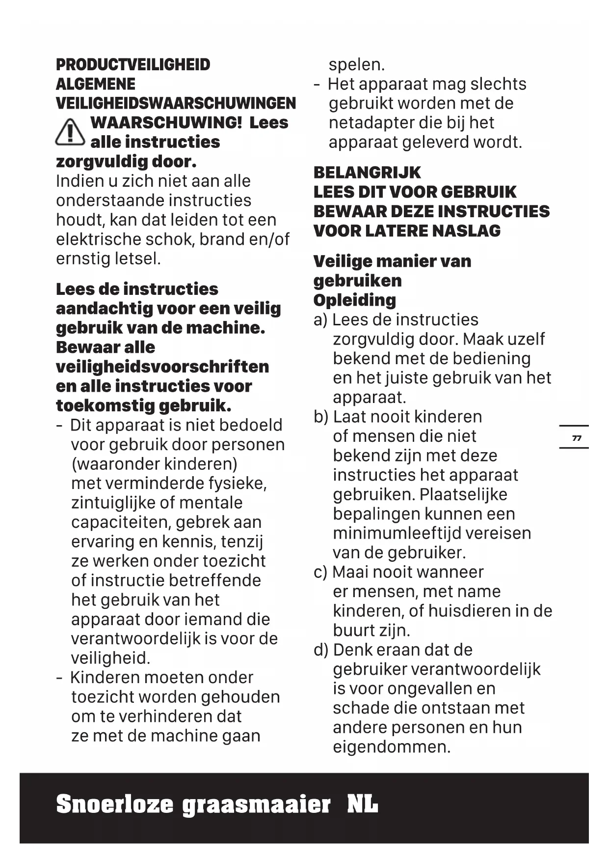 Veilige manier van gebruiken Opleiding a) Lees de instructies zorgvuldig door. Maak uzelf bekend met de bediening en het juiste gebruik van het apparaat. b) Laat nooit kinderen of mensen die niet bekend zijn met deze instructies het apparaat gebruiken. Plaatselijke bepalingen kunnen een minimumleeftijd vereisen van de gebruiker. c) Maai nooit wanneer er mensen, met name kinderen, of huisdieren in de buurt zijn. d) Denk eraan dat de gebruiker verantwoordelijk is voor ongevallen en schade die ontstaan met andere personen en hun eigendommen.78 Snoerloze graasmaaier NL Voorbereiding a) Draag bij het maaien altijd stevige schoenen en een lange broek. Gebruik dit apparaat niet wanneer u op blote voeten of op open sandalen/slippers loopt. b) Inspecteer de omgeving van de gebruikte apparatuur en verwijder alle voorwerpen die door de machine weggeworpen zouden kunnen worden; c) Controleer voor het gebruik altijd of de messen, de bouten waarmee de messen vastzitten en het snijgedeelte niet versleten of beschadigd zijn. Vervang versleten of beschadigde messen en bouten in paren om zo de balans te bewaren. Vervang beschadigde en onleesbare labels. Bediening a) Maai alleen overdag of in goed kunstlicht. b) Gebruik het apparaat, voor zover mogelijk, niet in nat gras. c) Zorg er op hellingen altijd voor dat u stevig staat. d) Loop, ren niet; e) Een ronddraaiende machine op wielen gebruikt u evenwijdig aan hellingen, niet op en neer; f) Wees extra voorzichtig wanneer u op hellingen van richting verandert. g) Maai niet op zeer steile hellingen. h) Wees extra voorzichtig wanneer u het apparaat achteruit of naar u toe haalt.
