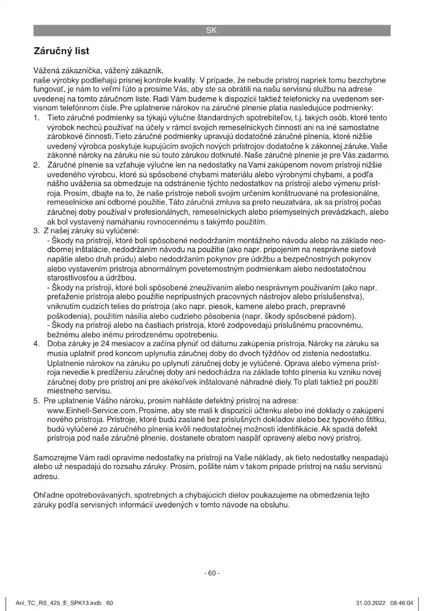 www.Einhell-Service.com. Houd het aankoopbewijs of een ander bewijs van uw aankoop van het ni- euwe apparaat bij de hand. Apparaten die zonder bijhorende bewijzen of zonder typeplaatje worden teruggestuurd, worden op grond van de ontbrekende mogelijkheid om het apparaat toe te kennen uitgesloten van de garantieprestatie. Valt het defect van het apparaat binnen onze garantieprestatie, dan bezorgen wij u per omgaande een gerepareerd of nieuw apparaat terug. Uiteraard staan wij ook tot u dienst om, mits betaling van de kosten, defecten van het apparaat te ver- helpen die buiten de garantieomvang vallen. Te dien einde stuurt u het apparaat aan ons serviceadres op. Voor slijtstukken, verbruiksmateriaal en ontbrekende onderdelen wordt verwezen naar de beperkingen van deze garantie conform de service-informatie van deze handleiding. Anl_TC_RS_425_E_SPK13.indb 67Anl_TC_RS_425_E_SPK13.indb 67 31.03.2022 08:46:0731.03.2022 08:46:07E