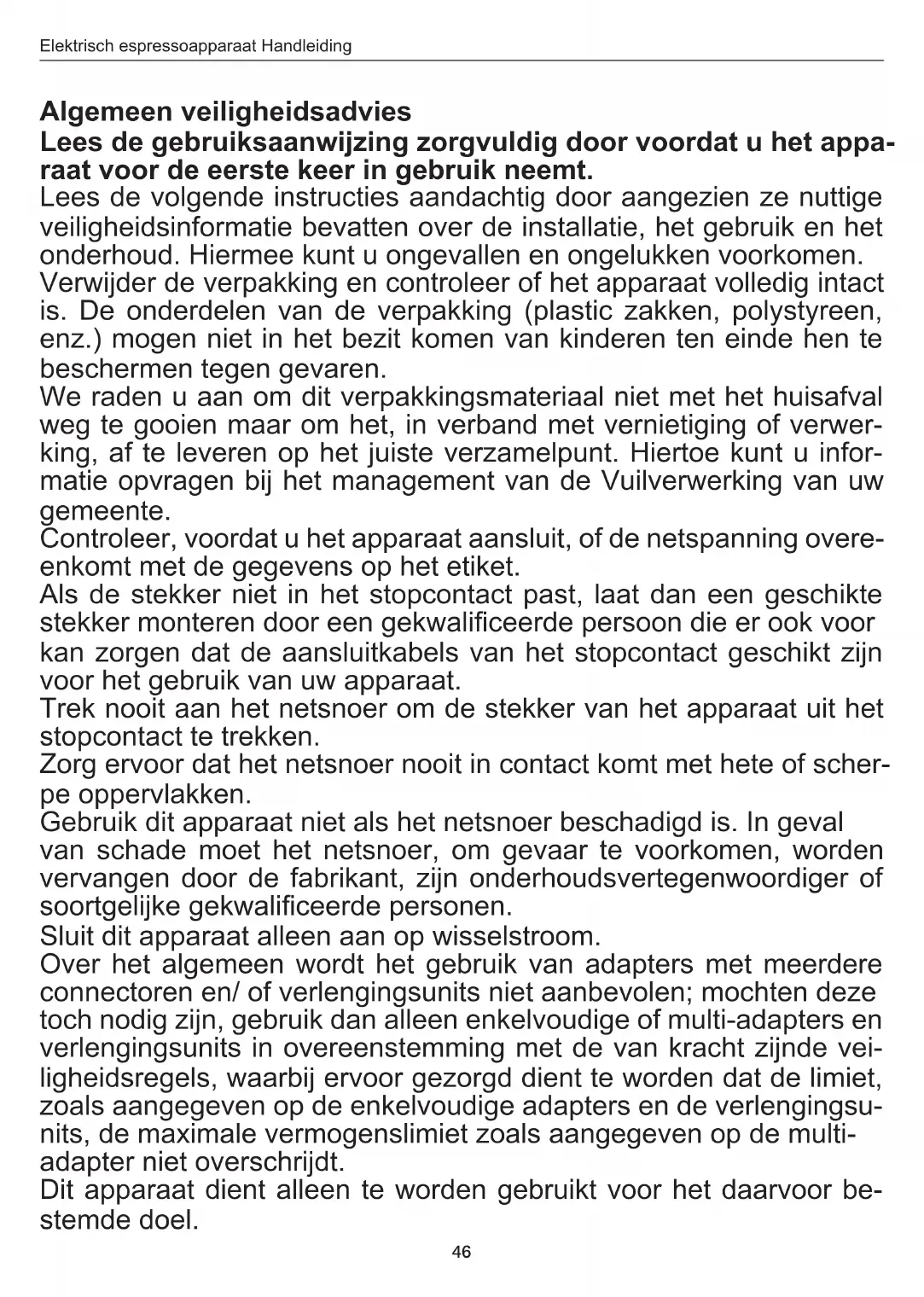 Dit apparaat dient alleen te worden gebruikt voor het daarvoor be- stemde doel. Elk ander gebruik moet als ongepast en dus gevaarlijk worden be- schouwd. De fabrikant kan niet aansprakelijk worden gesteld voor schade die voortvloeit uit onjuist, verkeerd of onzorgvuldig gebruik. Om elk risico op oververhitting te voorkomen, wordt aangeraden het netsnoer volledig af te rollen en het apparaat los te koppelen wanne- er het niet wordt gebruikt. Haal de stekker altijd uit het stopcontact voordat u het apparaat scho- onmaakt. Ter voorkoming van elektrische schokken mag u het snoer, de stekker of onderdelen van het apparaat niet onderdompelen in water of an- dere vloeistoffen. Raak het apparaat niet aan met natte handen of voeten. Raak het apparaat niet aan met blote voeten. Stel het apparaat niet bloot aan weersinvloeden zoals regen, wind, sneeuw en hagel. Gebruik het apparaat niet in de buurt van explosieven, licht ontvlam- bare stoffen, gassen, vuur en kachels. Sta niet toe dat kinderen, mensen met een handicap, of mensen zon- der ervaring of technische bekwaamheid het apparaat zonder be- geleiding gebruiken. Wanneer een apparaat door of in de buurt van kinderen wordt gebruikt is nauwgezet toezicht noodzakelijk. Zorg ervoor dat kinderen niet met dit apparaat gaan spelen. Als u van plan bent om het apparaat nooit meer te gebruiken, maak het dan onbruikbaar door de voedingskabel door te snijden nadat u de stekker uit het stopcontact heeft gehaald. Zorg er ook voor dat alle gevaarlijke onderdelen onbruikbaar worden gemaakt, met name met het oog op kinderen die met het apparaat zouden kun- nen gaan spelen.48 Elektrisch espressoapparaat Handleiding Veiligheidswaarschuwingen Deze machine is gemaakt om “kofe te maken”. Gebruik nooit an- dere extracten, cacaopoeder, kamille, andere infusies of oplosbare stoffen: deze kunnen de gaten in het lter blokkeren. Dompel tijdens het reinigen nooit de bodem en de ketel onder in water: dit is een elektrisch apparaat. Zorg ervoor dat u zich niet verbrandt door water of stoom te sproeien of door verkeerd gebruik van het toestel. Raak bij gebruik van het toestel de hete oppervlakken niet aan. Ge- bruik de knoppen of handgrepen. Vul de ketel met water voordat u het kofezetapparaat op de steun- voet plaatst. Laat de stroomkabel tijdens het gebruik niet in contact komen met de metalen onderdelen van het kofezetapparaat. De steunbasis en de ketel worden zeer heet tijdens het gebruik, raak deze onderdelen niet aan om het risico van verbranding te vermijden. Til het deksel niet op terwijl het kofezetapparaat draait; wacht enke- le minuten na het uitschakelen voordat u het deksel optilt, omdat het plotseling vrijkomen van stoom brandwonden kan veroorzaken. Laat de stekker niet onnodig in het stopcontact zitten, haal altijd de stekker uit het stopcontact als u de kofemachine niet gebruikt. Trek niet aan het netsnoer om de stekker uit het stopcontact te halen. Als het snoer beschadigd is, moet het worden vervangen door erken- de centra. Dompel het kofezetapparaat niet onder in water of andere vloeistof- fen en laat geen vloeistoffen binnendringen. Stel het kofezetapparaat niet bloot aan vochtbronnen en gebruik het niet buitenshuis. Bij het binnendringen van vloeistoffen in het kofe- zetapparaat moet de stekker onmiddellijk uit het stopcontact worden getrokken en moet het kofezetapparaat door gekwaliceerd perso- neel worden gerepareerd. Raak het kofezetapparaat en het netsnoer niet met natte handen aan. Het kofezetapparaat is uitsluitend bestemd voor thuisgebruik, niet voor commercieel gebruik.49 Elektrisch espressoapparaat Handleiding