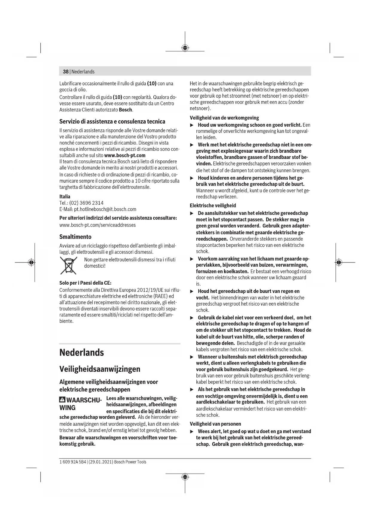Het in deze gebruiksaanwijzing vermelde trillingsniveau en de geluidsemissiewaarde zijn gemeten met eengenormeer- de meetmethode en kunnen worden gebruikt om elektrische gereedschappen met elkaar te vergelijken. Ze zijn ook ge- schikt voor een voorlopige inschatting van de trillings- en ge- luidsemissie. Het aangegeven trillingsniveau en de aangegeven ge- luidsemissiewaarde representeren de voornaamste toepas- singen van het elektrische gereedschap. Wanneer het elek- trische gereedschap echter wordt gebruikt voor andere toe- passingen, met afwijkende inzetgereedschappen of onvol- doende onderhoud, dan kunnen het trillingsniveau en de ge- luidsemissiewaarde afwijken. Dit kan de trillings- en ge- luidsemissie gedurende de gehele arbeidsperiode duidelijk verhogen. Voor een nauwkeurige schatting van de trillings- en ge- luidsemissies moet ook rekening worden gehouden met de tijden waarin het gereedschap uitgeschakeld is, of waarin het gereedschap wel loopt, maar niet werkelijk wordt ge- bruikt. Dit kan de trillings- en geluidsemissies gedurende de gehele arbeidsperiode duidelijk verminderen. Leg aanvullende veiligheidsmaatregelen ter bescherming van de gebruiker tegen het effect van trillingen vast, zoals: onderhoud van elektrische gereedschappen en inzetgereed- schappen, warm houden van de handen, organisatie van het arbeidsproces. Montage u Trek vóór werkzaamheden aan het elektrische gereed- schap altijd de stekker uit het stopcontact. Zaagblad bevestigen of vervangen u Draag werkhandschoenen bij de montage of het wis- selen van het inzetgereedschap. Accessoires zijn scherp en kunnen bij langer gebruik heet worden. Zaagblad kiezen Een overzicht van geadviseerde zaagbladen vindt u aan het einde van deze gebruiksaanwijzing. Plaats alleen zaagbladen met enkele nokkenschacht (T-schacht). Het zaagblad mag niet langer zijn dan nodig is voor de gewenste zaagsnede. Gebruik voor het zagen van nauwe bochten een smal zaag- blad. Zaagblad monteren (zieafbeeldingA) u Reinig de schacht van het zaagblad vóór het bevesti- gen. Een vervuilde schacht kan niet stevig bevestigd wor- den. Schuif het zaagblad (11), met de tanden in zaagrichting, tot het vastklikken in de zaagbladopname (9). Let er bij het bevestigen van het zaagblad op dat de rug van het zaagblad in de groef van het steunwiel (10) ligt. u Controleer of het zaagblad stevig vastzit. Een los zaag- blad kan uit de zaaghouder vallen en kan u verwonden. Zaagblad verwijderen (zie afbeeldingB) Schuif de zaagbladopname (9) in pijlrichting naar boven en verwijder het zaagblad (11). Antisplinterplaatje (zieafbeeldingC) Het antisplinterplaatje (15) (accessoire) kan het versplinte- ren van het oppervlak bij het zagen van hout verhinderen. Het antisplinterplaatje kan alleen bij bepaalde zaagbladtypes en alleen bij een zaaghoek van 0° gebruikt worden. Duw het antisplinterplaatje (15) van onderaf in de voetplaat (7). Afzuiging van stof en spanen Stof van materialen zoals loodhoudende verf, enkele hout- soorten, mineralen en metaal kan schadelijk voor de gezond- heid zijn. Aanraking of inademing van stof kan leiden tot al- lergische reacties en/of luchtwegaandoeningen bij de ge- bruiker of personen die zich in de omgeving bevinden. Bepaalde soorten stof, bijvoorbeeld van eiken- en beuken- hout, gelden als kankerverwekkend, in het bijzonder in com- binatie met additieven voor houtbehandeling (chromaat en houtbeschermingsmiddelen). Asbesthoudend materiaal mag alleen door gespecialiseerde vakmensen worden be- werkt. – Gebruik indien mogelijk een voor het materiaal geschikte stofafzuiging. – Zorg voor een goede ventilatie van de werkplek. – Er wordt geadviseerd om een stofmasker met filterklasse P2 te dragen. Neem de in uw land geldende voorschriften voor de te be- werken materialen in acht. u Vermijd ophoping van stof op de werkplek. Stof kan gemakkelijk ontbranden. Afdekkap Monteer de afdekkap (13), voordat u het elektrische gereed- schap op een stofafzuiging aansluit. Plaats de afdekkap (13) zodanig op het elektrische gereed- schap dat de houders in de uitsparingen van de behuizing vastklikken. Neem de afdekkap (13) voor werkzaamheden zonder stofaf- zuiging en voor verstekzagen weg. Druk daarvoor de afdek- kap ter hoogte van de buitenste houders samen en trek deze naar voren weg. Bosch Power Tools 1 609 92A 5B4 | (29.01.2021)42 | Nederlands Stofafzuiging aansluiten Steek een afzuigslang (5) (accessoire) op de afzuigaanslui- ting (6). Verbind de afzuigslang (5) met een stofzuiger (ac- cessoire). Een overzicht voor aansluiting op verschillende stofzuigers vindt u aan het einde van deze gebruiksaanwijzing. Gebruik voor een optimale afzuiging indien mogelijk het anti- splinterplaatje (15). De stofzuiger moet geschikt zijn voor het te bewerken mate- riaal. Gebruik bij het afzuigen van voor de gezondheid bijzonder gevaarlijk, kankerverwekkend of droog stof een speciale zui- ger. Gebruik Modi u Trek vóór werkzaamheden aan het elektrische gereed- schap altijd de stekker uit het stopcontact. Pendelbeweging instellen Dankzij de in vier standen instelbare pendelbeweging kun- nen zaagsnelheid, zaagcapaciteit en zaagbeeld optimaal aan- gepast worden aan het te bewerken materiaal. Met de instelhendel (8) kunt u de pendelbeweging ook tij- dens het gebruik instellen. Stand0 geen pendelbeweging StandI kleine pendelbeweging StandII gemiddelde pendelbeweging StandIII grote pendelbeweging De optimale pendelbeweging voor de gewenste toepassing kunt u proefondervindelijk bepalen. Daarbij gelden de vol- gende adviezen: – Hoe fijner en zuiverder de zaagrand moet worden, hoe kleiner de pendelbeweging ingesteld moet worden, of de- ze moet eventueel helemaal uitgeschakeld worden. – Schakel bij de bewerking van dunne materialen (bijv. pla- ten) de pendelbeweging uit. – Werk in harde materialen (bijv. staal) met een kleine pen- delbeweging. – In zachte materialen en bij het zagen van hout in de rich- ting van de nerf kunt u met maximale pendelbeweging werken. Verstekhoe