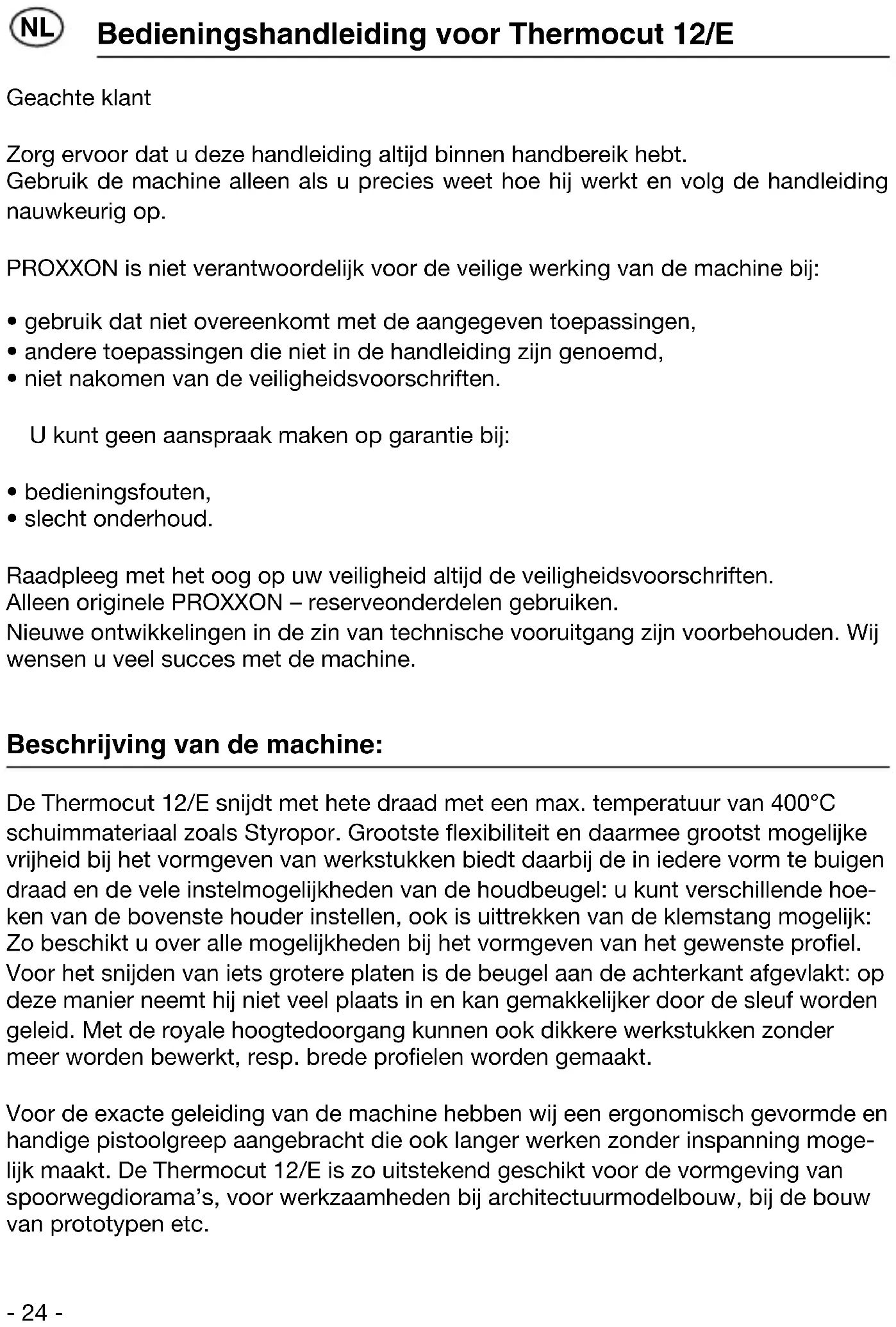 Fecha: 21. Noviembre 2008 Ing.Dipl. Jörg Wagner PROXXON S.A. - 23 -- 24 - Bedieningshandleiding voor Thermocut 12/E Geachte klant Zorg ervoor dat u deze handleiding altijd binnen handbereik hebt. Gebruik de machine alleen als u precies weet hoe hij werkt en volg de handleiding nauwkeurig op. PROXXON is niet verantwoordelijk voor de veilige werking van de machine bij: