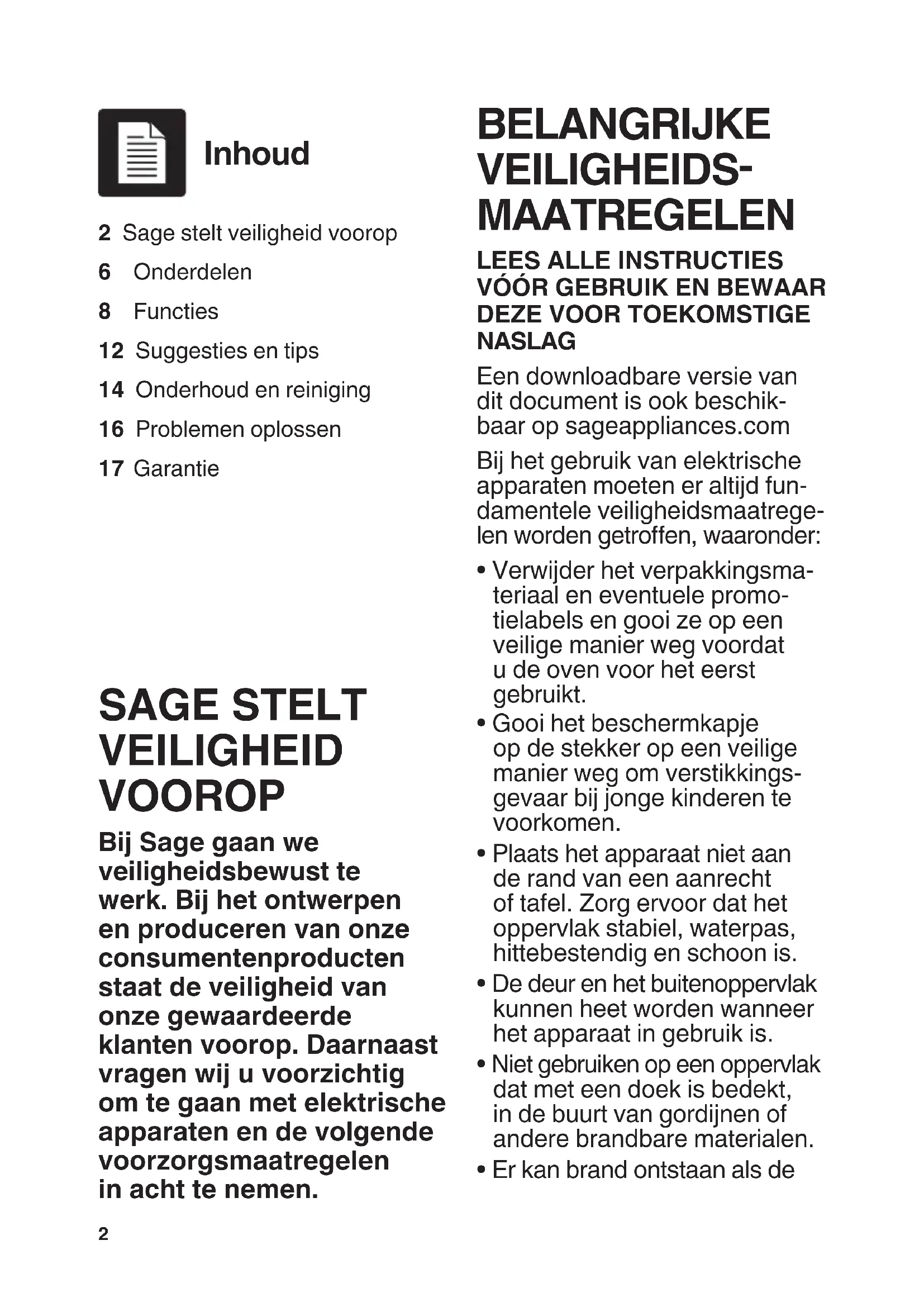 - Er kan brand ontstaan als de Inhoud SAGE STELT VEILIGHEID VOOROP Bij Sage gaan we veiligheidsbewust te werk. Bij het ontwerpen en produceren van onze consumentenproducten staat de veiligheid van onze gewaardeerde klanten voorop. Daarnaast vragen wij u voorzichtig om te gaan met elektrische apparaten en de volgende voorzorgsmaatregelen in acht te nemen. 2 Sage stelt veiligheid voorop 6 Onderdelen 8 Functies 12 Suggesties en tips 14 Onderhoud en reiniging 16 Problemen oplossen 17 Garantie3