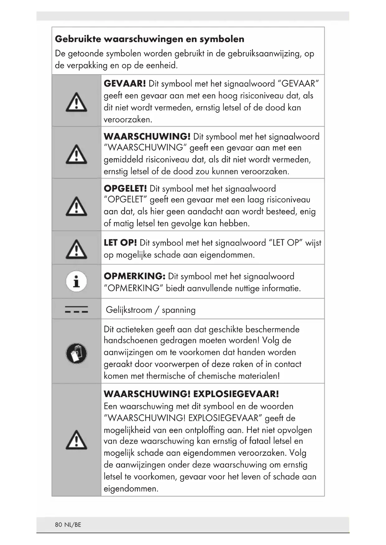 ONGELUKKEN VOOR KINDEREN! GEVAAR! VERSTIKKINGSGEVAAR! Laat kinderen nooit zonder toezicht achter met het verpakkingsmateriaal. Het verpakkingsmateriaal vormt een verstikkingsrisico. Kinderen onderschatten deze gevaren. Het verpakkingsmateriaal is geen speelgoed. Dit product mag worden gebruikt door kinderen van 8 jaar of ouder en door personen met beperkte fysieke of geestelijke capaciteiten of zonder ervaring en/of kennis, zolang ze onder toezicht staan of instructie krijgen in het veilige gebruik van het product en de bijbehorende risico's begrijpen. Laat kinderen niet spelen met het product. Onderhoud en reiniging mogen niet door kinderen worden uitgevoerd zonder toezicht. Het product is geen speelgoed. GEVAAR! Een aantal van de geleverde onderdelen kan worden ingeslikt. Neem direct contact op met een arts als per ongeluk een onderdeel is ingeslikt. WAARSCHUWING! Radiostoringen Schakel het product uit in vliegtuigen, ziekenhuizen of in de nabijheid van medische elektronische systemen. De overgebrachte draadloze signalen kunnen de werking van gevoelige elektronica beïnvloeden. Houd het product ten minste 20 cm uit de buurt van pacemakers of implanteerbare cardioverter-defilibratoren, omdat de elektromagnetische straling de werking van pacemakers kan beïnvloeden.83 NL/BE De afgegeven radiogolven kunnen interferentie veroorzaken in gehoorapparaten. Plaats of gebruik het product niet in de buurt van brandbare gassen of mogelijk explosieve gebieden (zoals schilderwerkplaatsen) met de draadloze componenten ingeschakeld, omdat de afgegeven radiogolven explosies en brand kunnen veroorzaken. Het bereik van de radiogolven is afhankelijk van de omgeving. In het geval van draadloze gegevensoverdracht kan niet worden uitgesloten dat ongeautoriseerde derden de gegevens ontvangen. Het product mag niet worden gebruikt in een omgeving met explosiegevaar of in de buurt van ontstekers. GEVAAR! Houd batterijen/oplaadbare batterijen buiten het bereik van kinderen. Neem direct contact op met een arts als ze per ongeluk zijn ingeslikt. Inslikken kan leiden tot brandwonden, perforatie van zacht weefsel en de dood. Ernstige brandwonden kunnen plaatsvinden binnen 2 uur na inslikken. WAARSCHUWING! EXPLOSIEGEVAAR! Probeer nooit gewone batterijen opnieuw op te laden. Maak geen kortsluiting met batterijen/oplaadbare accu's en maak ze niet open. Dit kan leiden tot oververhitting, brand of openscheuren. Gooi batterijen/oplaadbare accu's nooit in vuur of water. Oefen geen mechanische belasting uit op batterijen. De werking met batterijen/oplaadbare batterijen kan alleen plaatsvinden in uitzonderlijke situaties. De batterijen/oplaadbare batterijen moeten direct na gebruik worden verwijderd uit de radio. Als niet-oplaadbare batterijen worden gebruikt, mag de walkie talkie niet in het oplaadstation worden geplaatst. De walkie talkie heeft ook een USB-laadpoort. Als niet-oplaadbare batterijen worden gebruikt, mogen deze nooit worden aangesloten op de USB-lader via de laadpoort. Risico van lekkage van batterijen/oplaadbare accu's Voorkom extreme omstandigheden in de omgeving en temperaturen die invloed kunnen hebben op batterijen/oplaadbare accu's, zoals verwarmingen / rechtstreeks zonlicht. In geval van lekkende batterijen/oplaadbare accu's, moet u deze direct uit het product verwijderen om schade te voorkomen. Vermijd contact van lekkende chemicaliën met de huid, ogen en slijmvliezen. In geval van contact met accuzuur het aangetaste gebied grondig spoelen met voldoende schoon water en roep onmiddellijk medische hulp in.84 NL/BE DRAAG BESCHERMENDE HANDSCHOENEN! Lekkende of beschadigde batterijen/oplaadbare accu's kunnen brandwonden veroorzaken bij contact met de huid. Draag altijd geschikte beschermende handschoenen als een dergelijk geval optreedt. Batterijen/ oplaadbare accu's Alle batterijen/oplaadbare accu's moeten altijd op hetzelfde moment te worden vervangen. Plaats batterijen/oplaadbare accu's volgens de polariteitstekens (+) en (-) op de batterij/oplaadbare accu en het product. Maak de contacten van de batterijen/oplaadbaar accu's en in het batterij/oplaadbare accu-vak schoon voordat u deze plaatst! Verwijder lege batterijen/oplaadbare accu's onmiddellijk uit het product. Gebruik alleen het opgegeven type batterijen/oplaadbare accu's! Het gebruik van de verkeerde batterijen / oplaadbare batterijen kan het beschermingsapparaat van het product beschadigen of vernietigen. Het gebruik van lithiumbatterijen/oplaadbare batterijen moet worden verboden. Verwijder de batterij/oplaadbare accu als het product voor langere tijd niet gebruikt zal worden. Onjuist gebruik kan explosies en levensgevaar veroorzaken. Gooi geen batterijen/oplaadbare accu's in het vuur of in een hete oven, breek of snijd batterijen/oplaadbare accu's niet. Er bestaat explosiegevaar. Een batterij achterlaten in een omgeving met een extreem hoge temperatuur kan leiden tot een explosie of lekkage van brandbare vloeistof of gas. Een batterij onderworpen aan extreem lage luchtdruk, wat kan leiden tot een explosie of lekkage van brandbare vloeistof of gas. LET OP! GEVAAR VAN SCHADE AAN EIGENDOMMEN Plotselinge temperatuurwijzigingen kunnen condensatie binnen het product veroorzaken. Laat het product in dat geval enige tijd acclimatiseren voordat u het gebruikt om kortsluiting te voorkomen. Gebruik het product niet in de buurt van warmtebronnen, zoals radiatoren of andere apparaten die warmte afgeven. Werp het product niet in het vuur en stel het niet bloot aan hoge temperaturen. Open het product nooit. Het bevat geen interne onderdelen die onderhoud behoeven.85 NL/BE Dit product voldoet aan de IPX4-bescherming tegen spatwater, maar mag niet worden ondergedompeld in water of andere vloeistoffen. Plaats het product niet in de buurt van verpakkingen met water of andere vloeistoffen. WAARSCHUWING! Zorg ervoor dat: Het product niet wordt gebruikt in de directe omgeving van magnetische velden (zoals luidsprekers). Geen brandhaarden (zoals brandende kaarsen) o
