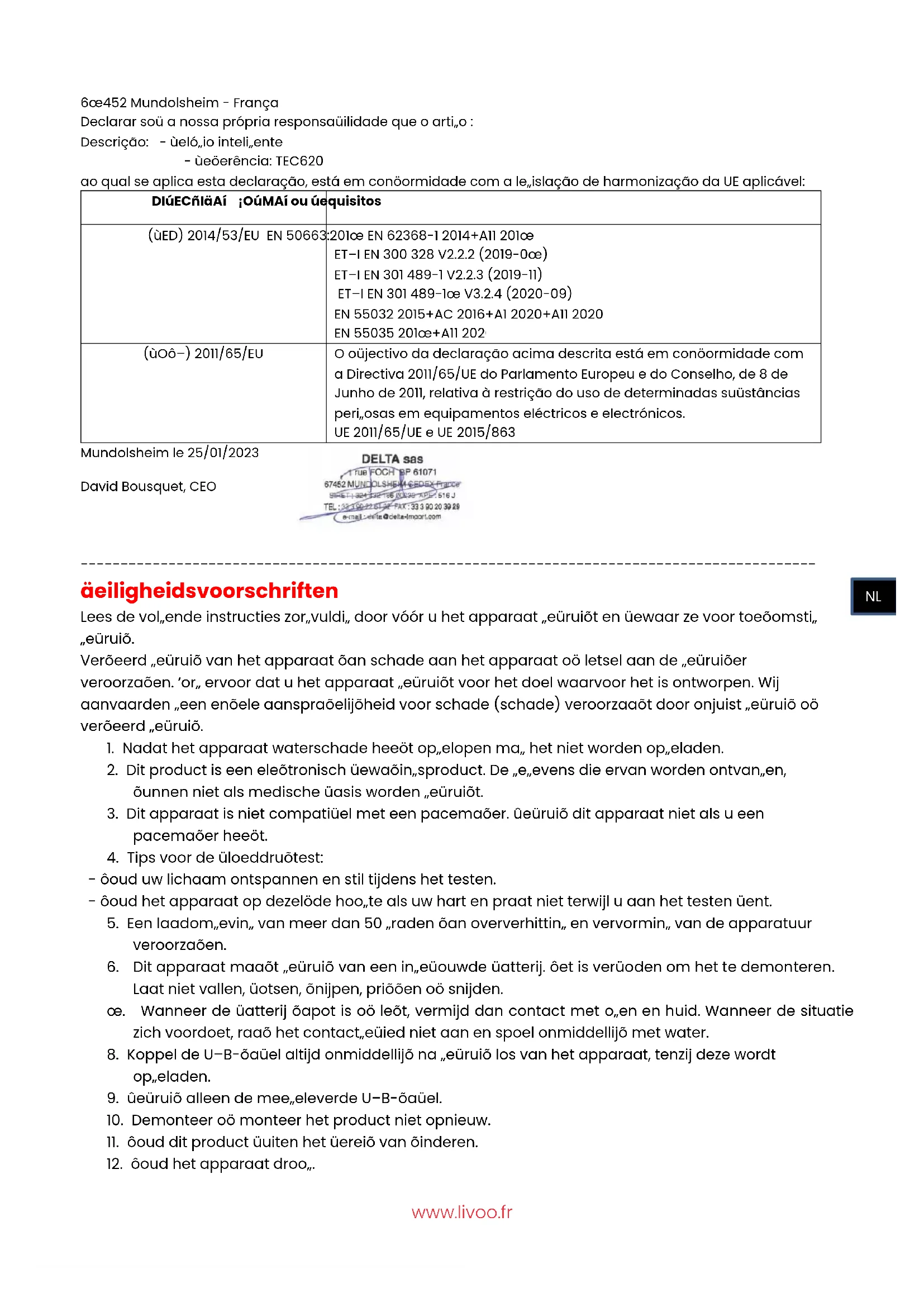 DELTA BP61071www.livoo.fr 67452 Mundolsheim - Frankrijk Verklaren onder eigen verantwoordelijkheid dat het item : Beschrijving: - Smartwatch - Referentie: TEC620 waarop deze verklaring van toepassing is, in overeenstemming is met de toepasselijke harmonisatiewetgeving van de EU: RICHTLIJNEN STANDAARDEN of vereisten (RED) 2014/53/EU EN 50663:2017 EN 62368-1 2014+A11 2017 ETSI EN 300 328 V2.2.2 (2019-07) ETSI EN 301 489-1 V2.2.3 (2019-11) ETSI EN 301 489-17 V3.2.4 (2020-09) EN 55032 2015+AC 2016+A1 2020+A11 2020 EN 55035 2017+A11 2020