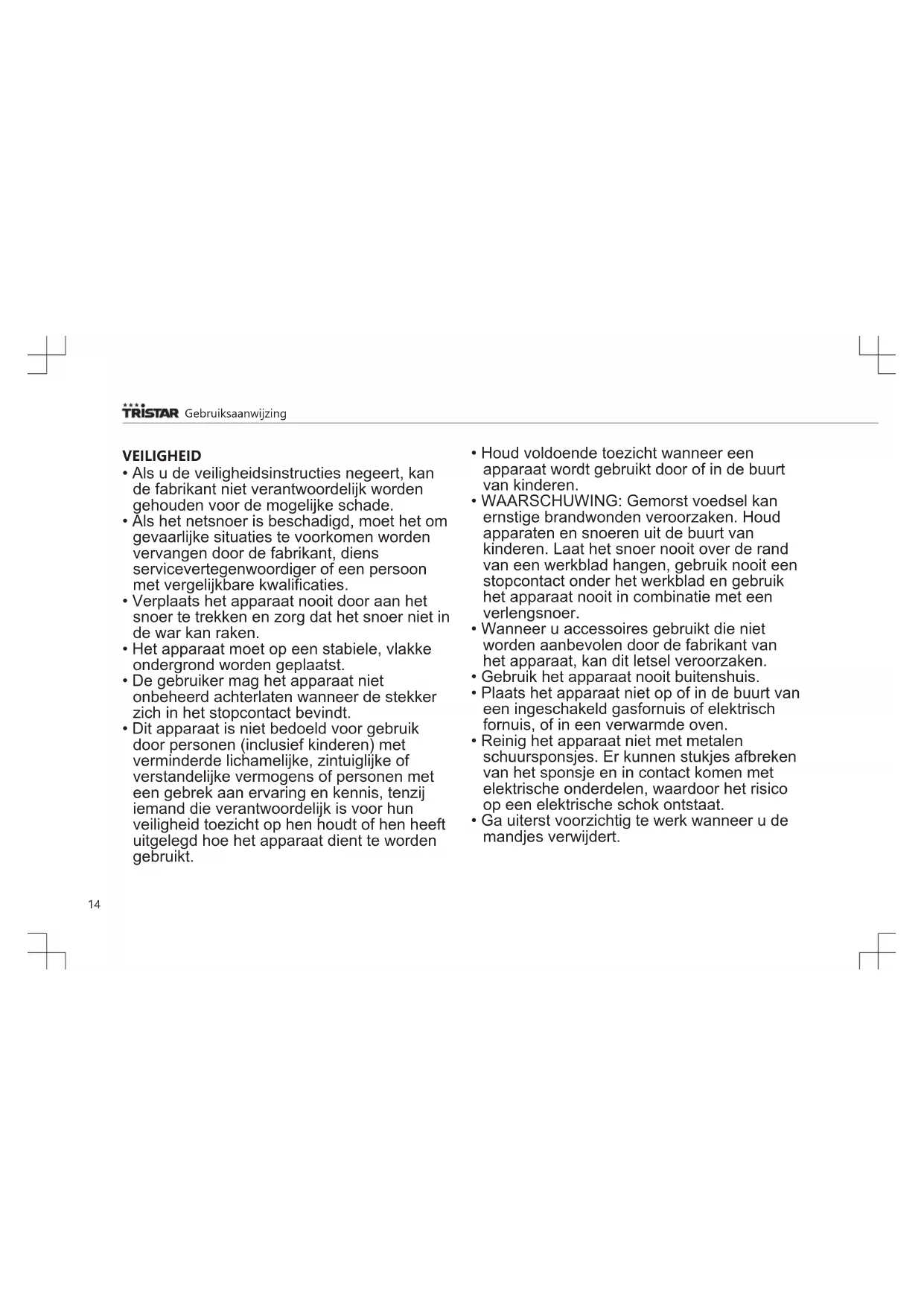 Het apparaat mag niet worden weggegooid met het huisvuil na beëindiging van de nuttige levensduur, maar moet worden ingeleverd op een centraal punt voor de recycling van elektrische en elektrische huishoudelijke apparaten. Dit symbool op het apparaat, in de instructiehandleiding en op de verpakking vestigt de aandacht op dit belangrijke punt. De materialen die in dit apparaat zijn gebruikt kunnen worden gerecycled. Door gebruikte huishoudelijke apparaten te recyclen, draagt u in belangrijke mate bij aan de bescherming van ons milieu. Vraag uw plaatselijke autoriteiten om inlichtingen over het inzamelpunt. Support U kunt alle beschikbare informatie en reserveonderdelen vinden op service.tristar.eu! NLManuel d'instructions