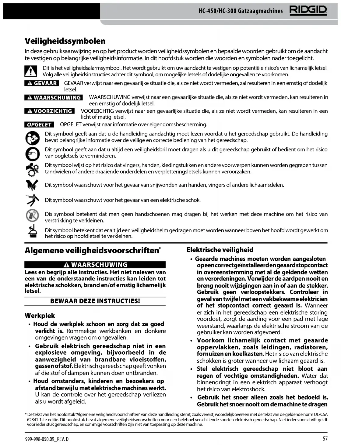 - De tekst van het hoofdstuk “Algemene veiligheidsvoorschriften” van deze handleiding stemt, zoals vereist, woordelijk overeen met de tekst van de geldende norm UL/CSA 62841 1ste editie. Dit hoofdstuk bevat algemene veiligheidsvoorschriften voor een heleboel verschillende soorten elektrisch gereedschap. Niet ieder voorschrift geldt voor ieder stuk gereedschap, en sommige voorschriften zijn niet van toepassing op deze machine.58 HC-450/HC-300 Gatzaagmachines
