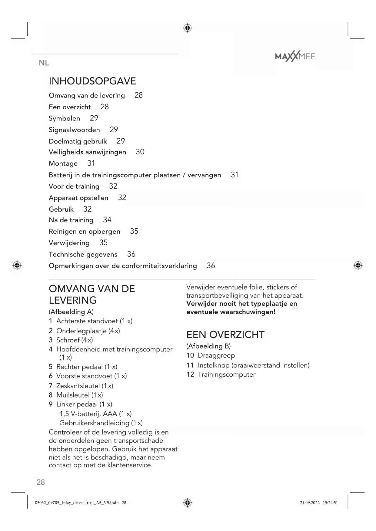 LEVERING (Afbeelding A) 1 Achterste standvoet (1 x) 2 Onderlegplaatje (4 x) 3 Schroef (4 x) 4 Hoofdeenheid met trainingscomputer (1 x) 5 Rechter pedaal (1 x) 6 Voorste standvoet (1 x) 7 Zeskantsleutel (1 x) 8 Muilsleutel (1 x) 9 Linker pedaal (1 x) 1,5 V-batterij, AAA (1 x) Gebruikershandleiding (1 x) Controleer of de levering volledig is en de onderdelen geen transportschade hebben opgelopen. Gebruik het apparaat niet als het is beschadigd, maar neem contact op met de klantenservice. Verwijder eventuele folie, stickers of transportbeveiliging van het apparaat. Verwijder nooit het typeplaatje en eventuele waarschuwingen! EEN OVERZICHT (Afbeelding B) 10 Draaggreep 11 Instelknop (draaiweerstand instellen) 12 Trainingscomputer 05032_09705_Inlay_de-en-fr-nl_A5_V5.indb 2805032_09705_Inlay_de-en-fr-nl_A5_V5.indb 28 21.09.2022 15:24:5121.09.2022 15:24:51mini-trainer
