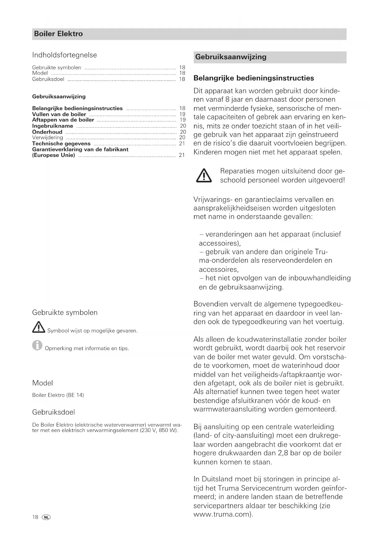 - Garantieverklaring van de fabrikant (Europese Unie) Gebruikte symbolen Symbool wijst op mogelijke gevaren. Opmerking met informatie en tips. Model Boiler Elektro (BE 14) Gebruiksdoel De Boiler Elektro (elektrische waterverwarmer) verwarmt wa- ter met een elektrisch verwarmingselement (230 V, 850 W).19 De bij het apparaat geleverde gele sticker met de waarschuwingen moet door de inbouwfir- ma of de houder van het voertuig op een voor iedere gebruiker goed zichtbare plaats in het voertuig worden aangebracht (bijv. op de kle- dingkastdeur)! Als er stickers ontbreken, kun- nen deze bij Truma worden aangevraagd. Vóór ingebruikname altijd eerst de ge- bruiksaanwijzing lezen en de „belangrijke bedieningsinstructies” in acht nemen! p. 21
