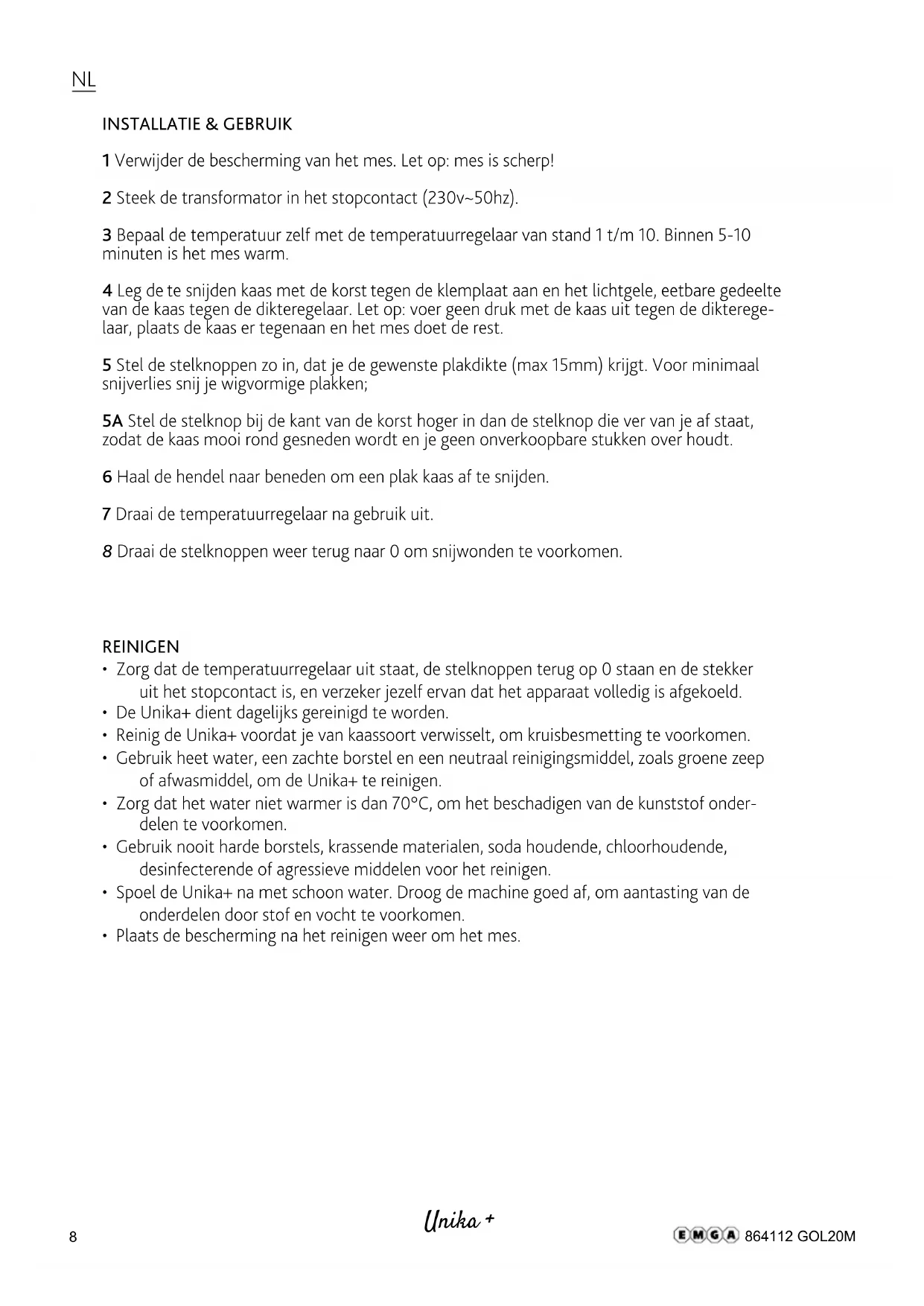 INSTALLATIE & GEBRUIK 1 Verwijder de bescherming van het mes. Let op: mes is scherp! 2 Steek de transformator in het stopcontact (230v~50hz). 3 Bepaal de temperatuur zelf met de temperatuurregelaar van stand 1 t/m 10. Binnen 5-10 minuten is het mes warm. 4 Leg de te snijden kaas met de korst tegen de klemplaat aan en het lichtgele, eetbare gedeelte van de kaas tegen de dikteregelaar. Let op: voer geen druk met de kaas uit tegen de dikterege- laar, plaats de kaas er tegenaan en het mes doet de rest. 5 Stel de stelknoppen zo in, dat je de gewenste plakdikte (max 15mm) krijgt. Voor minimaal snijverlies snij je wigvormige plakken; 5A Stel de stelknop bij de kant van de korst hoger in dan de stelknop die ver van je af staat, zodat de kaas mooi rond gesneden wordt en je geen onverkoopbare stukken over houdt. 6 Haal de hendel naar beneden om een plak kaas af te snijden. 7 Draai de temperatuurregelaar na gebruik uit. 8 Draai de stelknoppen weer terug naar 0 om snijwonden te voorkomen. Unika + Unika + REINIGEN