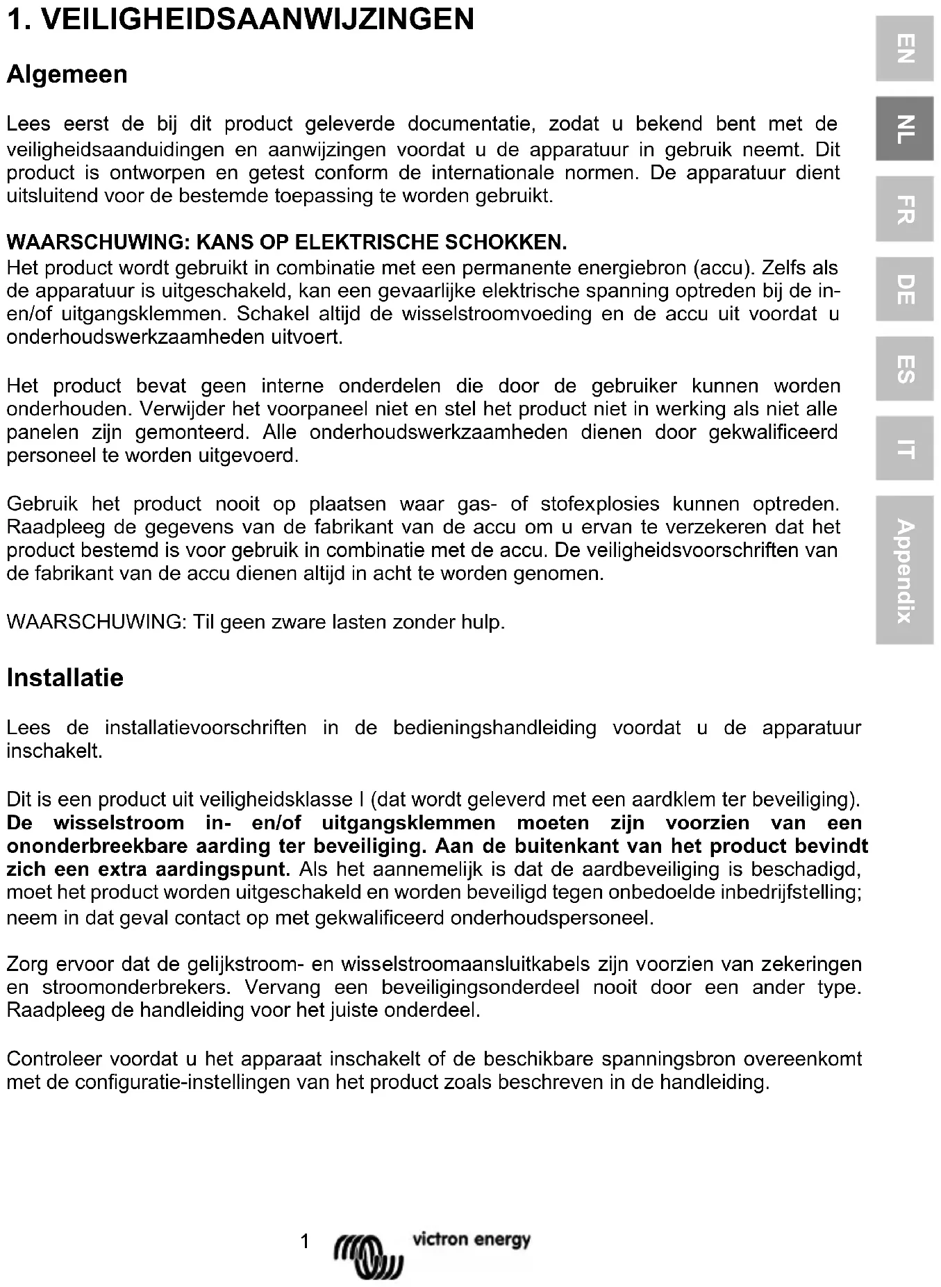 Standaardinstelling: om het product te gebruiken met de schakelaar ‘On/Off/Charger Only’ ds 1: ‘off’ ds 2: ‘on’ De standaardinstelling is vereist bij gebruik van de “On/Off/Charger Only”-schakelaar op het voorpaneel. Deze instelling moet ook worden gebruikt in configuraties met een GX-apparaat of VE.Bus Smart-dongle wanneer er geen extra Digital Multi Control-panel of VE.Bus BMS aangesloten is. Raadpleeg de onderstaande instellingen als er een Digital Multi Control-panel of een VE.Bus BMS is inbegrepen. Instellingen voor bediening op afstand met een Multi Control Panel of een VE.Bus BMS: ds 1: ‘on’ ds 2: ‘off’ Deze instelling is vereist wanneer een Multi Control Panel en/of een VE.Bus BMS is aangesloten. Het Multi Control Panel moet verbonden zijn met één van de twee RJ45-stekkerbussen B, zie bijlage A. Instelling voor afstandsbediening door middel van een 3-wegschakelaar: ds 1: ‘off’ ds 2: ‘off’ Deze instelling is vereist als een 3-wegschakelaar is aangesloten. De 3-wegschakelaar moet aangesloten zijn met klem H, zie bijlage C. Er kan maar één afstandsbediening zijn aangesloten, bijv. een schakelaar of een afstandsbedieningspaneel. In beide gevallen dient de schakelaar op het apparaat zelf op ‘on’ te staan.19 EN NL FR DE ES IT Appendix