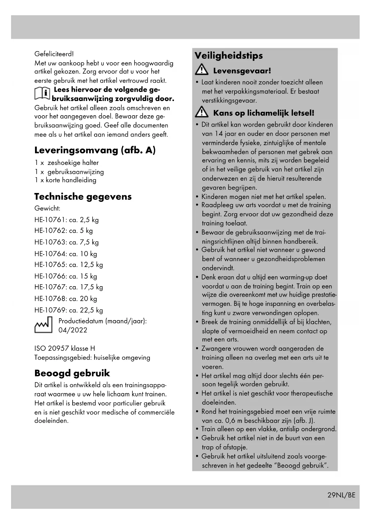 Belangrijk: let er hierbij op dat uw bo- venbenen naast elkaar blijven. Kantel uw bekken naar voren, maar houd uw bovenlichaam rechtop. Opslag, reiniging Bewaar het artikel wanneer u dit niet gebruikt altijd droog en schoon op kamertemperatuur. Reinig het artikel alleen met een vochtige schoonmaakdoek en droog het vervolgens af. BELANGRIJK! Reinig nooit met agressieve reini- gingsmiddelen. Afvalverwerking Voer het artikel en verpakkingsmaterialen in overeenstemming met actuele lokale voor- schriften af. Verpakkingsmaterialen, zoals bv. foliezakjes, horen niet thuis in kinderhanden. Berg het verpakkingsmateriaal buiten het bereik van kinderen op. NL/BE34 Voer de producten en verpakkingen op milieuvriendelijke wijze af. De recyclingcode dient om verschillende materialen te kenmerken ten behoeve van hergebruik via het recyclingproces. De code bestaat uit het recyclingsymbool, dat het recyclingproces weerspiegelt, en een getal dat het materiaal identificeert. Opmerkingen over garantie en serviceafhandeling Het artikel werd met de grootste zorgvuldigheid en onder permanent toezicht geproduceerd. De firma DELTA-SPORT HANDELSKONTOR GmbH verleent particuliere eindklanten op dit artikel drie jaar garantie, te rekenen vanaf de datum van aankoop (garantietermijn) en dit op grond van de volgende bepalingen. De garantie geldt alleen voor materiaal- en verwerkingsfouten. De garantie is niet van toepassing op onderde- len die aan een normale slijtage onderhevig zijn en daarom als niet-slijtvaste onderdelen te beschouwen zijn (bv. batterijen) en evenmin op breekbare onderdelen, bv. schakelaars, accu’s of onderdelen die van glas gemaakt zijn. Uit de garantie voortvloeiende claims zijn uitge- sloten als het artikel onvakkundig, verkeerd of niet in het kader van de voorziene bepaling of in het kader van het voorziene gebruiksdoeleinde gebruikt werd of indien richtlijnen in de gebruiks- aanwijzing niet in acht genomen werden, tenzij de eindklant aantoont dat er sprake is van een materiaal- of verwerkingsfout die niet op één van de hoger vermelde omstandigheden gebaseerd is. Uit de garantie voortvloeiende claims kunnen alleen tijdens de garantieperiode op vertoon van de originele kassabon ingediend wor- den. Gelieve daarom de originele kassabon te bewaren. De garantieperiode wordt door eventuele reparaties op grond van de garantie, wettelijke waarborg of coulance niet verlengd. Dit geldt ook voor vervangen en gerepareerde onderdelen. Gelieve u bij klachten in eerste instantie tot de hieronder vermelde servicehotline te richten of met ons per e-mail contact op te nemen. Is er sprake van een garantiegeval, dan wordt het ar- tikel door ons – naar onze keuze – voor u gratis gerepareerd, wordt het vervangen of wordt de aankoopsom terugbetaald. Verdere rechten op grond van de garantie bestaan niet. Uw wettelijke rechten, in het bijzonder rechten op garantie tegenover de betreffende verkoper, worden door deze garantie niet beperkt. IAN: 404074_2110 (22,5 kg) IAN: 404075_2110 (20 kg) IAN: 404076_2110 (17,5 kg) IAN: 404077_2110 (15 kg) IAN: 404078_2110 (12,5 kg) IAN: 404080_2110 (10 kg) IAN: 404081_2110 (7,5 kg) IAN: 404083_2110 (5 kg) IAN: 404084_2110 (2,5 kg) Service België Tel.: 070 270 171 (0,15 EUR/Min.) E-Mail: deltasport@lidl.be Service Nederland Tel.: 08000249630 E-Mail: deltasport@lidl.nl NL/BE35PL Gratulujemy! Decydując się na ten produkt, otrzymują Pań- stwo towar wysokiej jakości. Należy zapoznać się z produktem przed jego pierwszym użyciem. Należy uważnie przeczytać nastę- pującą instrukcję użytkowania. Produkt ten należy użytkować wyłącznie w opisany sposób oraz zgodnie ze wskazanym przeznaczeniem. Niniejszą instrukcję użytko- wania należy przechowywać w bezpiecznym miejscu. Przekazując produkt innej osobie, należy upewnić się, że otrzyma ona także całą dokumentację dotyczącą produktu. Zakres dostawy (rys. A) 1 x hantle sześciokątne 1 x instrukcja użytkowania 1 x skrócona instrukcja Dane techniczne Waga: HE-10761: ok. 2,5 kg HE-10762: ok. 5 kg HE-10763: ok. 7,5 kg HE-10764: ok. 10 kg HE-10765: ok. 12,5 kg HE-10766: ok. 15 kg HE-10767: ok. 17,5 kg HE-10768: ok. 20 kg HE-10769: ok. 22,5 kg Data produkcji (miesiąc/rok): 04/2022 ISO 20957 Klasa H Obszar zastosowania: w warunkach domowych Użytkowanie zgodne z przeznaczeniem Niniejszy produkt został zaprojektowany jako urządzenie treningowe umożliwiające tre- ning całego ciała. Produkt jest przeznaczony do użytku prywatnego i nie nadaje się do celów medycznych ani komercyjnych. Wskazówki bezpieczeństwa Zagrożenie życia!