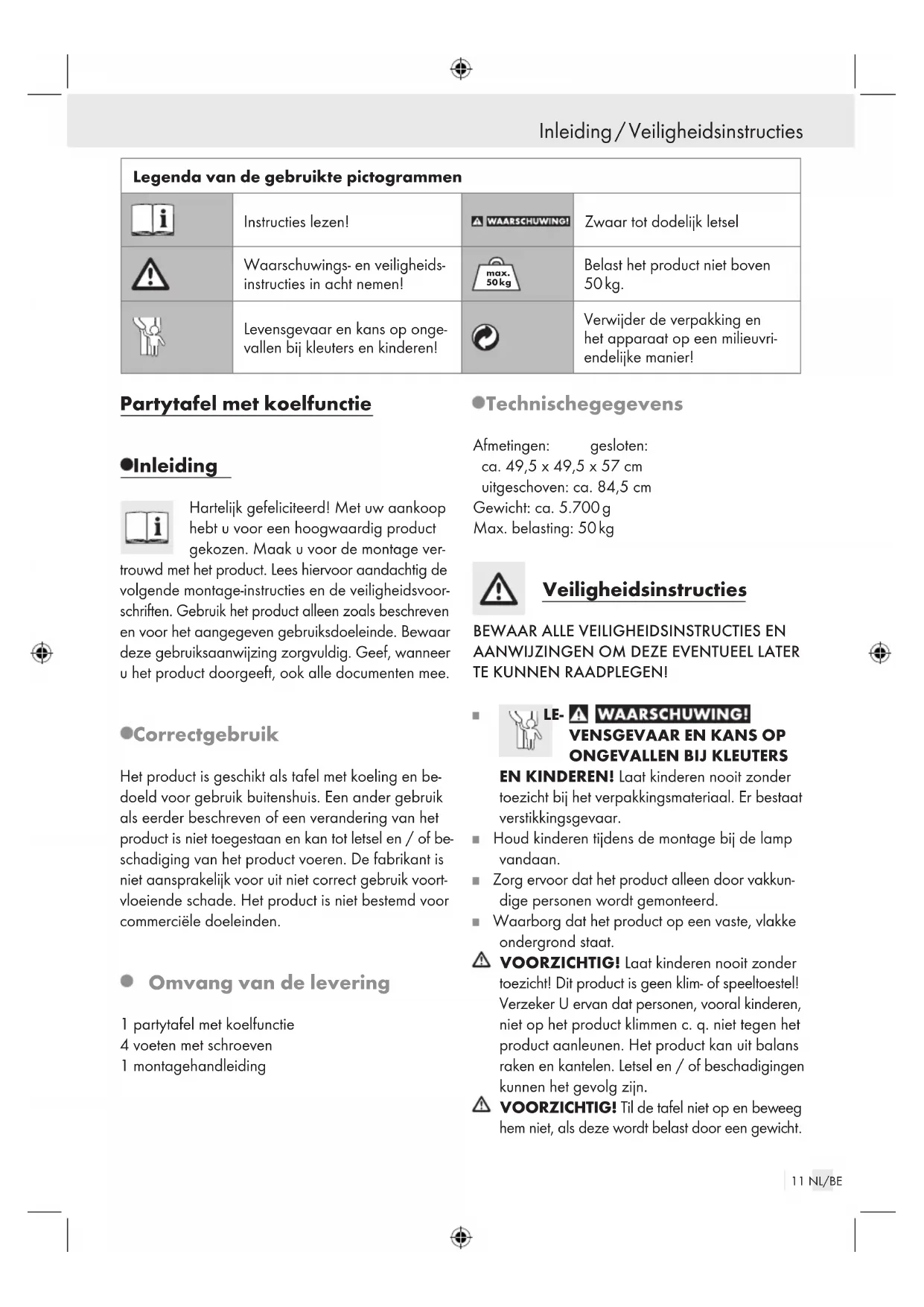 en voor het aangegeven gebruiksdoeleinde. Bewaar deze gebruiksaanwijzing zorgvuldig. Geef, wanneer u het product doorgeeft, ook alle documenten mee. Correct gebruik Het product is geschikt als tafel met koeling en be- doeld voor gebruik buitenshuis. Een ander gebruik als eerder beschreven of een verandering van het product is niet toegestaan en kan tot letsel en / of be- schadiging van het product voeren. De fabrikant is niet aansprakelijk voor uit niet correct gebruik voort- vloeiende schade. Het product is niet bestemd voor commerciële doeleinden. Omvang van de levering 1 partytafel met koelfunctie 4 voeten met schroeven 1 montagehandleiding Technische gegevens Afmetingen: gesloten: ca. 49,5 x 49,5 x 57 cm uitgeschoven: ca. 84,5 cm Gewicht: ca. 5.700 g Max. belasting: 50 kg Veiligheidsinstructies