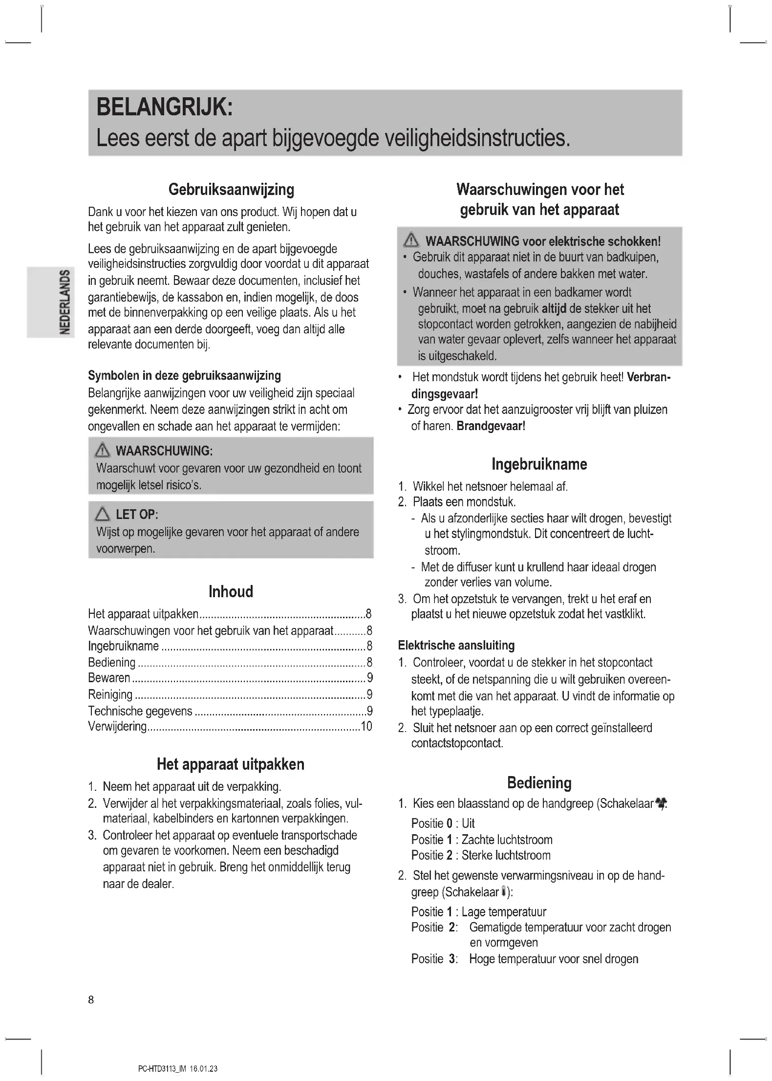Positie 1 : Lage temperatuur Positie 2 : Gematigde temperatuur voor zacht drogen en vormgeven Positie 3 : Hoge temperatuur voor snel drogenPC-HTD3113_IM 16.01.23