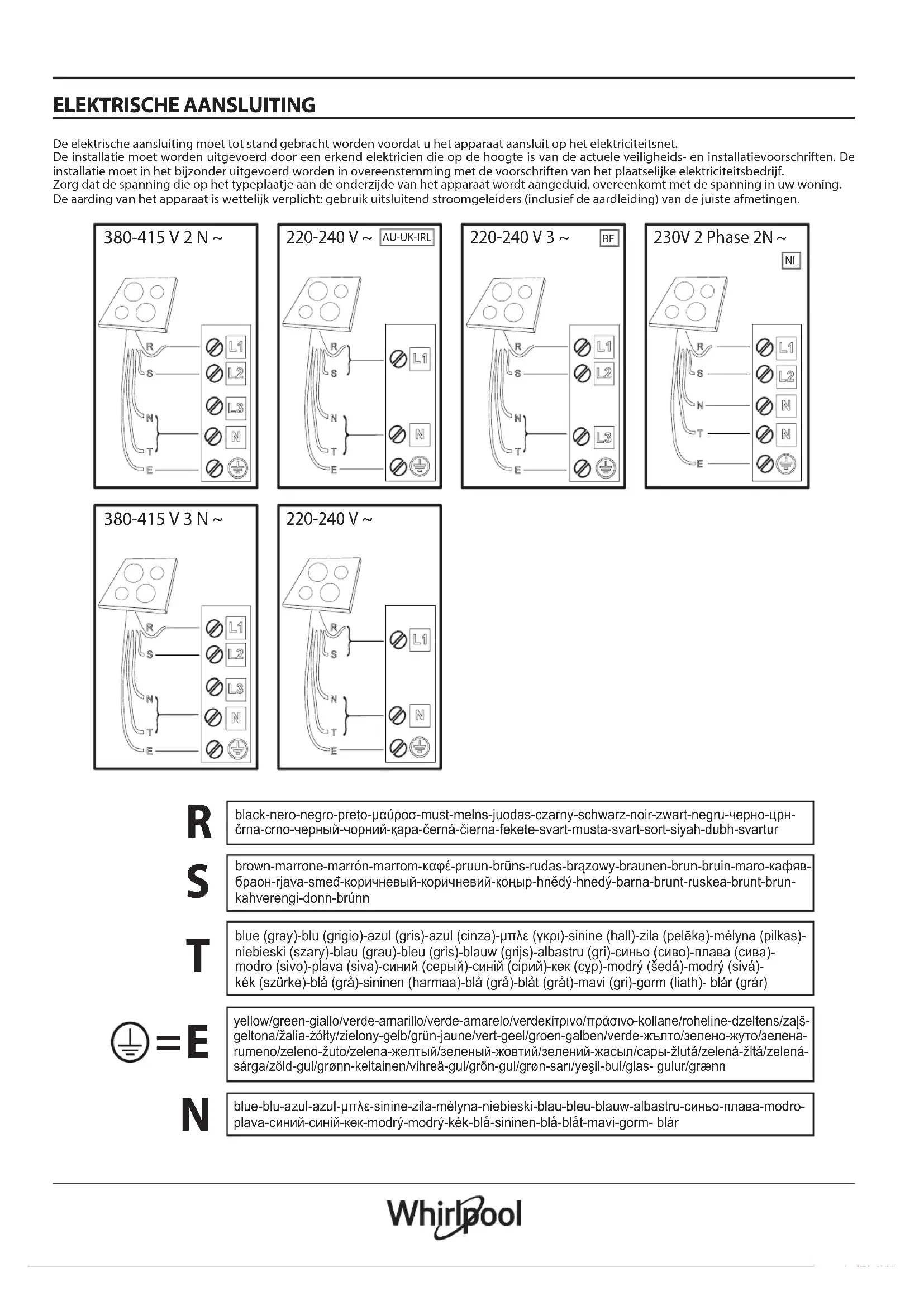 NLELEKTRISCHE AANSLUITING De elektrische aansluiting moet tot stand gebracht worden voordat u het apparaat aansluit op het elektriciteitsnet. De installatie moet worden uitgevoerd door een erkend elektricien die op de hoogte is van de actuele veiligheids- en installatievoorschriften. De installatie moet in het bijzonder uitgevoerd worden in overeenstemming met de voorschriften van het plaatselijke elektriciteitsbedrijf. Zorg dat de spanning die op het typeplaatje aan de onderzijde van het apparaat wordt aangeduid, overeenkomt met de spanning in uw woning. De aarding van het apparaat is wettelijk verplicht: gebruik uitsluitend stroomgeleiders (inclusief de aardleiding) van de juiste afmetingen. blue-blu-azul-azul-μπλε-sinine-zila-mėlyna-niebieski-blau-bleu-blauw-albastru-синьо-плава-modro- plava-синий-синій-көк-modrý-modrý-kék-blå-sininen-blå-blåt-mavi-gorm- blár
