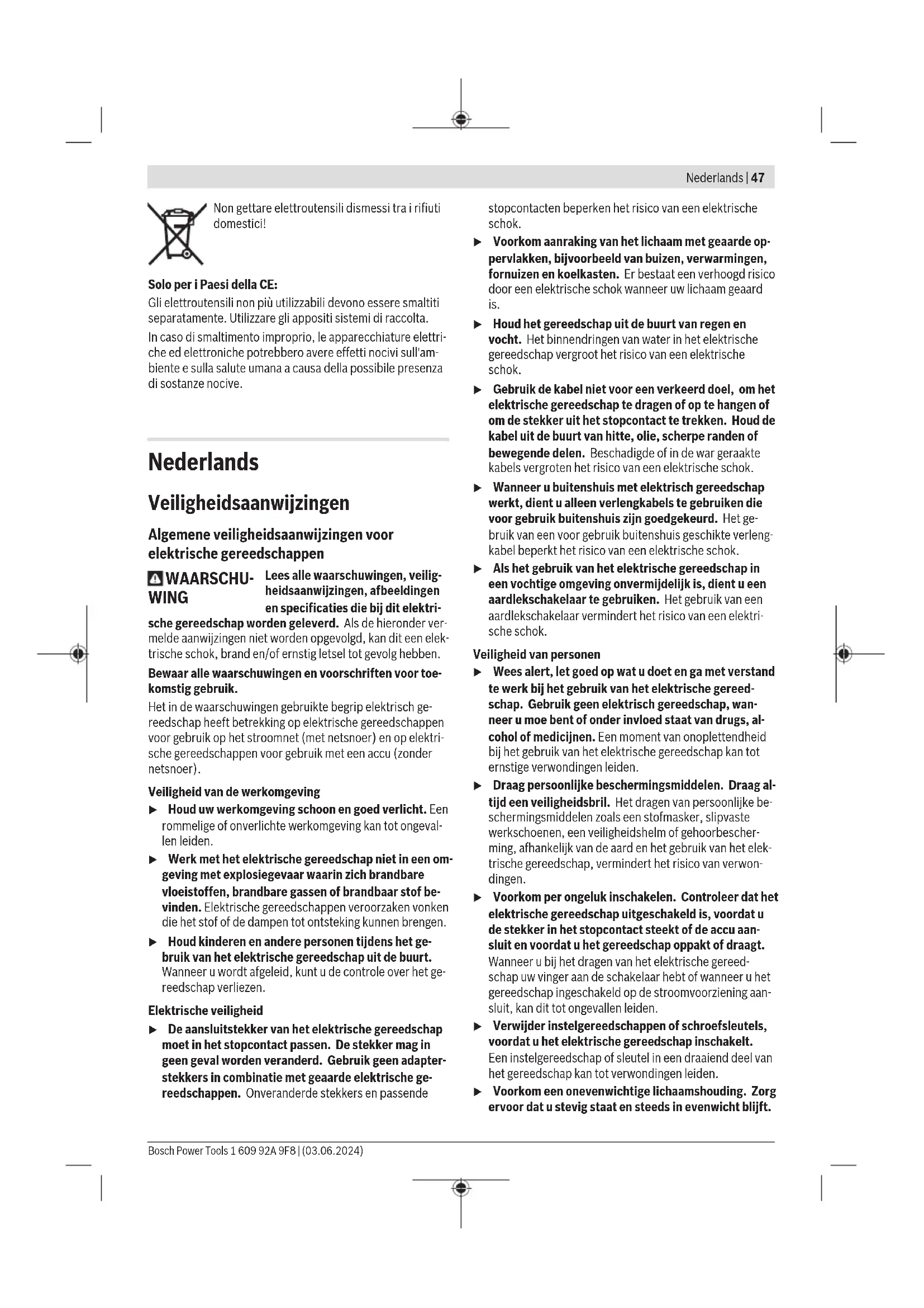 La marcatura di taglio a 0° (9) indica la posizione della lama in caso di tagli ad angolo retto. La marcatura di taglio a 45° (8) indica la posizione della lama in caso di tagli a 45°. Per eseguire un taglio dimensionalmente preciso, applicare la sega circolare sul pezzo in lavorazione come indicato nell’illustrazione. Si consiglia di eseguire dapprima un taglio di prova. Messa in funzione u Attenersi alla tensione di rete! La tensione riportata sul- la targhetta di identificazione dell’elettroutensile deve Bosch Power Tools 1 609 92A 9F8 | (03.06.2024)46 | Italiano corrispondere alla tensione della rete elettrica di alimen- tazione. Avvio/arresto Per la messa in funzione dell’elettroutensile, azionare dap- prima il dispositivo di blocco (2) e successivamente preme- re e l’interruttore di avvio/arresto (1) e tenerlo premuto. Per spegnere l’elettroutensile, rilasciare l’interruttore di av- vio/arresto (1). Avvertenza: Per ragioni di sicurezza, l’interruttore di avvio/ arresto (1) non può essere bloccato, ma deve invece restare costantemente premuto durante il funzionamento. Indicazioni operative u Prima di qualunque intervento sull’elettroutensile estrarre la spina di rete dalla presa. La larghezza di taglio varia in base al tipo di lama utilizzato. Proteggere le lame da urti e da colpi. Operare con l’elettroutensile spingendolo in modo uniforme in direzione di taglio ed esercitando una leggera pressione per ottenere una qualità di taglio ottimale. Un avanzamento eccessivo contribuisce a ridurre sensibilmente la durata de- gli utensili e può danneggiare l’elettroutensile. Eseguire lavori avanzando sempre in maniera uniforme e ac- certarsi che il numero di giri della lama resti costante. Evitare di aumentare la velocità di avanzamento (ades. quando si eseguono lavori su legno umido, legno da costruzione tratta- to a pressione o ramaglia) e la relativa diminuzione del nu- mero di giri, per evitare di surriscaldare i denti della lama. La prestazione di taglio e la qualità del taglio dipendono con- siderevolmente dallo stato e dalla forma dei denti della lama. Per questo motivo, utilizzare esclusivamente lame che siano taglienti e adatte al materiale in lavorazione. All’avvio o al proseguimento di un’operazione di taglio, cen- trare la lama nell’apposita fessura e accertarsi che i denti della lama non siano incastrati nel pezzo in lavorazione. In tal modo, si eviterà un contraccolpo o che la lama fuoriesca dal pezzo in lavorazione. Taglio del legno La corretta selezione della lama viene basata sul tipo di le- gno, sulla qualità del legno e sul fatto se i tagli richiesti deb- bano essere longitudinali oppure trasversali. Eseguendo tagli longitudinali nell’abete si producono trucioli lunghi ed a forma di spirale. La polvere di faggio e di quercia è particolarmente pericolo- sa per la salute, per questo si raccomanda di lavorare esclu- sivamente con un sistema di aspirazione della polvere. Taglio con guida parallela (vedi fig. D) La guida parallela (10) consente la realizzazione di tagli pre- cisi lungo il bordo del pezzo in lavorazione o il taglio di stri- sce identiche. Allentare la vite ad alette (7) e spingere la scala della guida parallela (10) nel basamento (12), attraverso la guida. Im- postare la larghezza di taglio desiderata come valore della scala sulla marcatura di taglio corrispondente (9) oppure (8), vedere il paragrafo “Marcature di taglio”. Serrare nuova- mente la vite ad alette (7). Taglio con battuta ausiliaria (vedi fig. E) Per la lavorazione di grossi pezzi, o per tagliare spigoli diritti, è possibile fissare al pezzo in lavorazione una tavola o un as- se che fungano da battuta ausiliaria e operare quindi spin- gendo la sega circolare con il pattino lungo la battuta ausilia- ria. Manutenzione ed assistenza Manutenzione e pulizia u Prima di qualunque intervento sull’elettroutensile estrarre la spina di rete dalla presa. u Per poter garantire buone e sicure operazioni di lavo- ro, tenere sempre pulite l’elettroutensile e le fessure di ventilazione. Se fosse necessaria una sostituzione della linea di collega- mento, questa dovrà essere eseguita da Bosch oppure da un centro assistenza clienti autorizzato per elettroutensili Bosch, al fine di evitare pericoli per la sicurezza. La cuffia oscillante di protezione deve poter sempre muover- si liberamente e deve poter chiudersi sempre autonoma- mente. Per questo motivo, tenere sempre pulito il campo in- torno alla cuffia di protezione oscillante. Rimuovere polvere e trucioli con un pennello. È possibile proteggere dalla corrosione le lame non rivestite applicando un sottile strato di olio esente da acidi. Per non macchiare il legno in lavorazione, prima di riutilizzare le lame sarà necessario pulirle bene dall’olio. Resti di resina oppure di colla sulla lama di taglio compro- mettono la qualità del taglio. Per questo motivo pulire sem- pre le lame subito dopo l’utilizzo. Servizio di assistenza e consulenza tecnica Il servizio di assistenza risponde alle Vostre domande relati- ve alla riparazione e alla manutenzione del Vostro prodotto nonché concernenti i pezzi di ricambio. Disegni in vista esplosa e informazioni relative ai pezzi di ricambio sono con- sultabili anche sul sito www.bosch-pt.com Il team di consulenza tecnica Bosch sarà lieto di rispondere alle Vostre domande in merito ai nostri prodotti e accessori. In caso di richieste o di ordinazione di pezzi di ricambio, co- municare sempre il codice prodotto a 10cifre riportato sulla targhetta di fabbricazione dell’elettroutensile. Italia Tel.: (02) 3696 2314 E-Mail: pt.hotlinebosch@it.bosch.com Per ulteriori indirizzi del servizio assistenza consultare: www.bosch-pt.com/serviceaddresses Smaltimento Avviare ad un riciclaggio rispettoso dell’ambiente gli imbal- laggi, gli elettroutensili e gli accessori dismessi. 1 609 92A 9F8 | (03.06.2024) Bosch Power ToolsNederlands | 47 Non gettare elettroutensili dismessi tra i rifiu