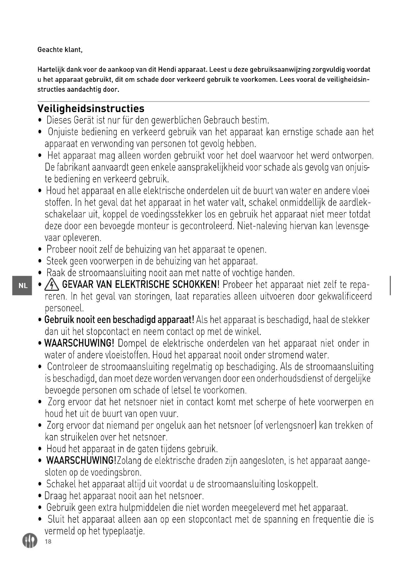 Geachte klant, Hartelijk dank voor de aankoop van dit Hendi apparaat. Leest u deze gebruiksaanwijzing zorgvuldig voordat u het apparaat gebruikt, dit om schade door verkeerd gebruik te voorkomen. Lees vooral de veiligheidsin- structies aandachtig door. Veiligheidsinstructies