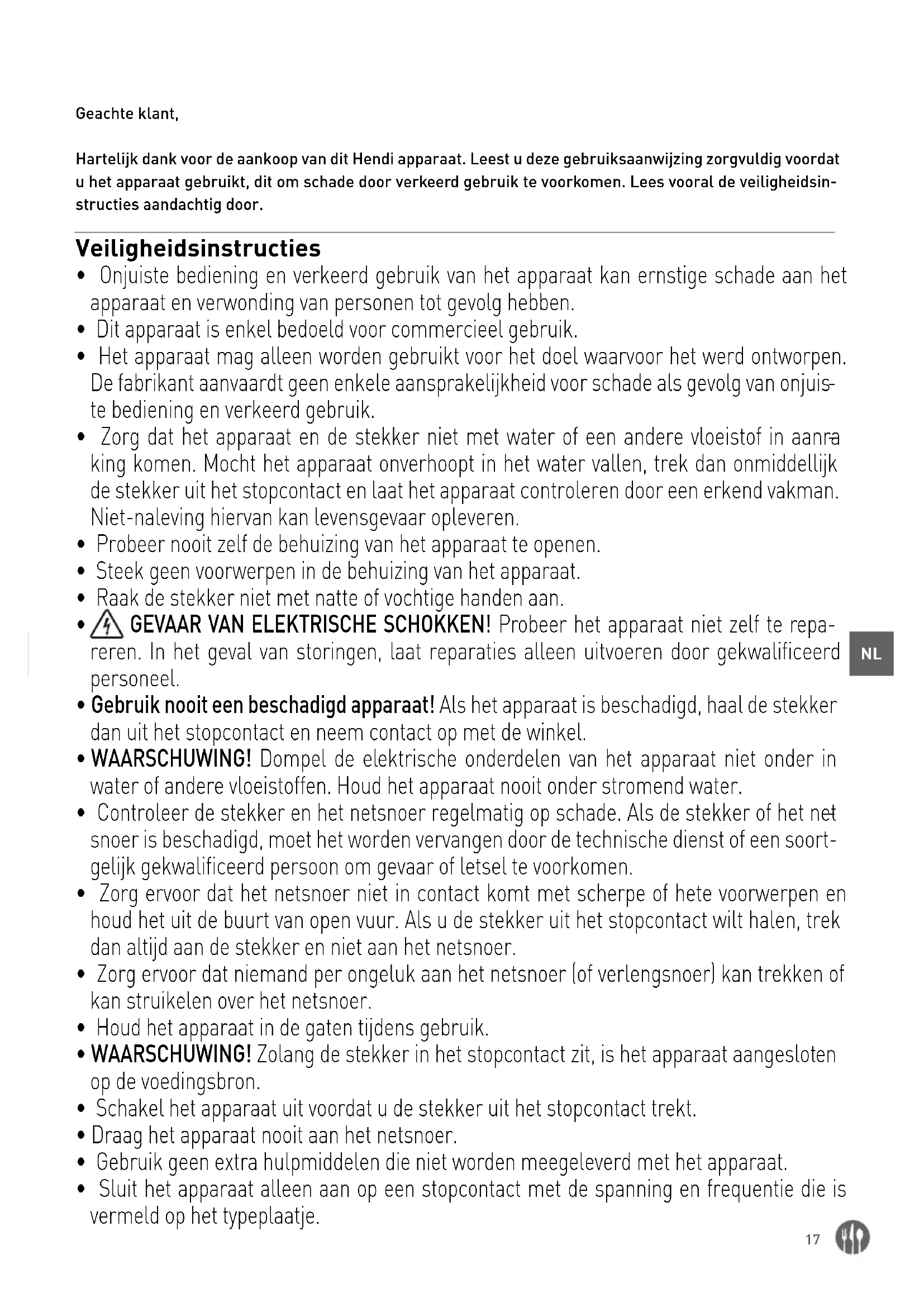 Geachte klant, Hartelijk dank voor de aankoop van dit Hendi apparaat. Leest u deze gebruiksaanwijzing zorgvuldig voordat u het apparaat gebruikt, dit om schade door verkeerd gebruik te voorkomen. Lees vooral de veiligheidsin- structies aandachtig door. Veiligheidsinstructies