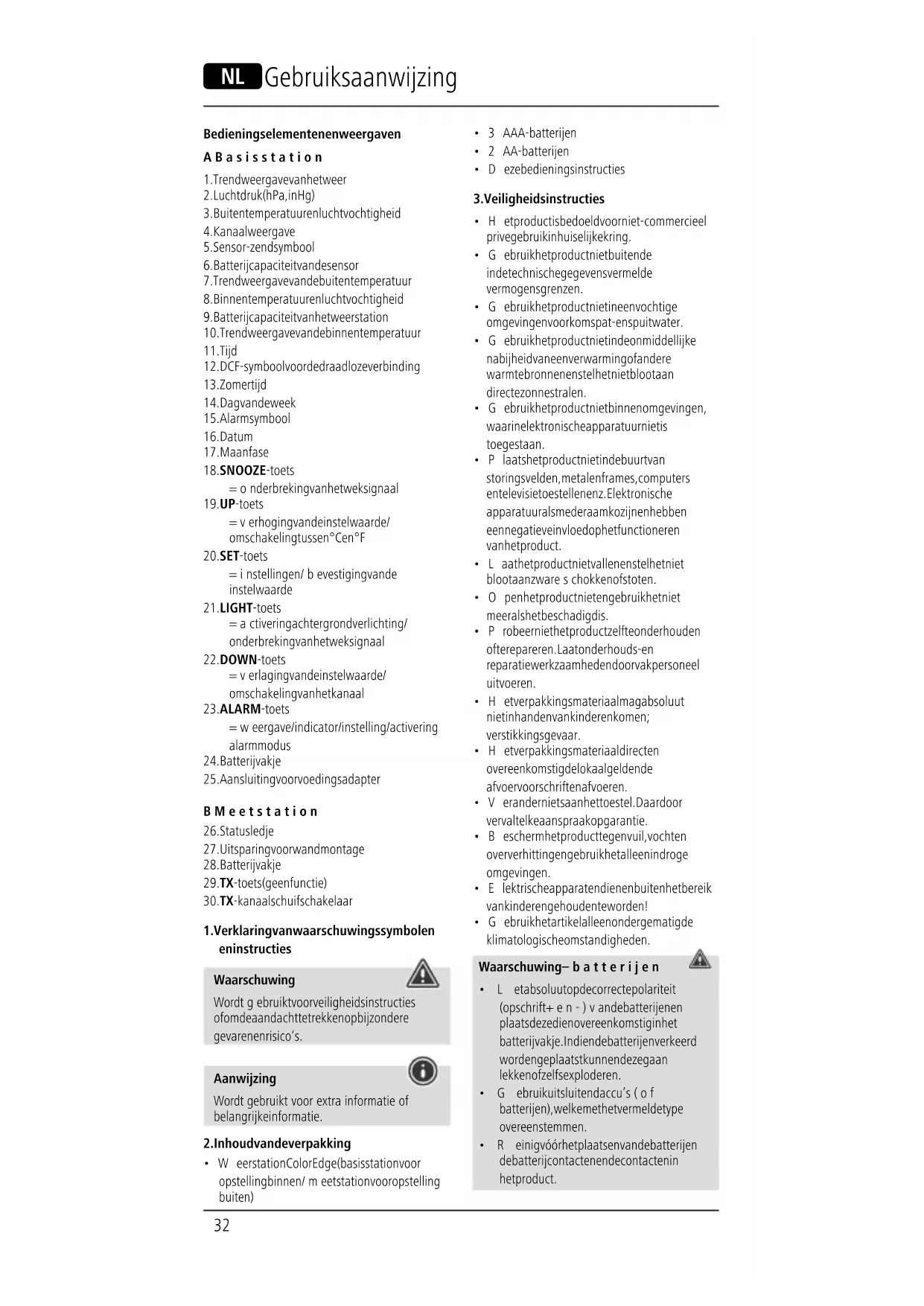 - Gebruik het artikel alleen onder gematigde klimatologische omstandigheden. Waarschuwing –batterijen