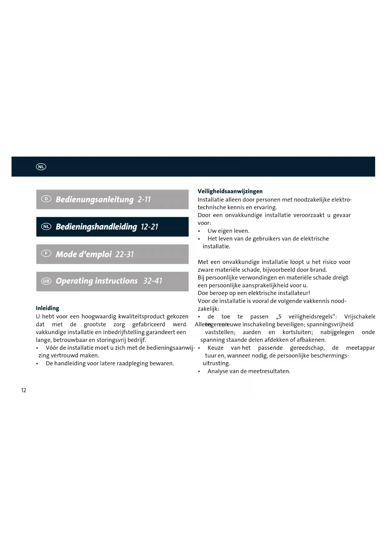 - Hetlevenvandegebruikersvandeelektrische installatie. Met een onvakkundige installatie loopt u het risico voor zwaremateriëleschade,bijvoorbeelddoorbrand. Bijpersoonlijkeverwondingenenmateriëleschadedreigt eenpersoonlijkeaansprakelijkheidvooru. Doe beroep op een elektrische installateur! Voordeinstallatieisvooraldevolgendevakkennisnood- zakelijk: