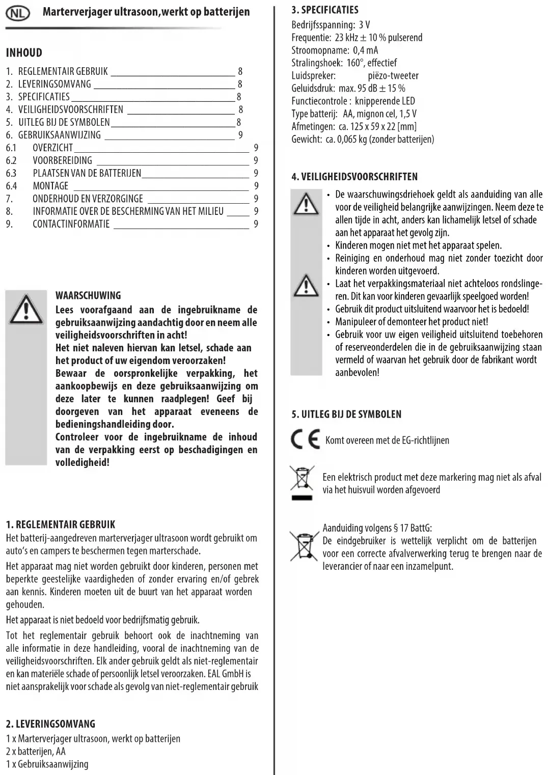 Komt overeen met de EG-richtlijnen Een elektrisch product met deze markering mag niet als afval via het huisvuil worden afgevoerd INHOUD Marterverjager ultrasoon,werkt op batterijen Aanduiding volgens § 17 BattG: De eindgebruiker is wettelijk verplicht om de batterijen voor een correcte afvalverwerking terug te brengen naar de leverancier of naar een inzamelpunt. WAARSCHUWING Lees voorafgaand aan de ingebruikname de gebruiksaanwijzing aandachtig door en neem alle veiligheidsvoorschriften in acht! Het niet naleven hiervan kan letsel, schade aan het product of uw eigendom veroorzaken! Bewaar de oorspronkelijke verpakking, het aankoopbewijs en deze gebruiksaanwijzing om deze later te kunnen raadplegen! Geef bij doorgeven van het apparaat eveneens de bedieningshandleiding door. Controleer voor de ingebruikname de inhoud van de verpakking eerst op beschadigingen en volledigheid!9