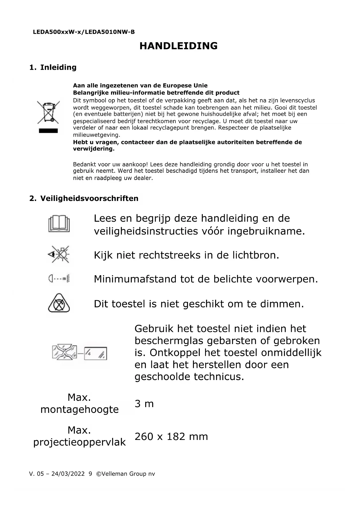 Velleman Group nv heeft het auteursrecht voor deze handleiding. Alle wereldwijde rechten voorbehouden. Het is niet toegestaan om deze handleiding of gedeelten ervan over te nemen, te kopiëren, te vertalen, te bewerken en op te slaan op een elektronisch medium zonder voorafgaande schriftelijke toestemming van de rechthebbende.LEDA500xxW-x/LEDA5010NW-B
